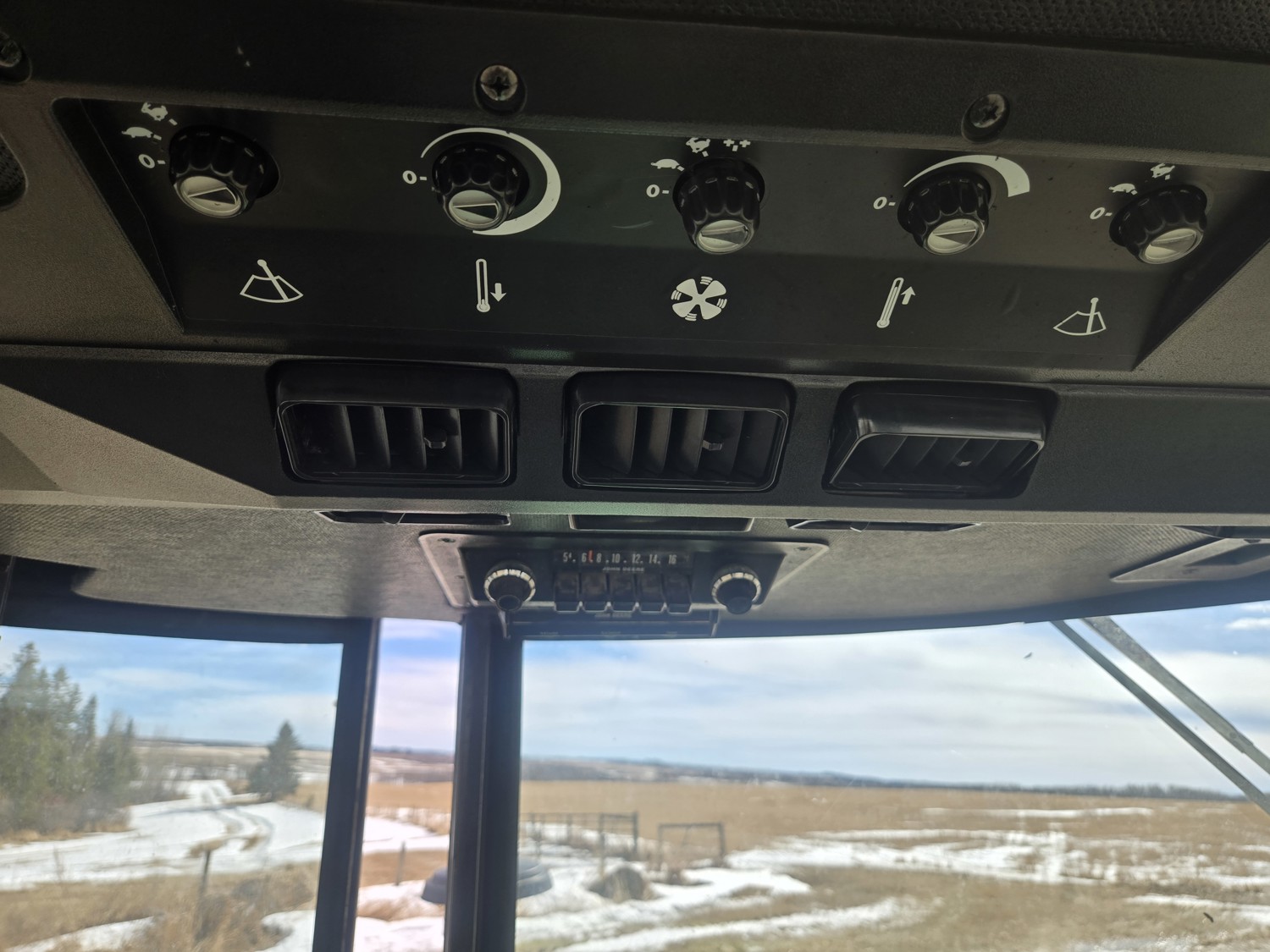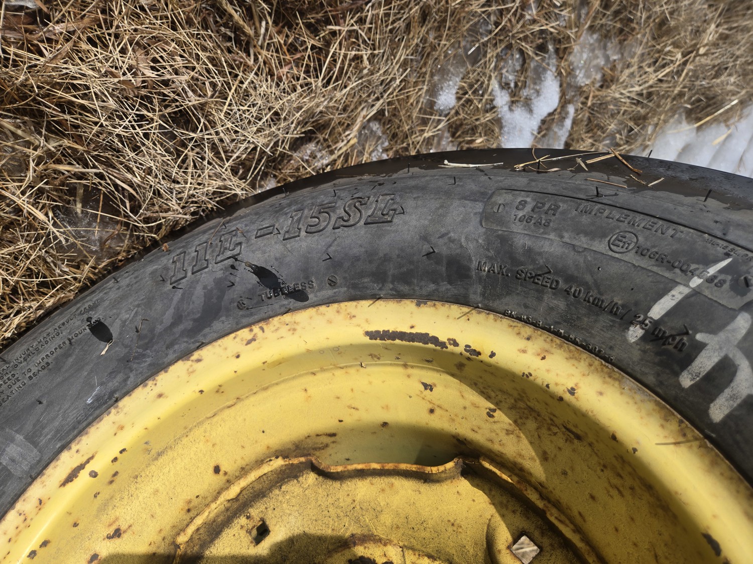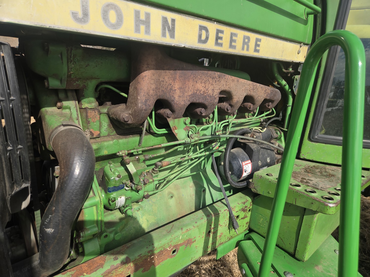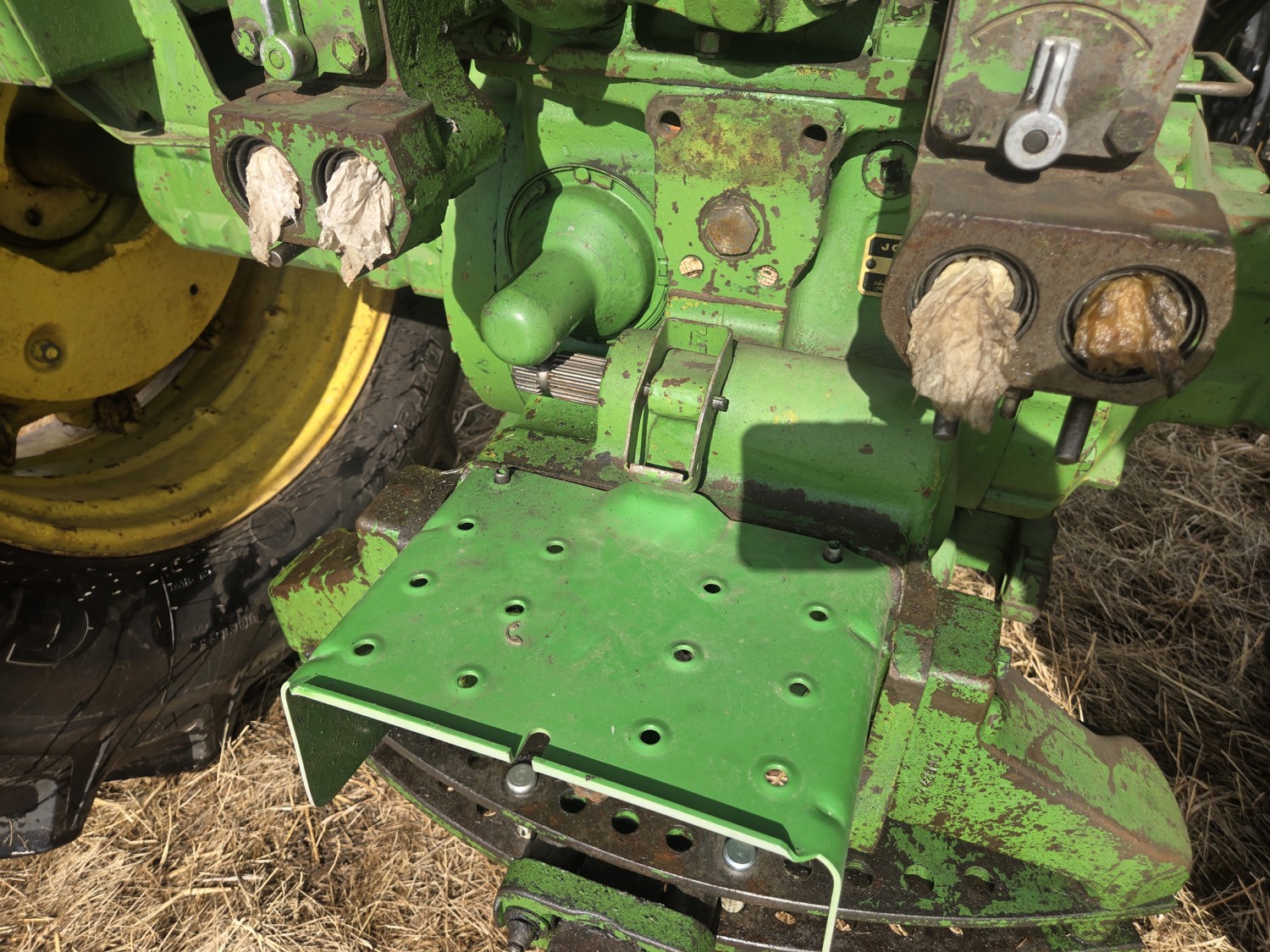 John Deere 5.4 L 6 cylinder diesel engine, 80 PTO HP, 8 speed manual transmission, cab, rear differential lock, radio, 540/1000 PTO, 2 rear hydraulic outlets, rear wheel weights, 11L-15 front tires, 540/75R34 rear tires