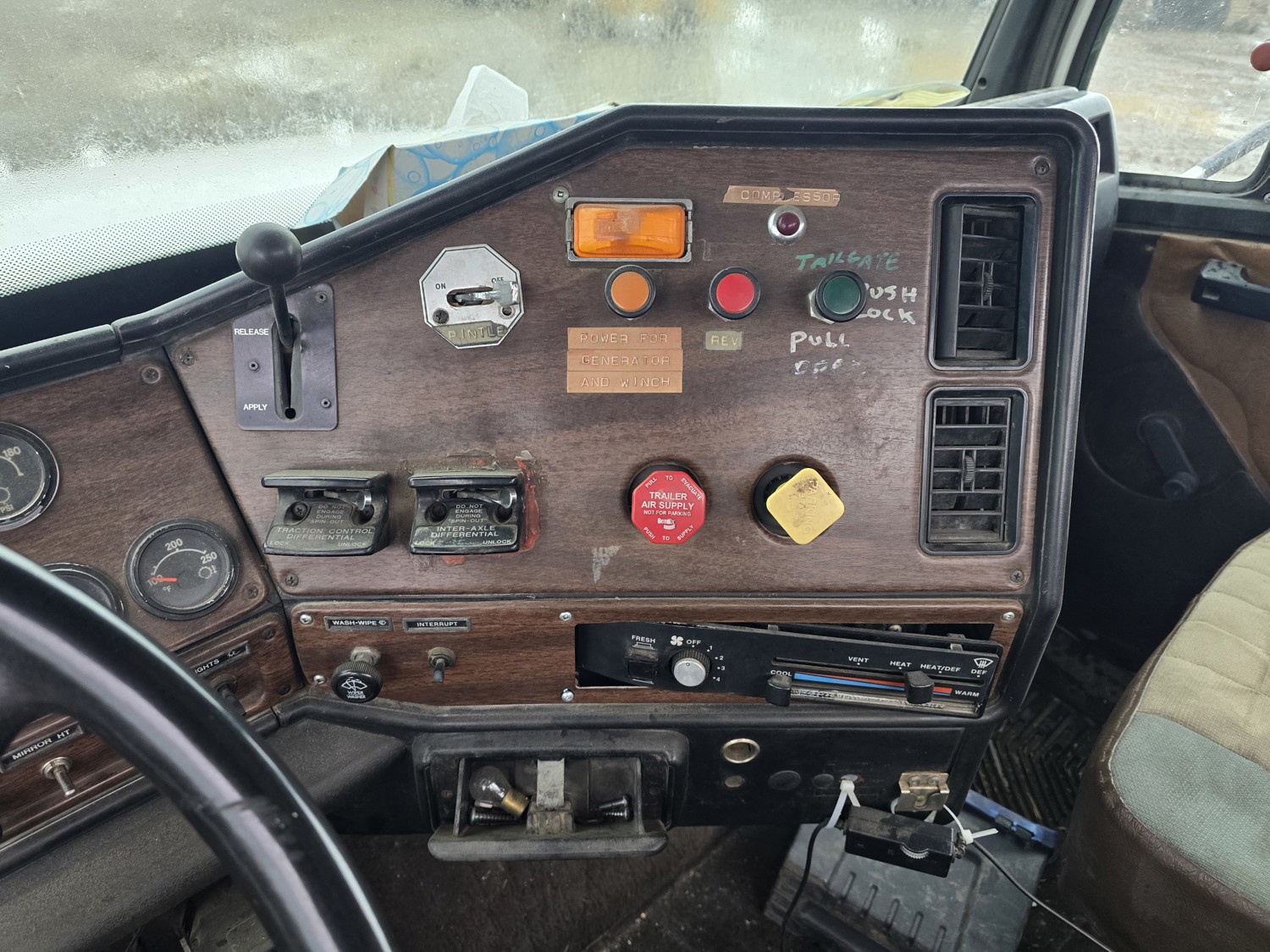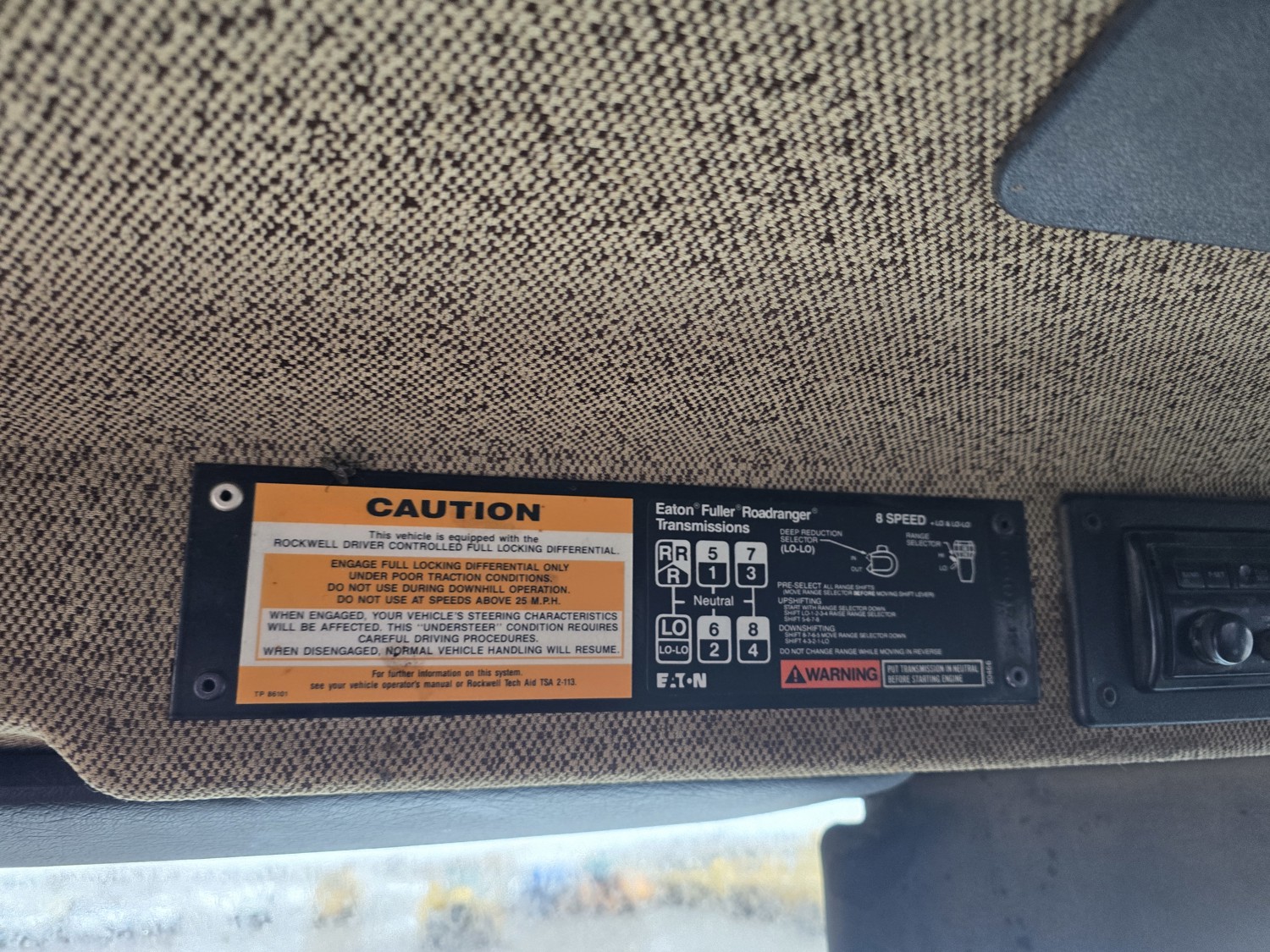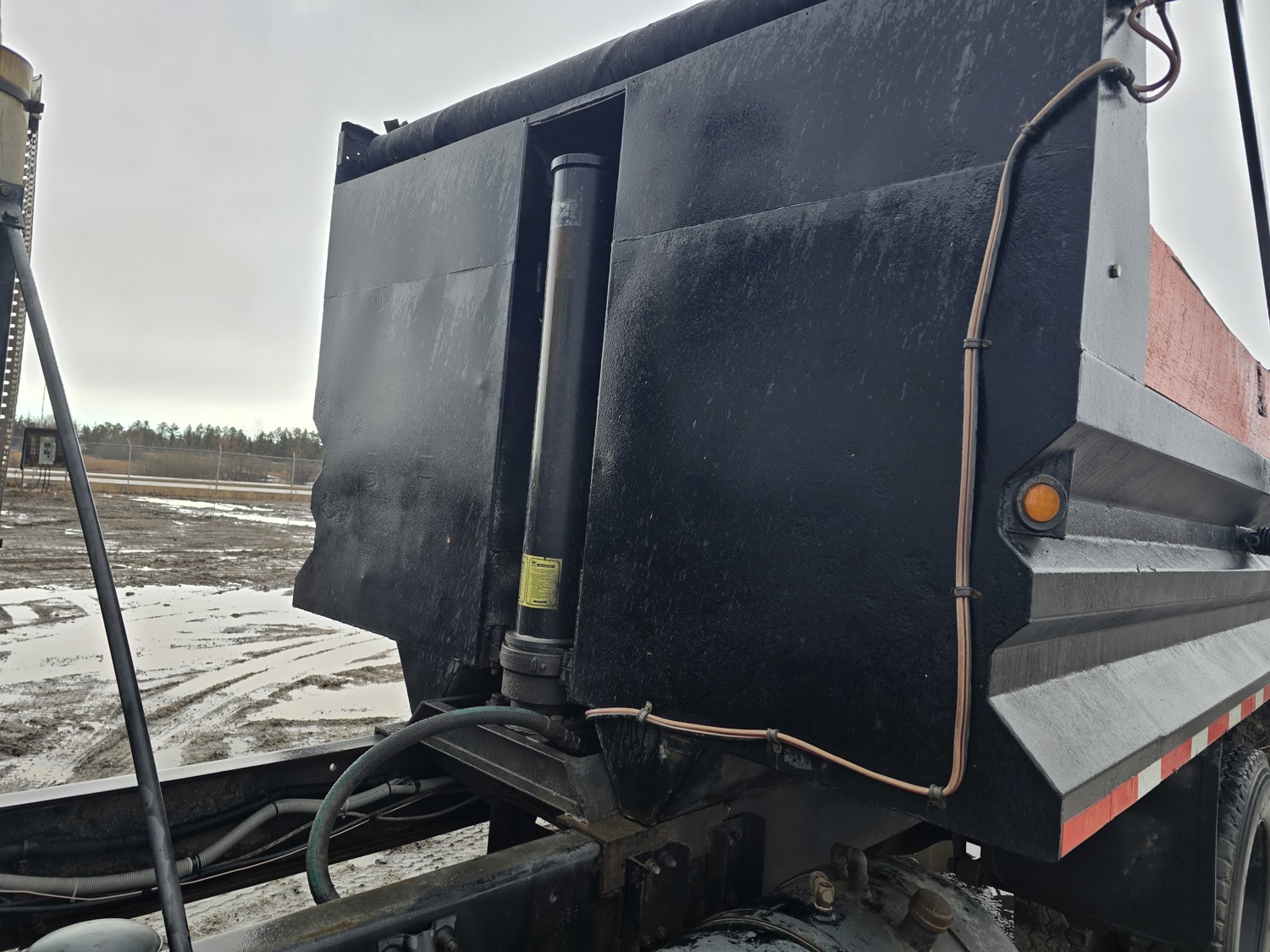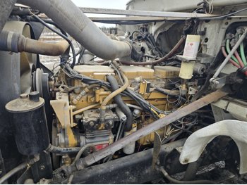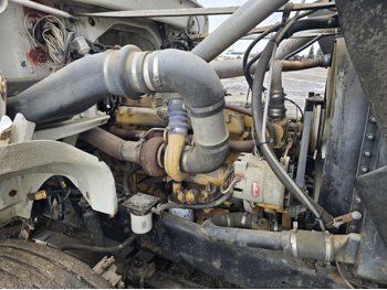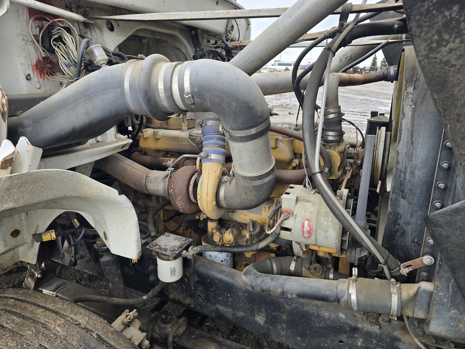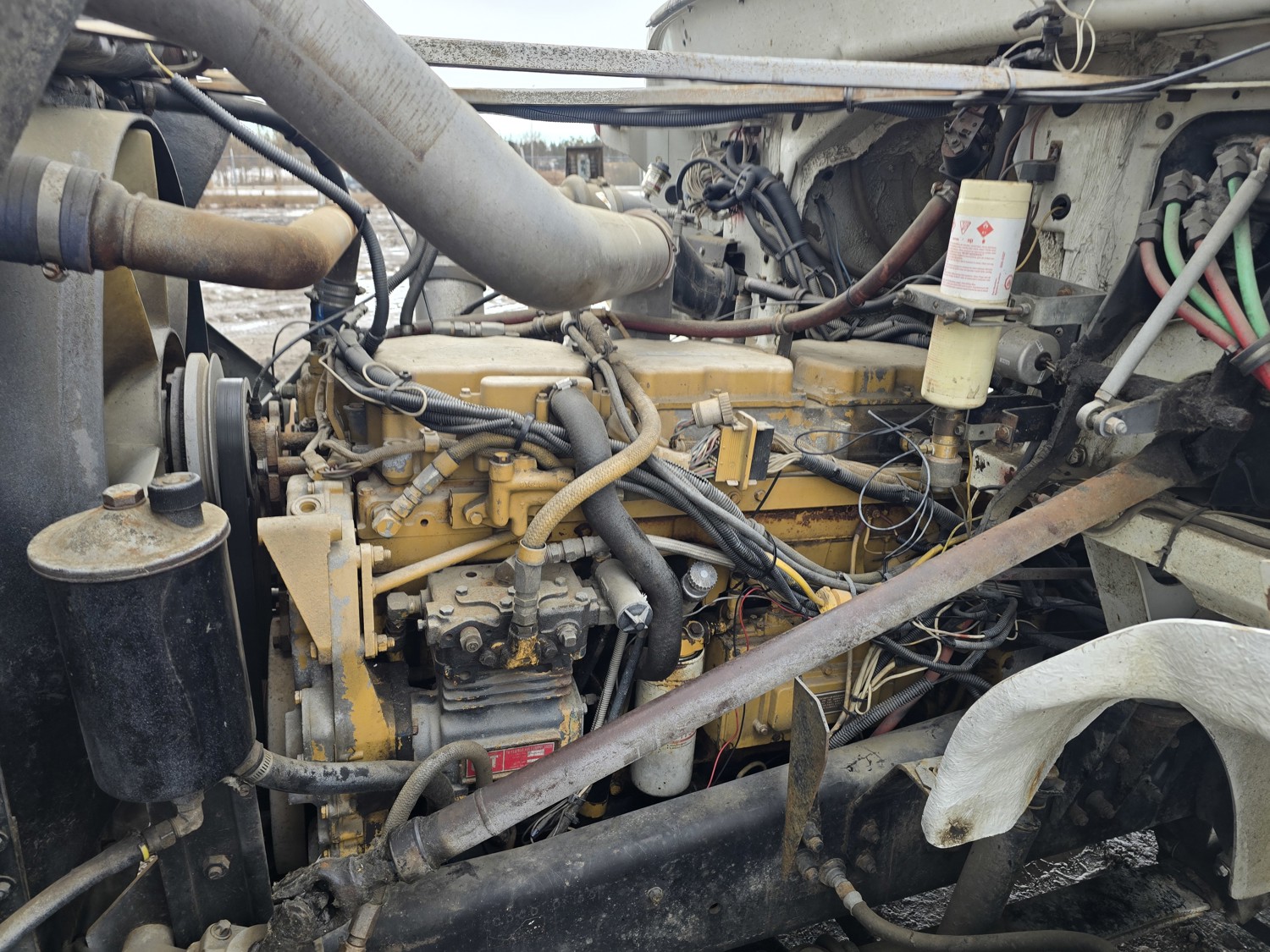 Caterpillar C-12 14.6 L 6 cylinder diesel engine, engine block heater, Eaton Fuller 8-LL 8 speed manual transmission, cruise control, radio, 15 ft box, electric tarp, trailer air supply valve, PTO pump, spring suspension, 12,000 lb front axle, 40,000 lb rear axles, diff lock, 228 inch WB, 11R22.5 tires
