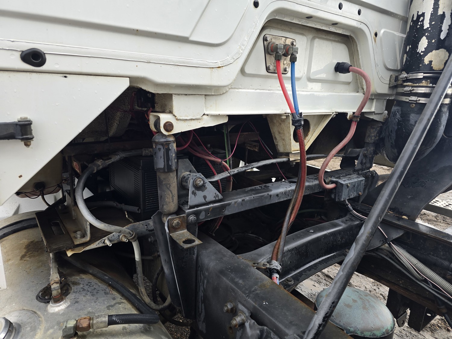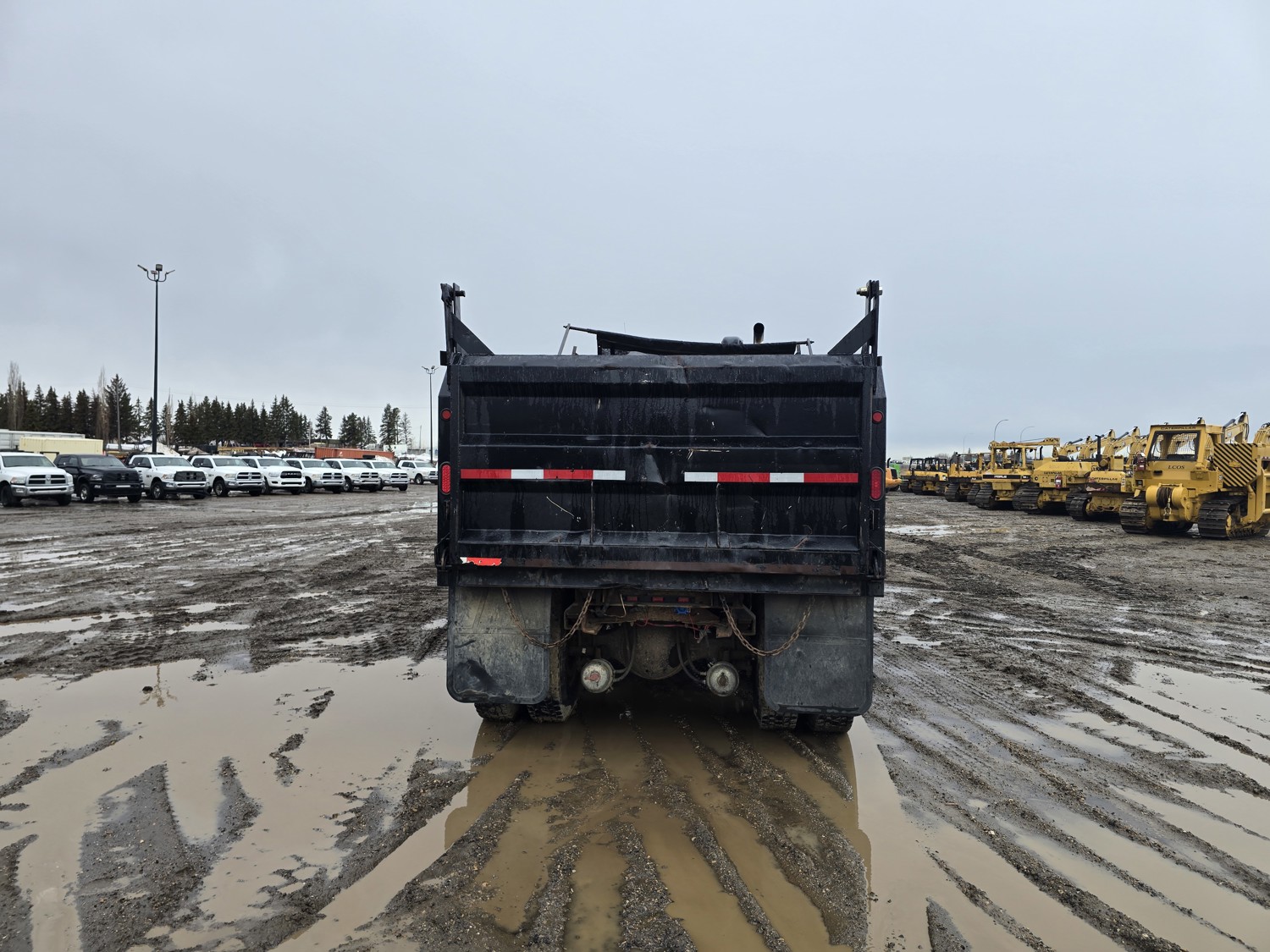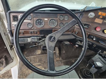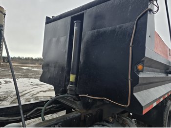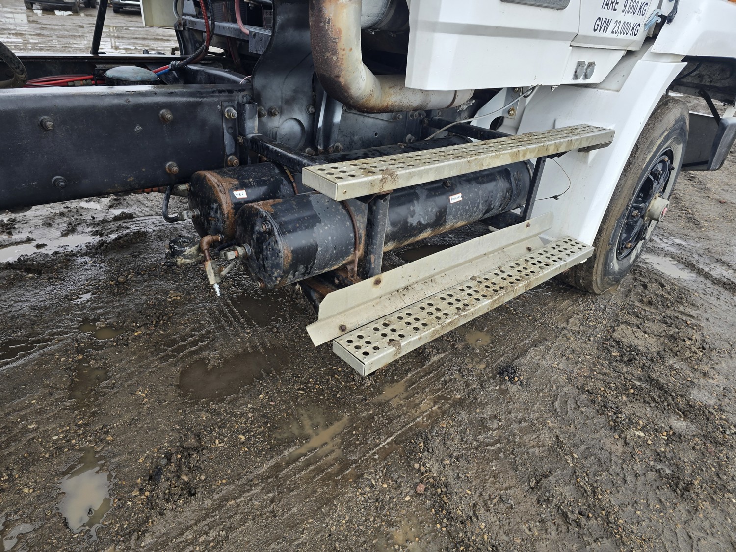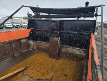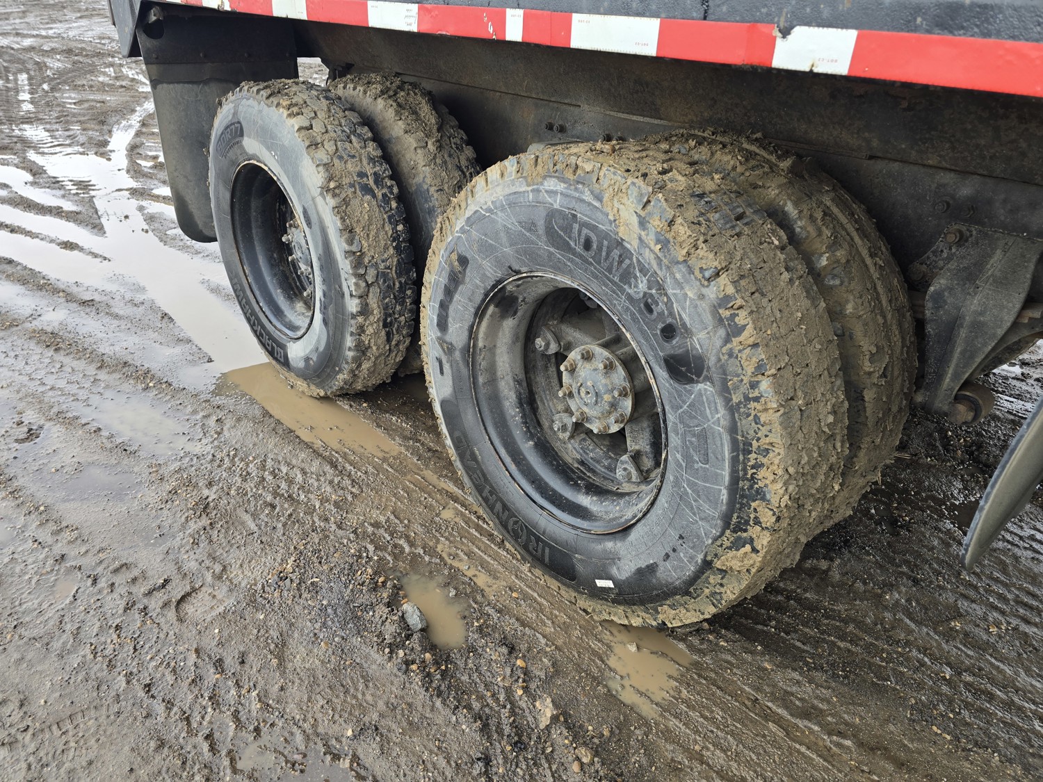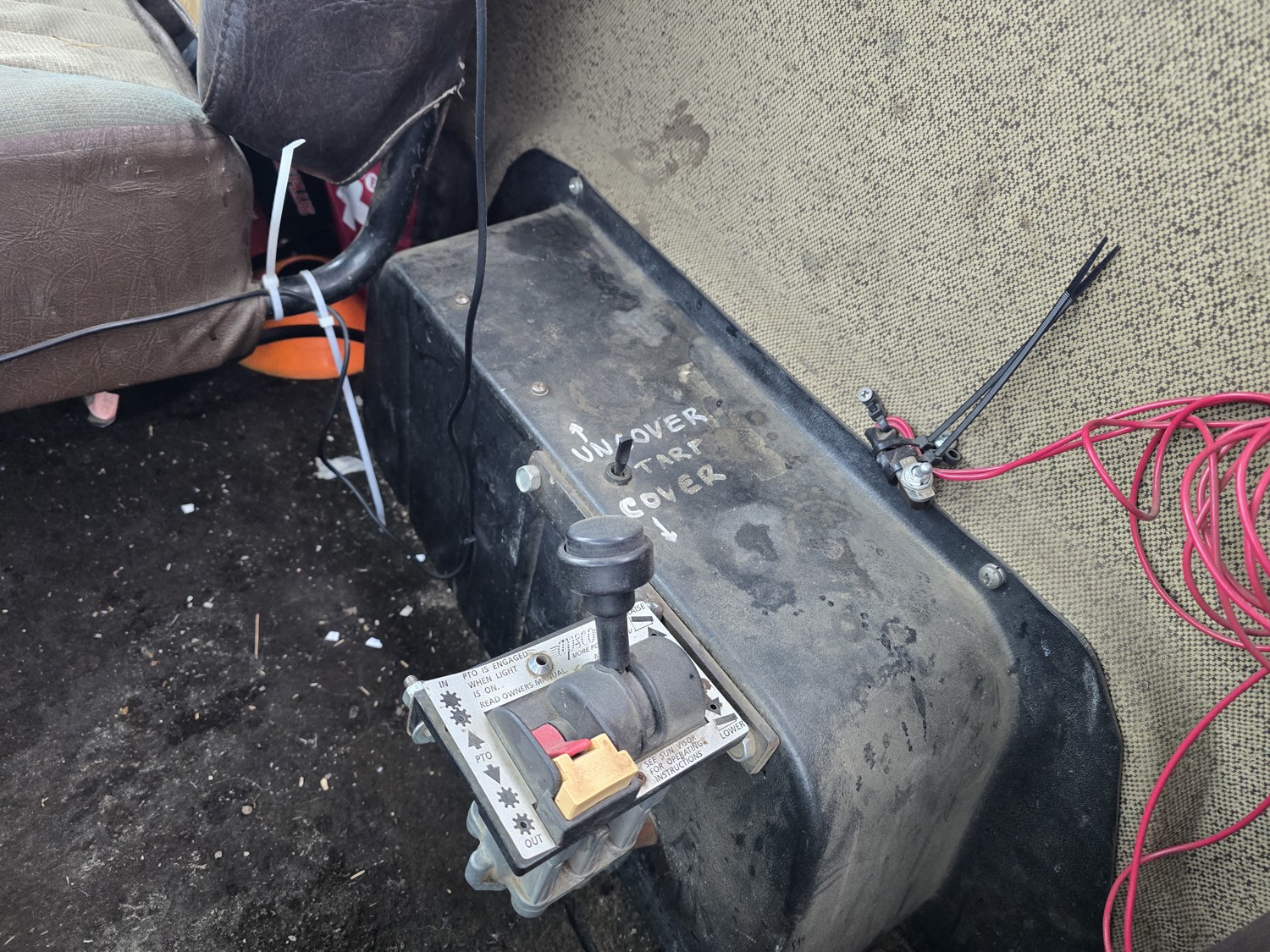 Caterpillar C-12 14.6 L 6 cylinder diesel engine, engine block heater, Eaton Fuller 8-LL 8 speed manual transmission, cruise control, radio, 15 ft box, electric tarp, trailer air supply valve, PTO pump, spring suspension, 12,000 lb front axle, 40,000 lb rear axles, diff lock, 228 inch WB, 11R22.5 tires