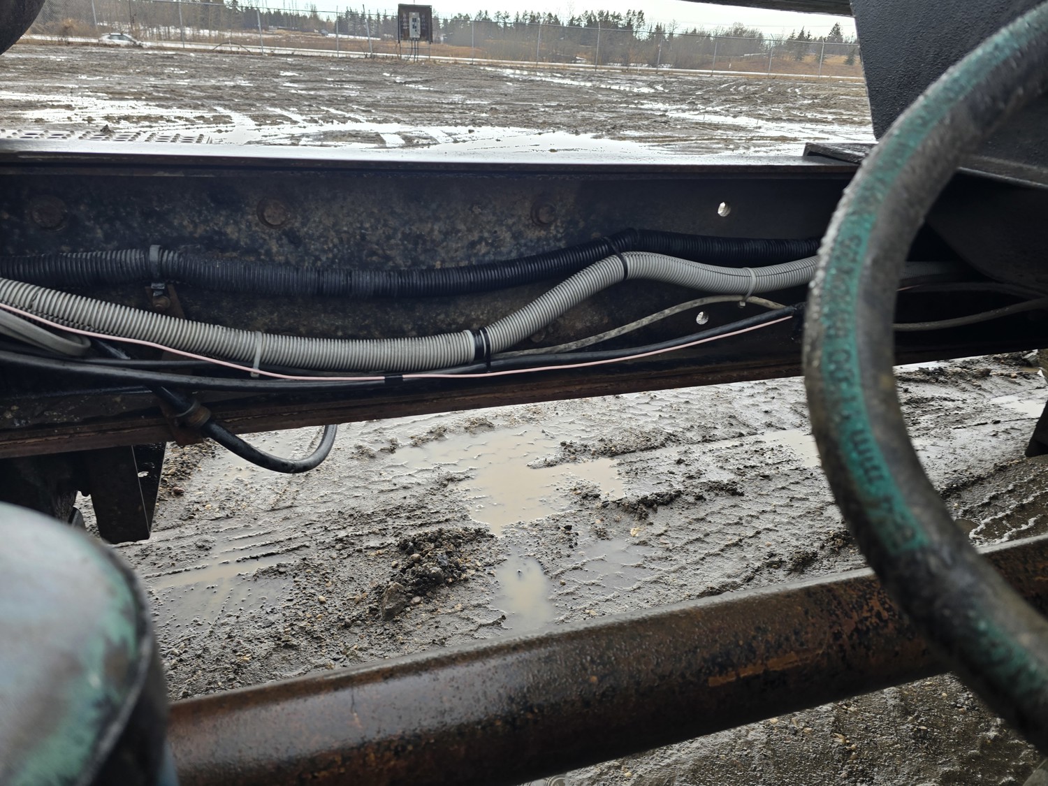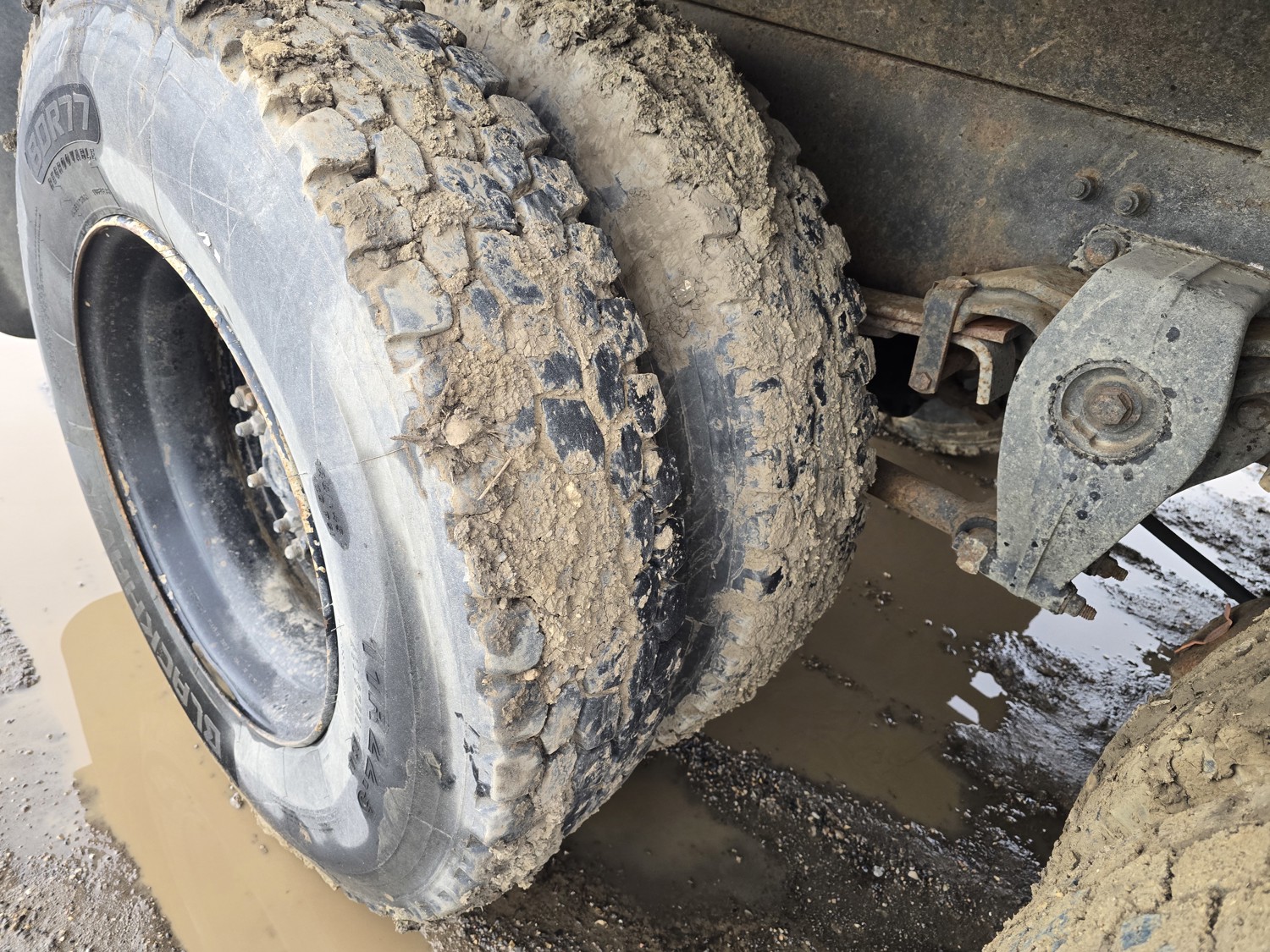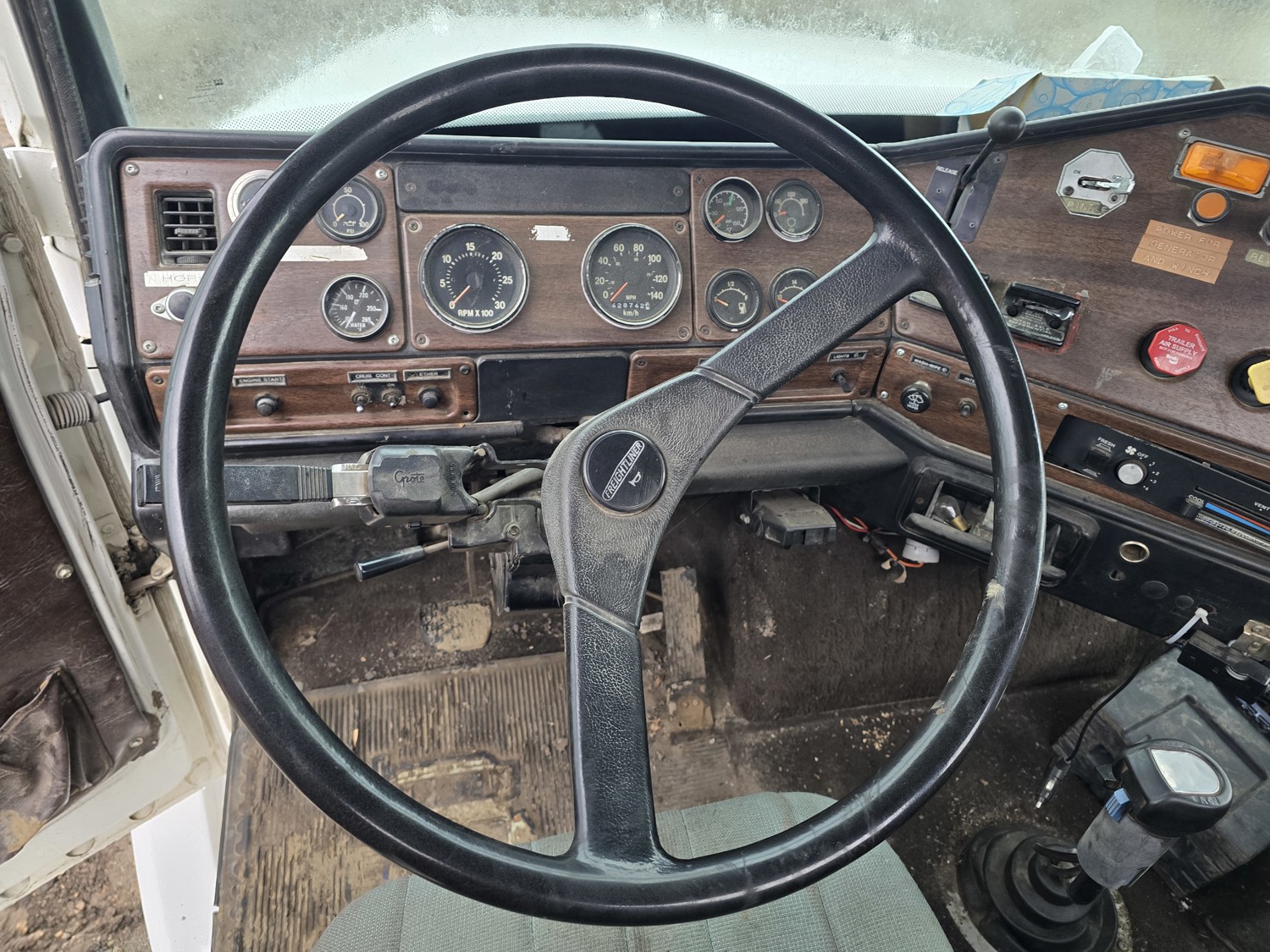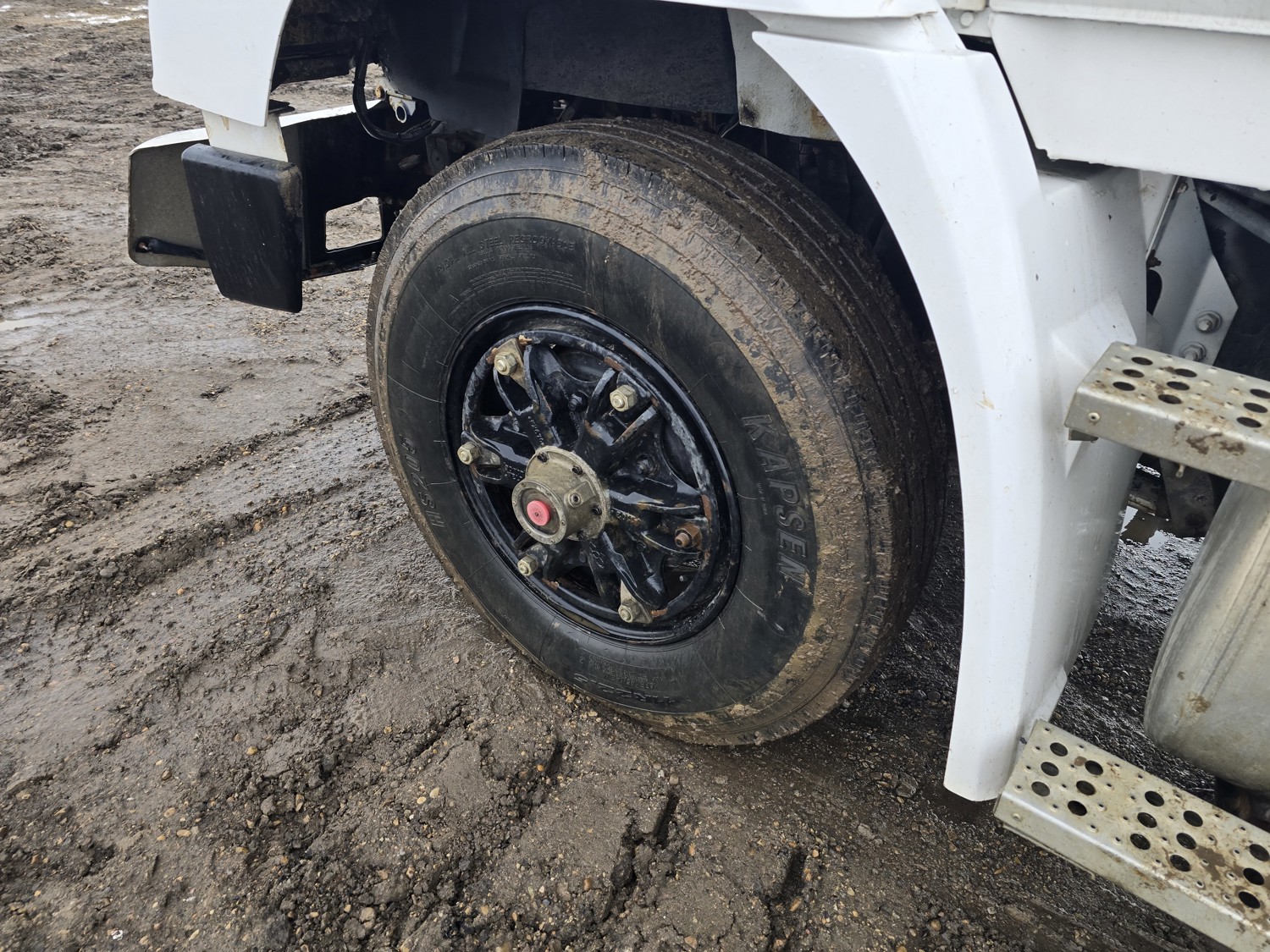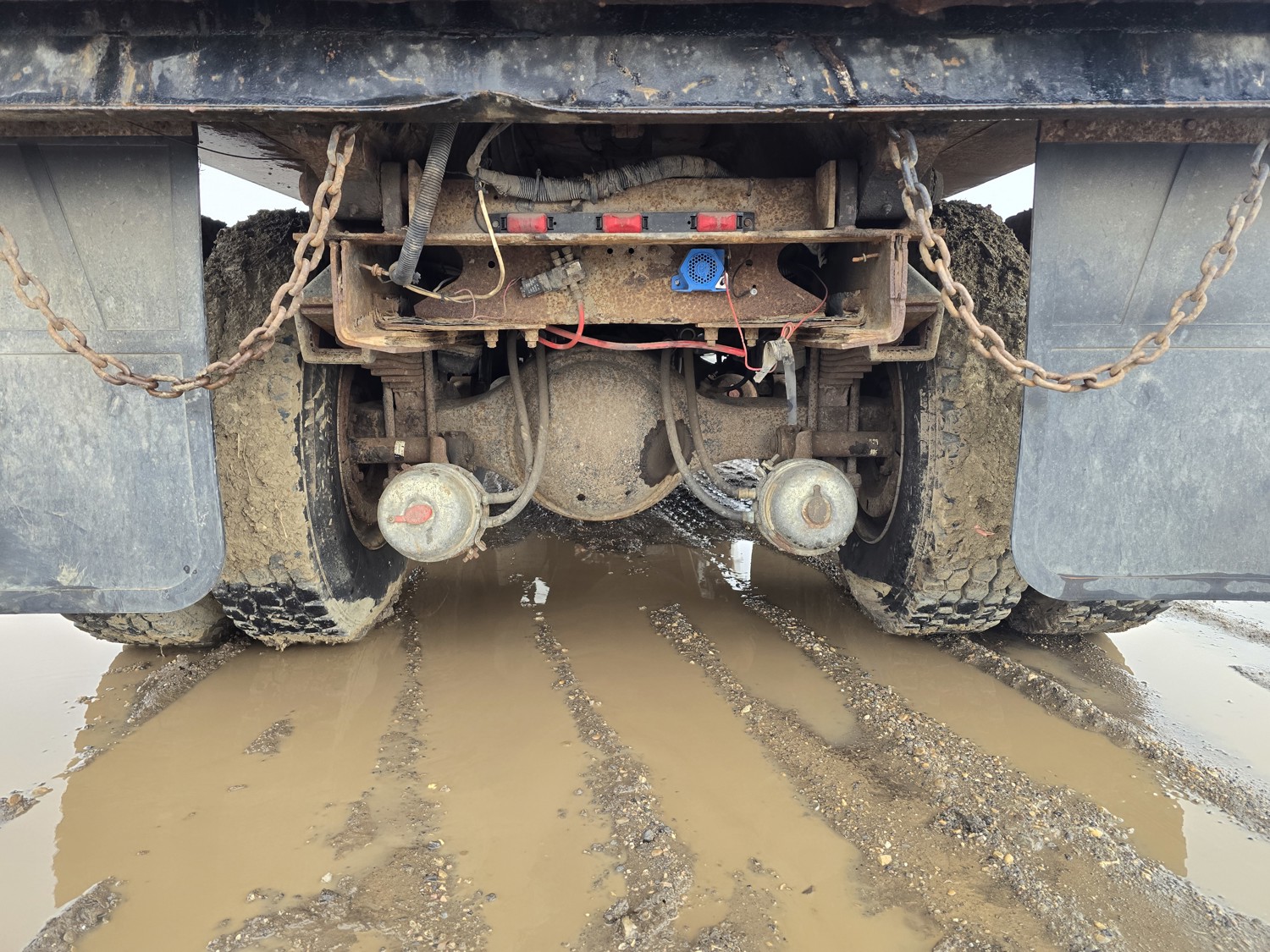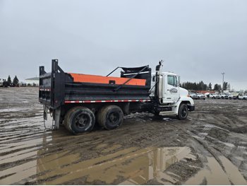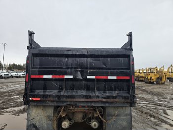 Caterpillar C-12 14.6 L 6 cylinder diesel engine, engine block heater, Eaton Fuller 8-LL 8 speed manual transmission, cruise control, radio, 15 ft box, electric tarp, trailer air supply valve, PTO pump, spring suspension, 12,000 lb front axle, 40,000 lb rear axles, diff lock, 228 inch WB, 11R22.5 tires