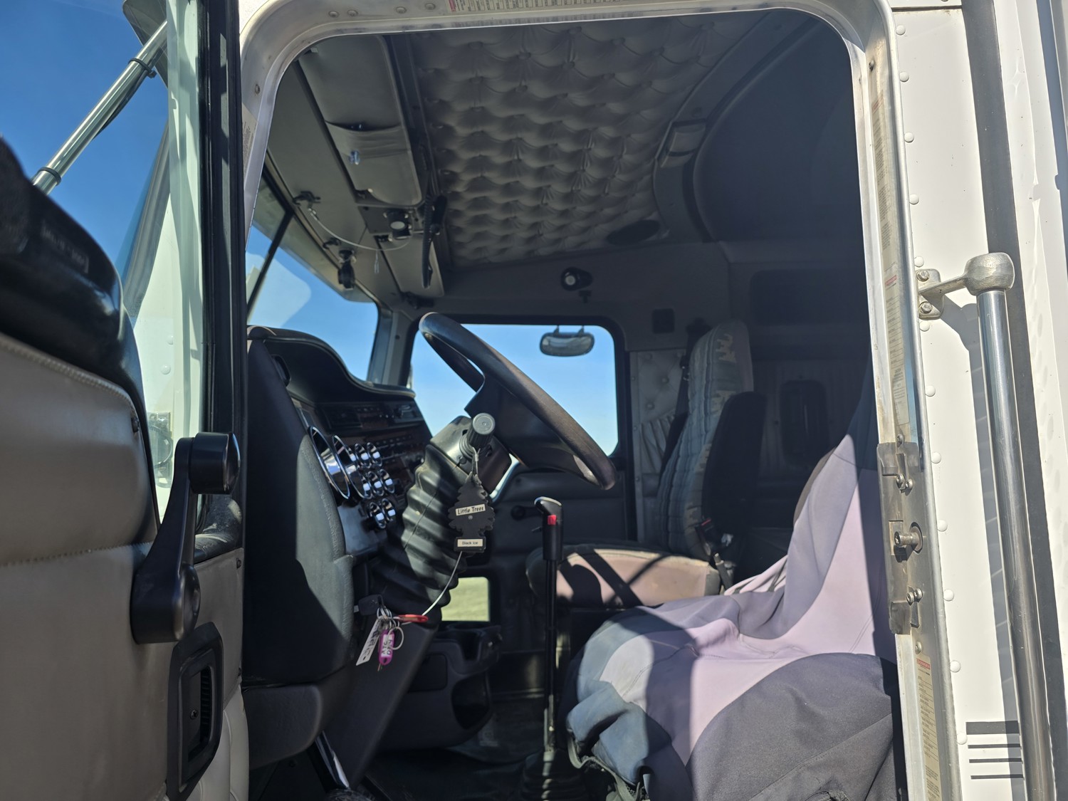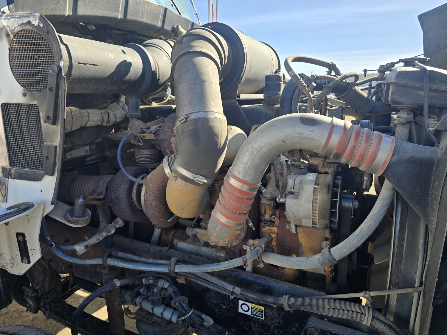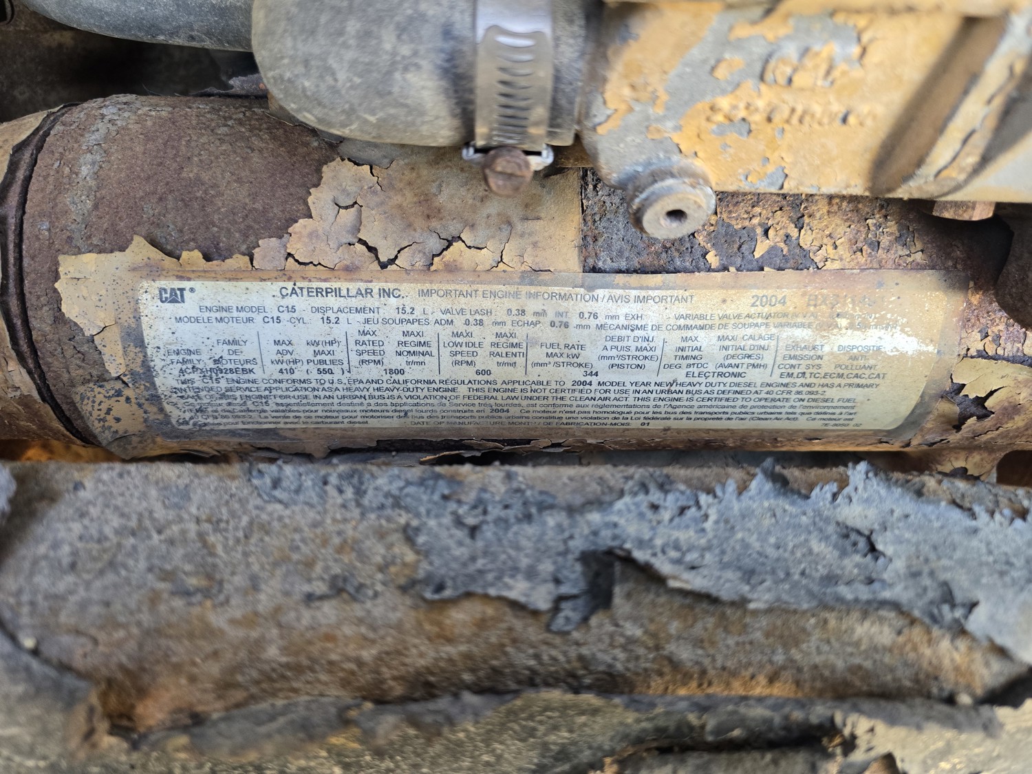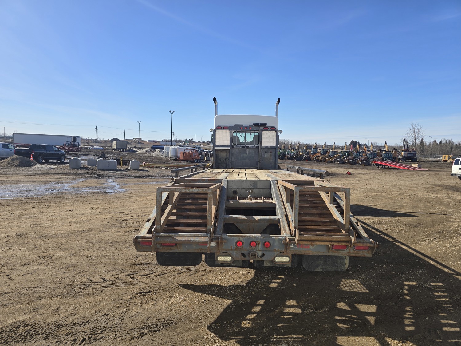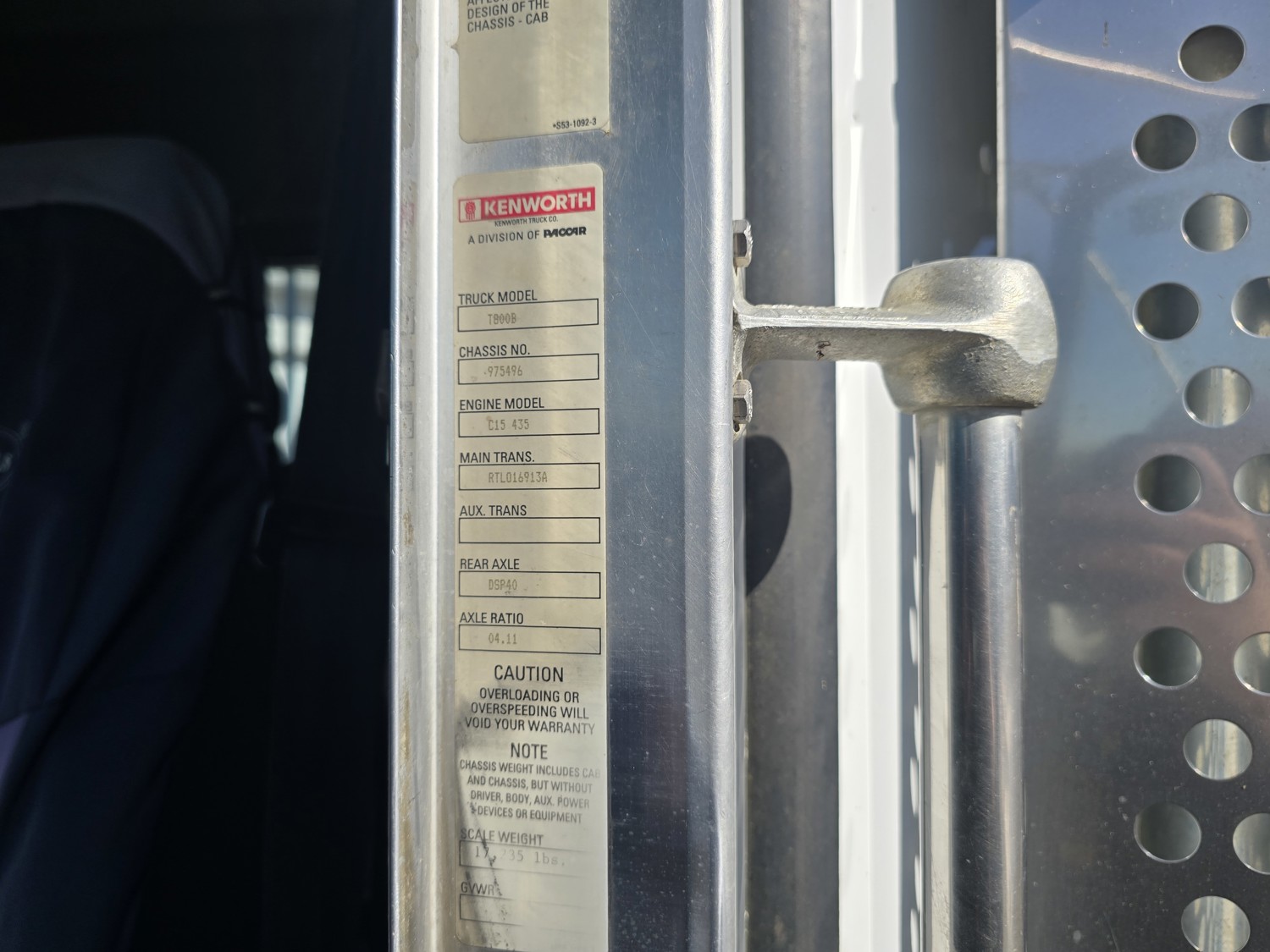 Caterpillar C15 15.2 L 6 cylinder 435 HP diesel engine, Webasto engine heater, engine brake, engine block heater, positive air shutoff, Eaton Fuller RTLO-16913A 13 speed manual transmission, mid rise 38 inch sleeper, A/C, cruise control, air ride driver seat, steel headache rack, aluminum tool boxes, 102 inch x 19 ft deck, chain holders, 72 inch dovetail, 62 inch manual ramps, 2-5/16 rear ball hitch for a goose neck trailer, front air assist suspension, Airglide air ride suspension, 13,200 lb front axle, 40,000 lb rear axles, 3 way diff locks, 4.11:1 ratio, 275 inch WB, all aluminum wheels, 11R24.5 tires