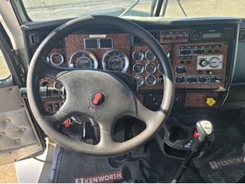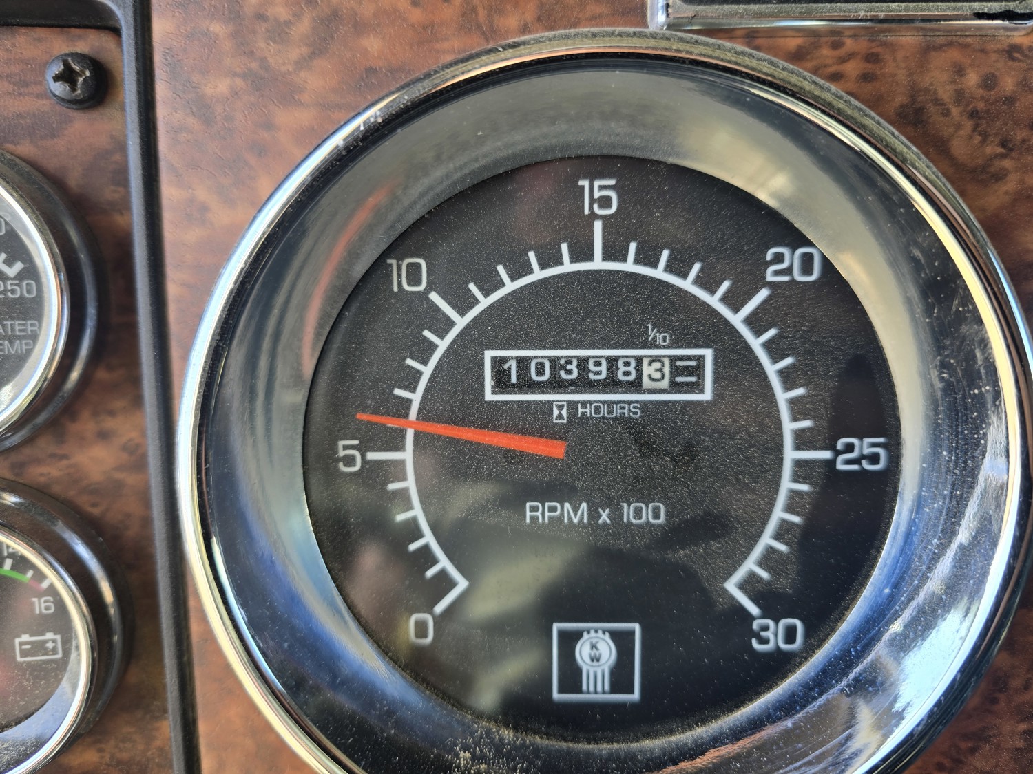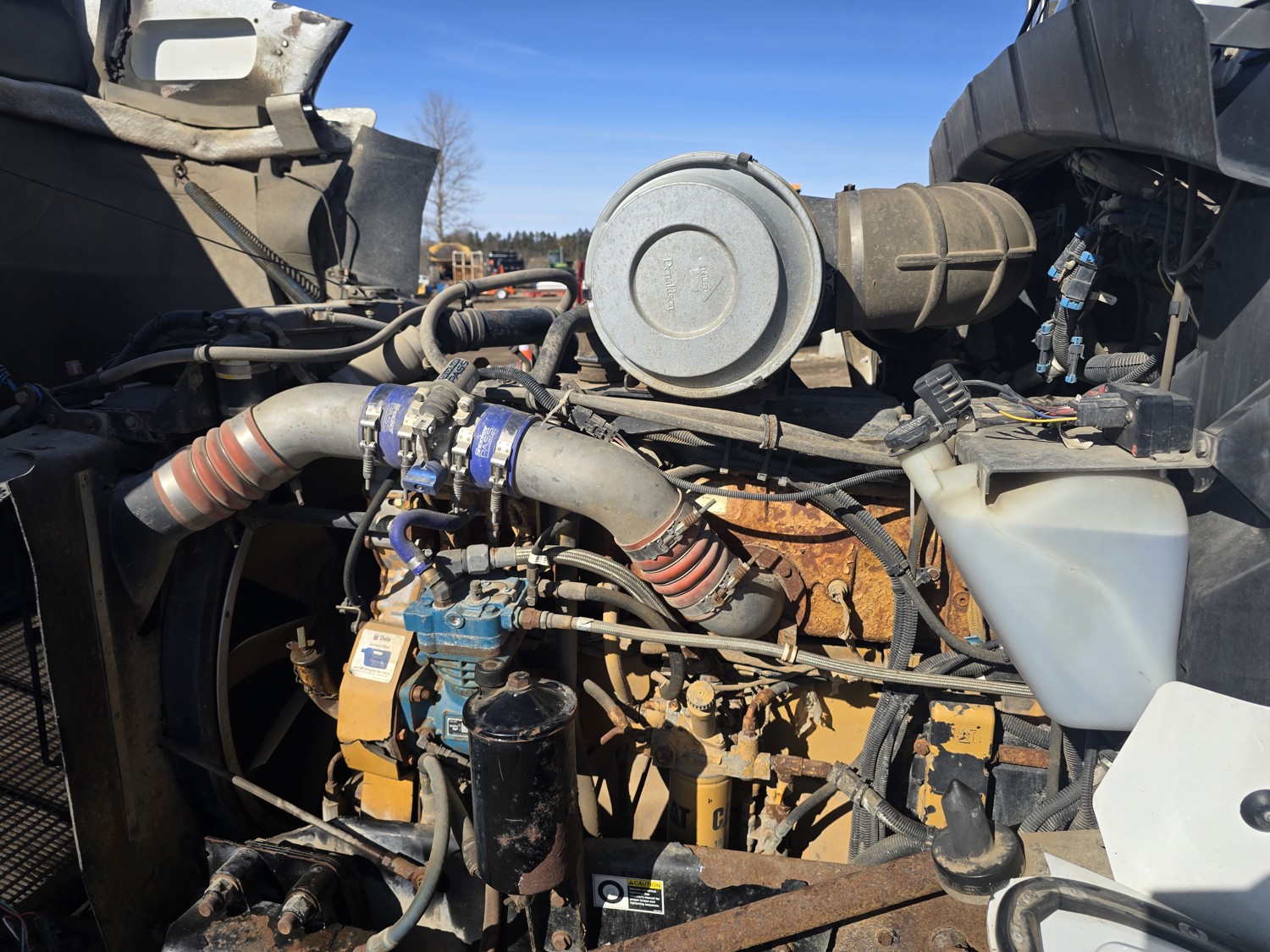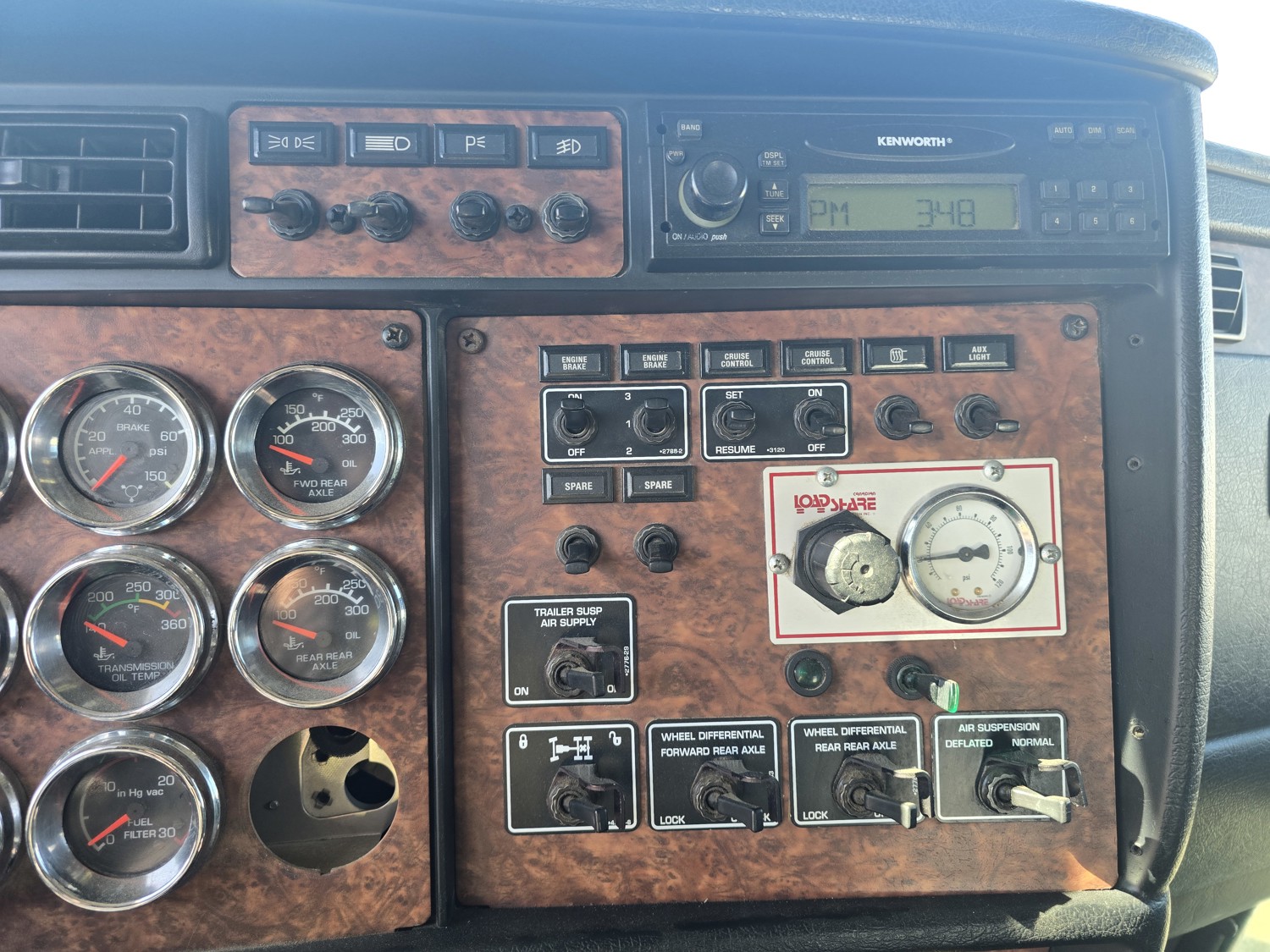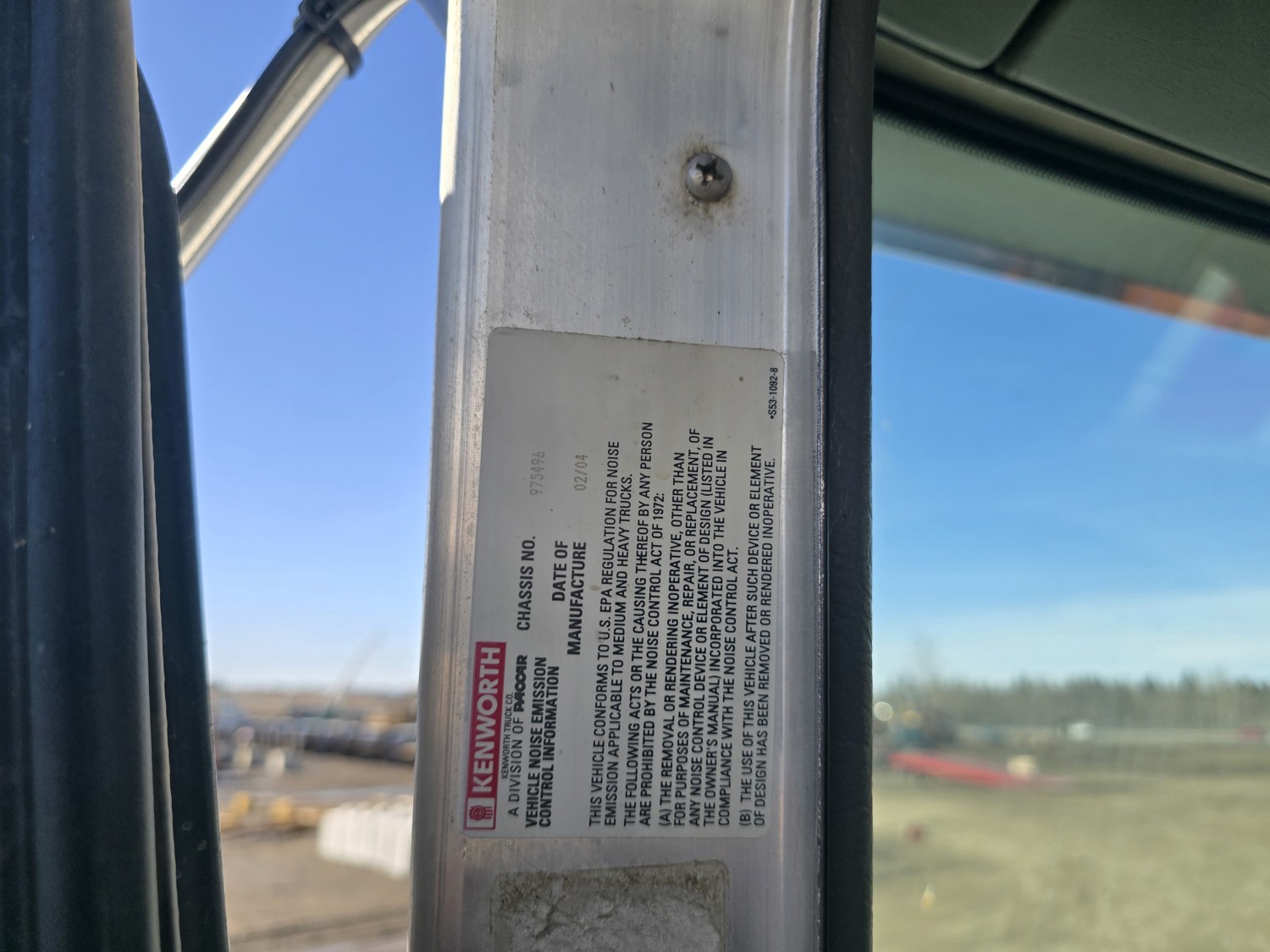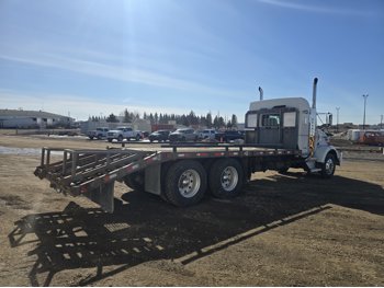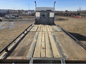 Caterpillar C15 15.2 L 6 cylinder 435 HP diesel engine, Webasto engine heater, engine brake, engine block heater, positive air shutoff, Eaton Fuller RTLO-16913A 13 speed manual transmission, mid rise 38 inch sleeper, A/C, cruise control, air ride driver seat, steel headache rack, aluminum tool boxes, 102 inch x 19 ft deck, chain holders, 72 inch dovetail, 62 inch manual ramps, 2-5/16 rear ball hitch for a goose neck trailer, front air assist suspension, Airglide air ride suspension, 13,200 lb front axle, 40,000 lb rear axles, 3 way diff locks, 4.11:1 ratio, 275 inch WB, all aluminum wheels, 11R24.5 tires