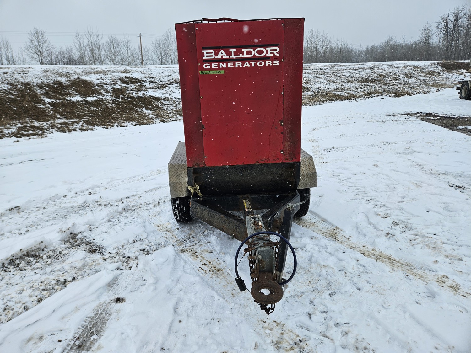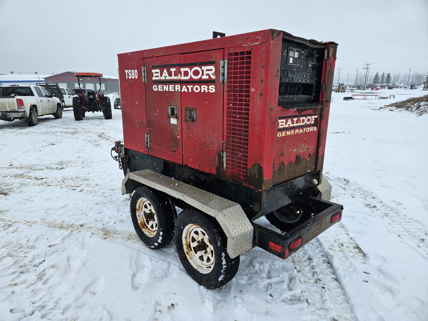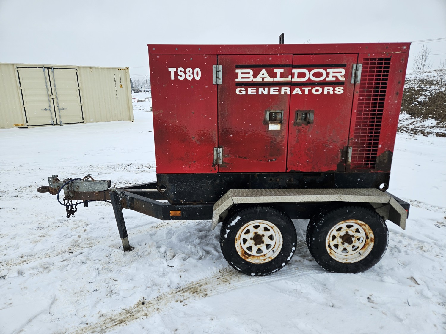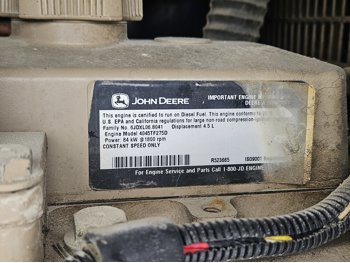John Deere 4.5L 4 cylinder diesel engine, Baldor TS80T 60 KVA generator, T/A, torsion suspension, pintle hitch, 225/70R15 tires