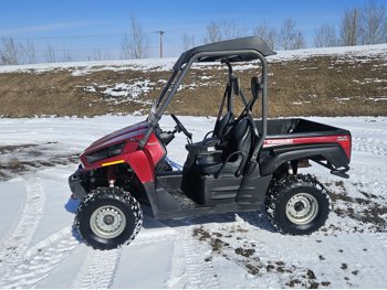 750 cc water cooled engine, automatic transmission, Hi/Lo range, reverse, open canopy, 2 passengers, front winch, manual dump box, hitch, 26-8-12 front tires, 26-10-12 rear tires