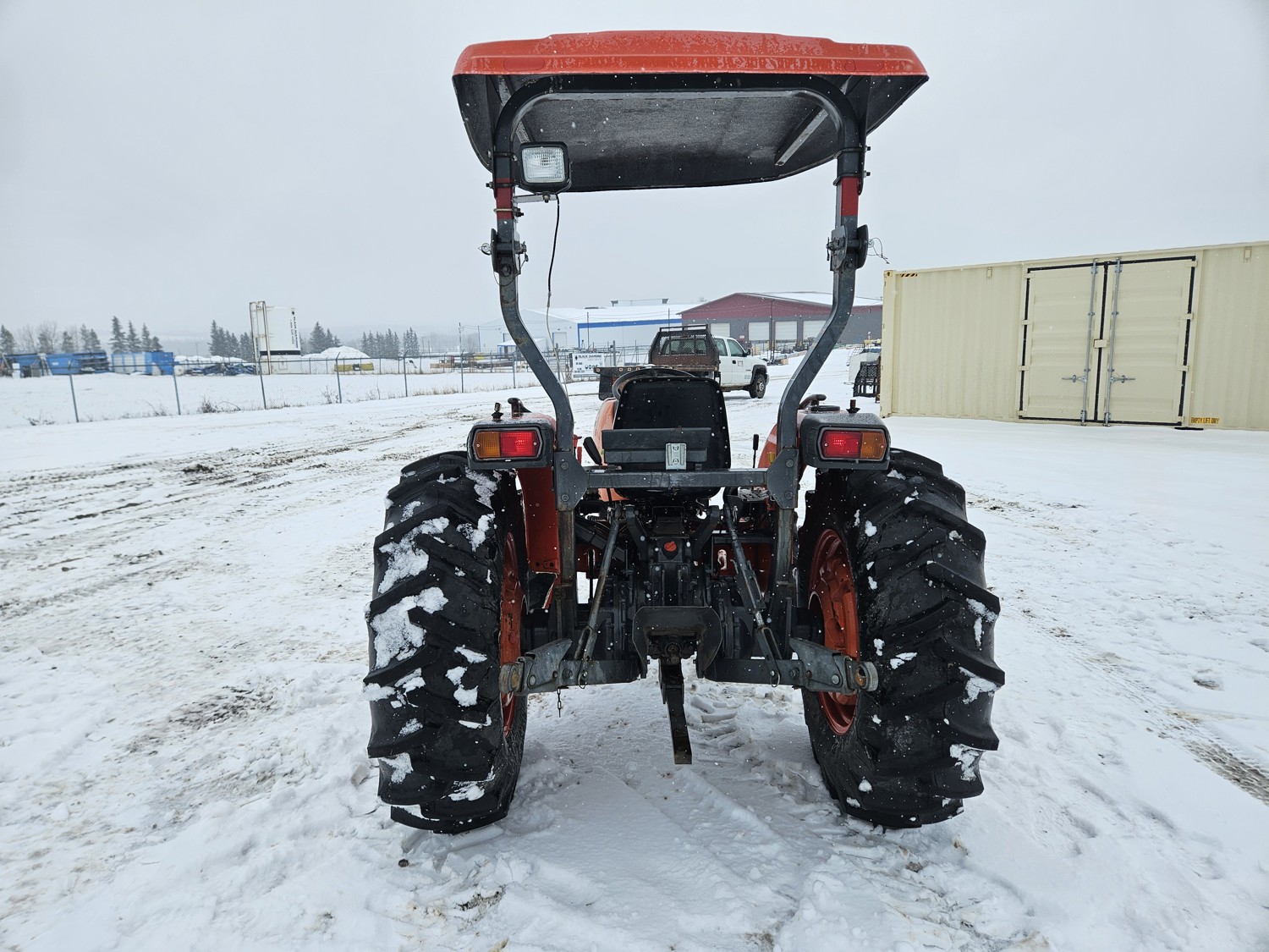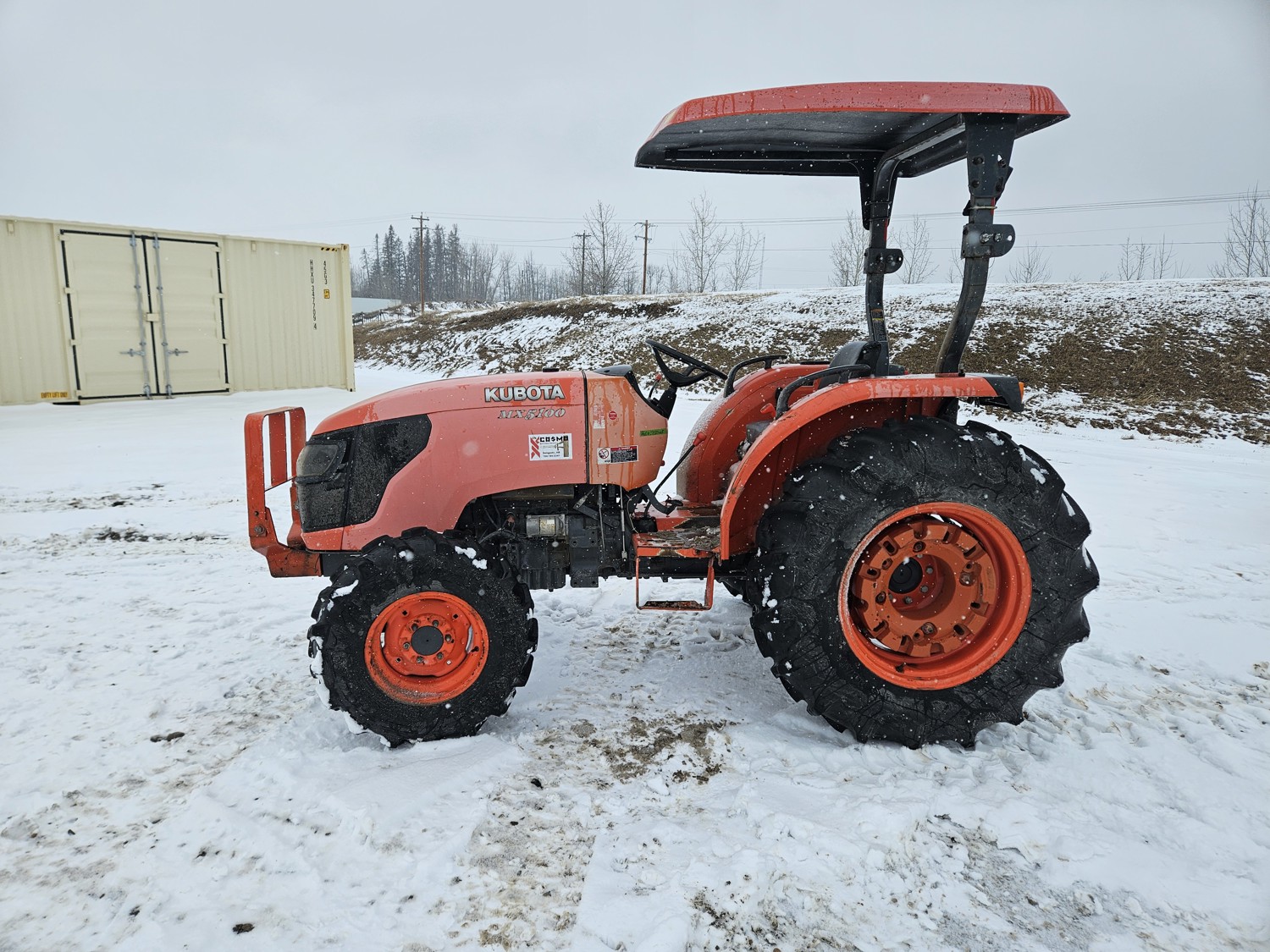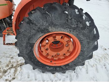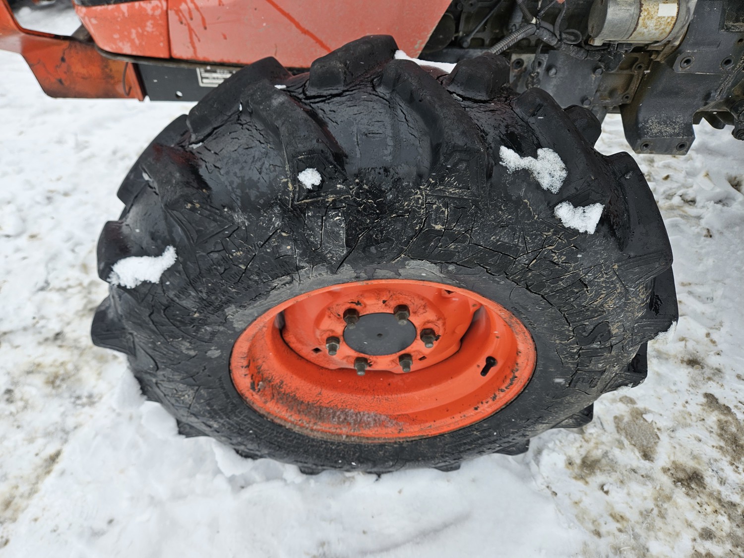 Kubota 2.4 L 4 cylinder diesel engine, 8 speed partial synchro transmission, open station platform, 540 PTO, 3 point hitch, rear wheel weights, 7.5-16 front tires, 14.9-26 rear tires