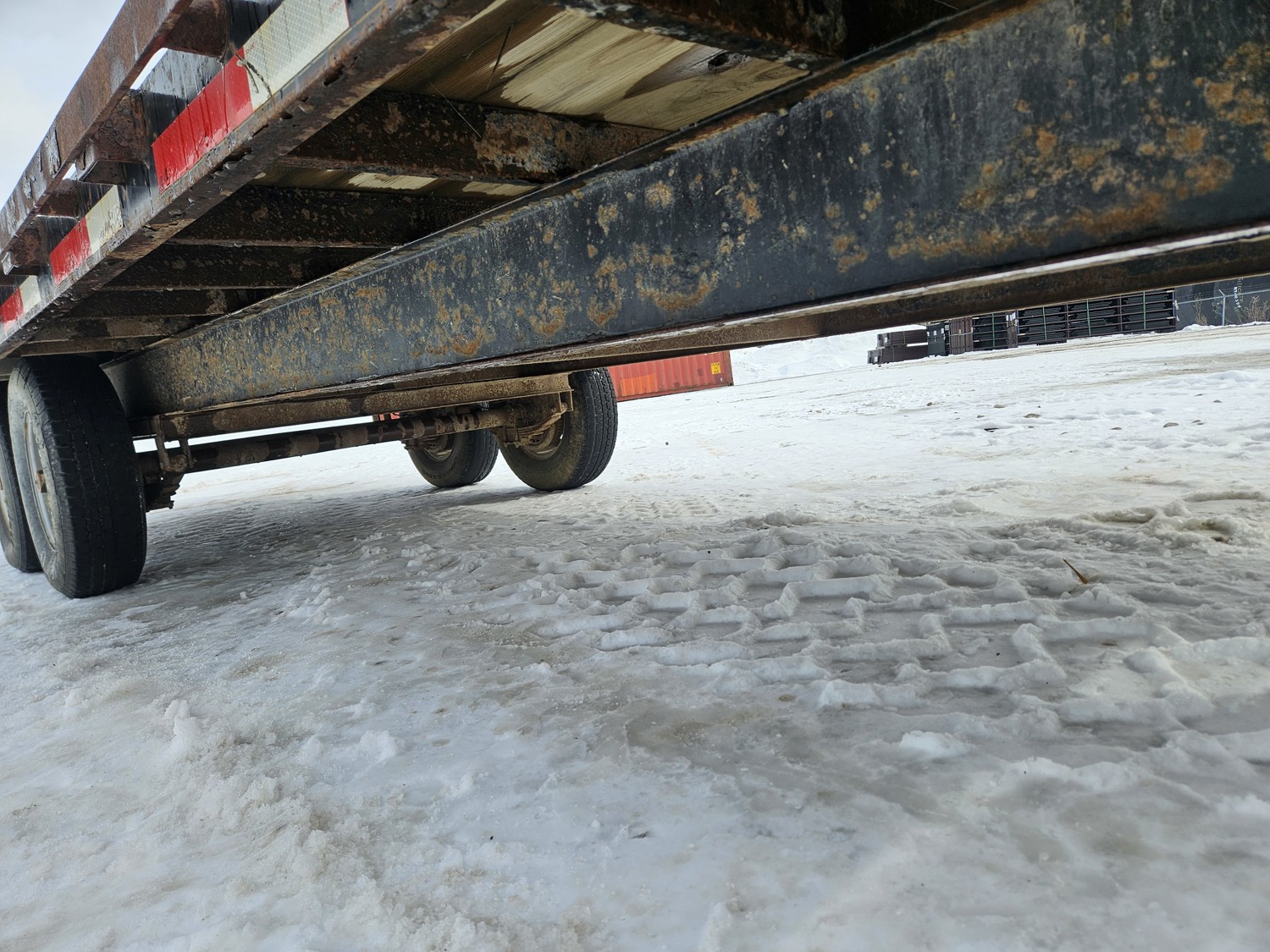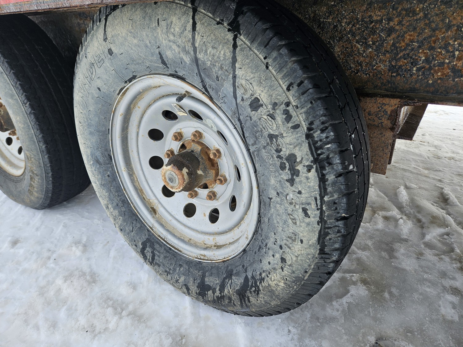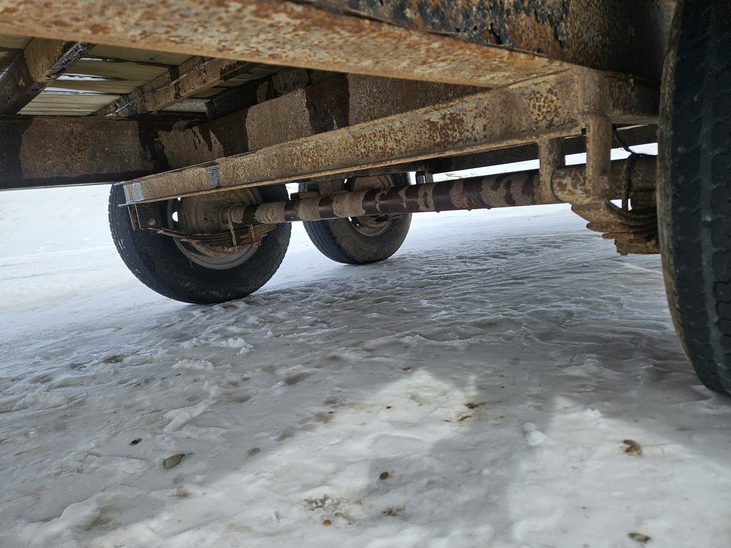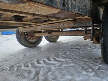 95 inch wide deck, wood deck, slide in ramps, spring suspension, ball hitch, tool / storage box, rub rails, stake pockets, 235/80R16 tires
