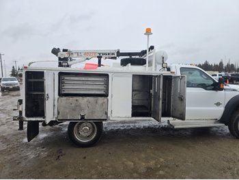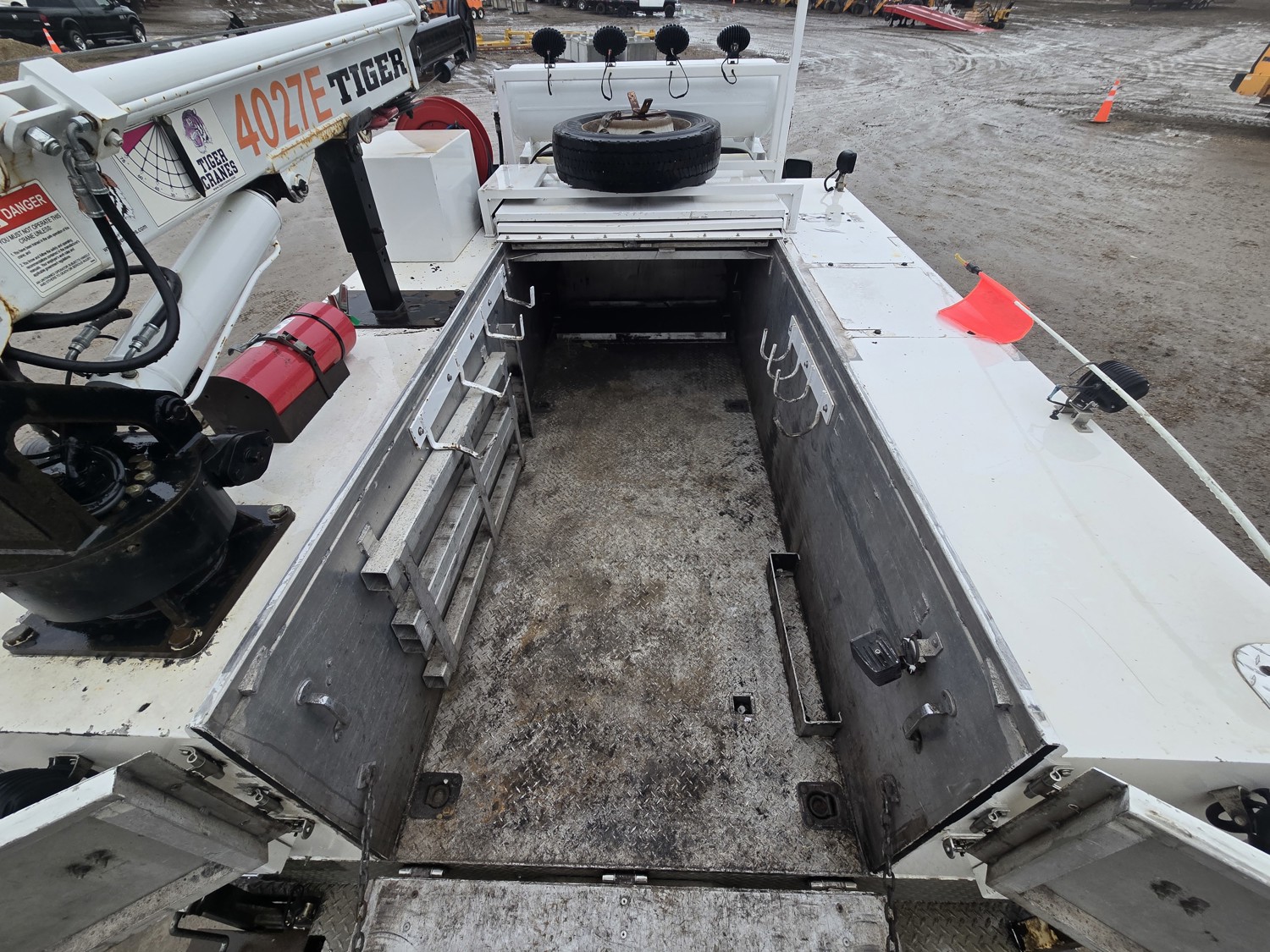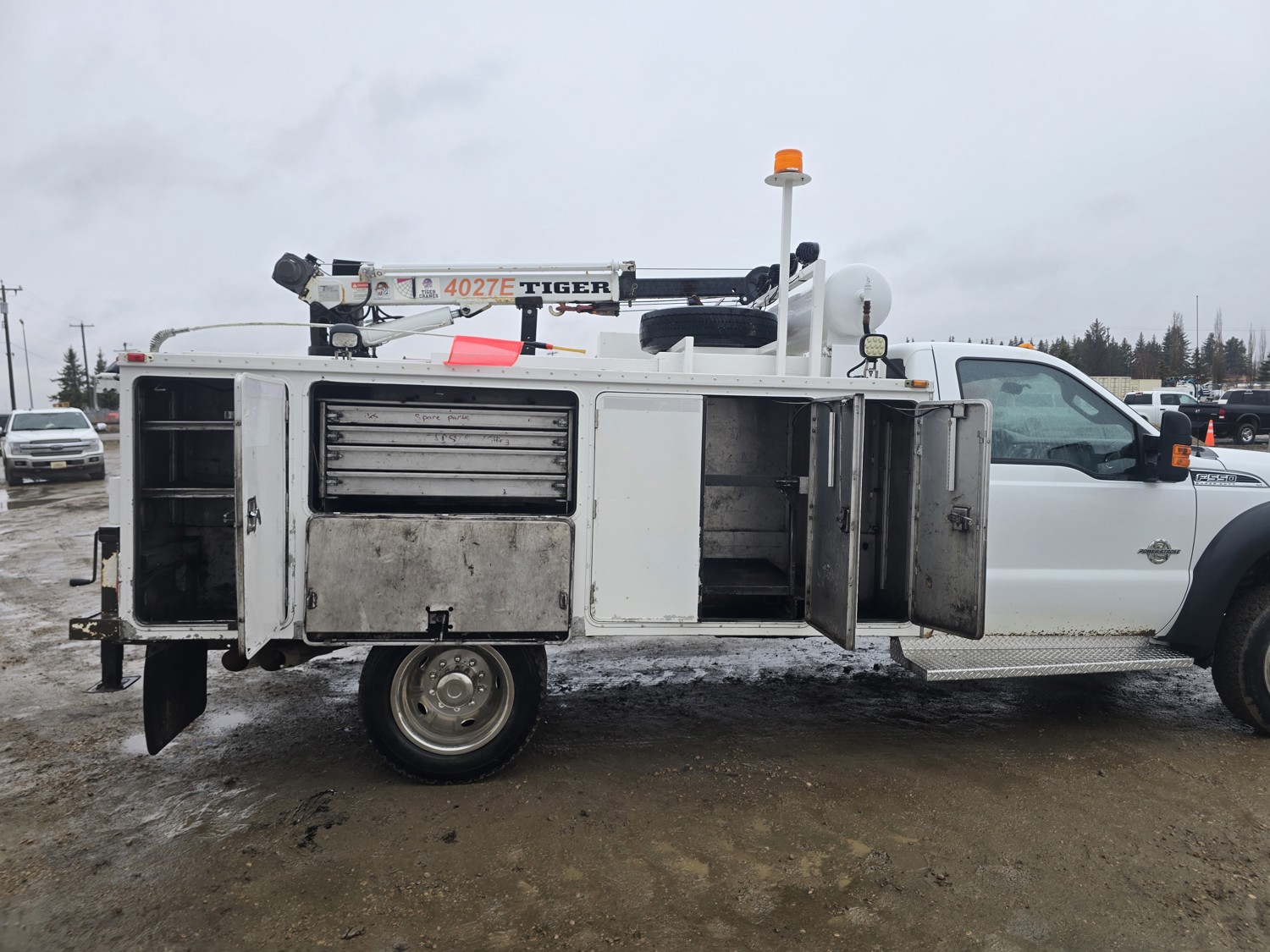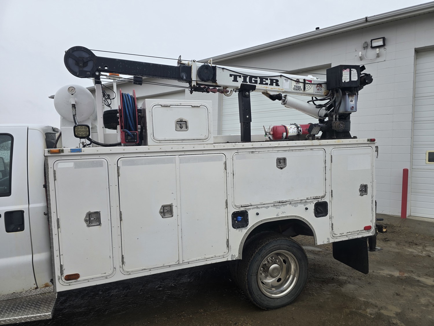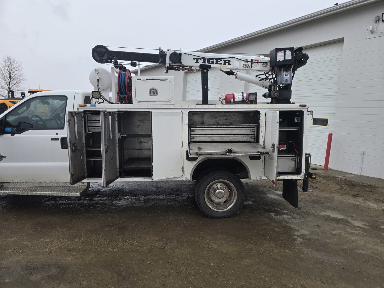 6.7 L V8 diesel engine, DEF required, automatic transmission, A/C, P/W, P/L, cruise control, stereo, running boards, beacons, VMAC air compressor, 11 ft X 96 inch service body, tiger 4027E 2 section straight boom crane, outriggers, spring suspension, 225/70R19.5 tires