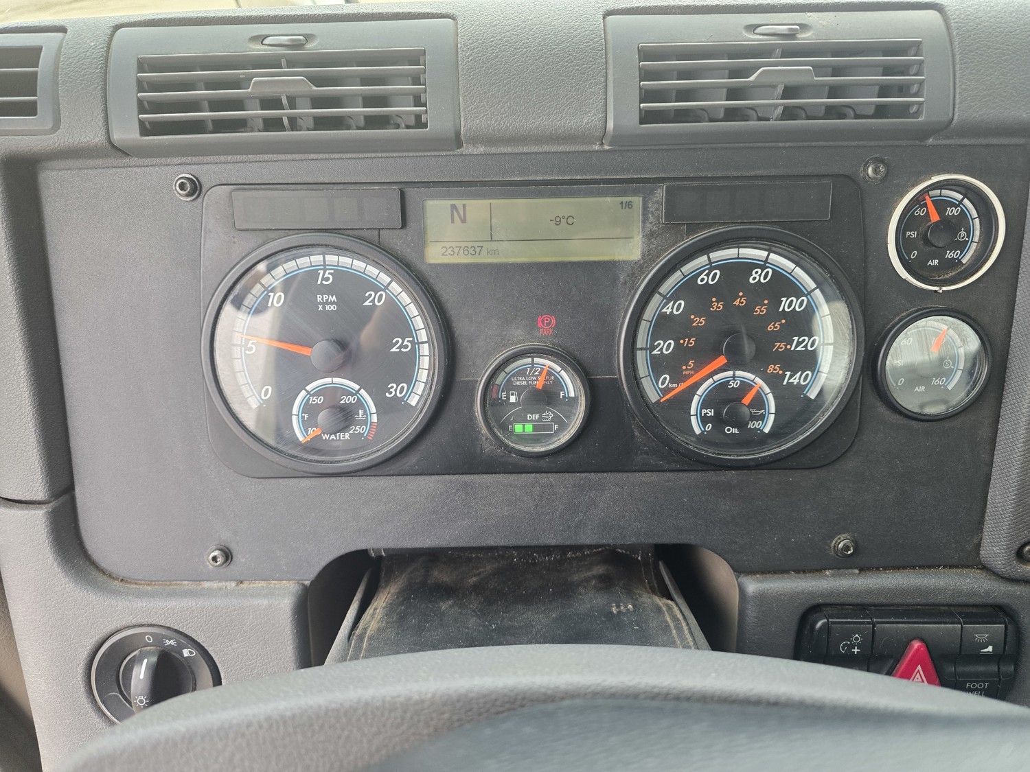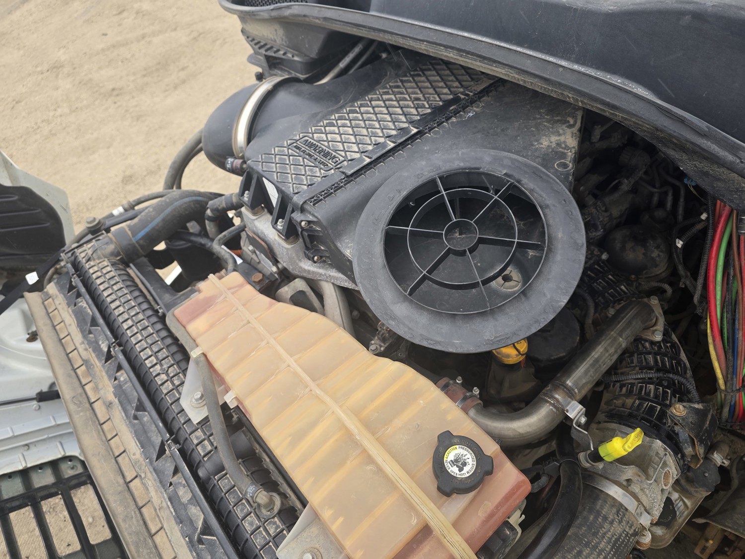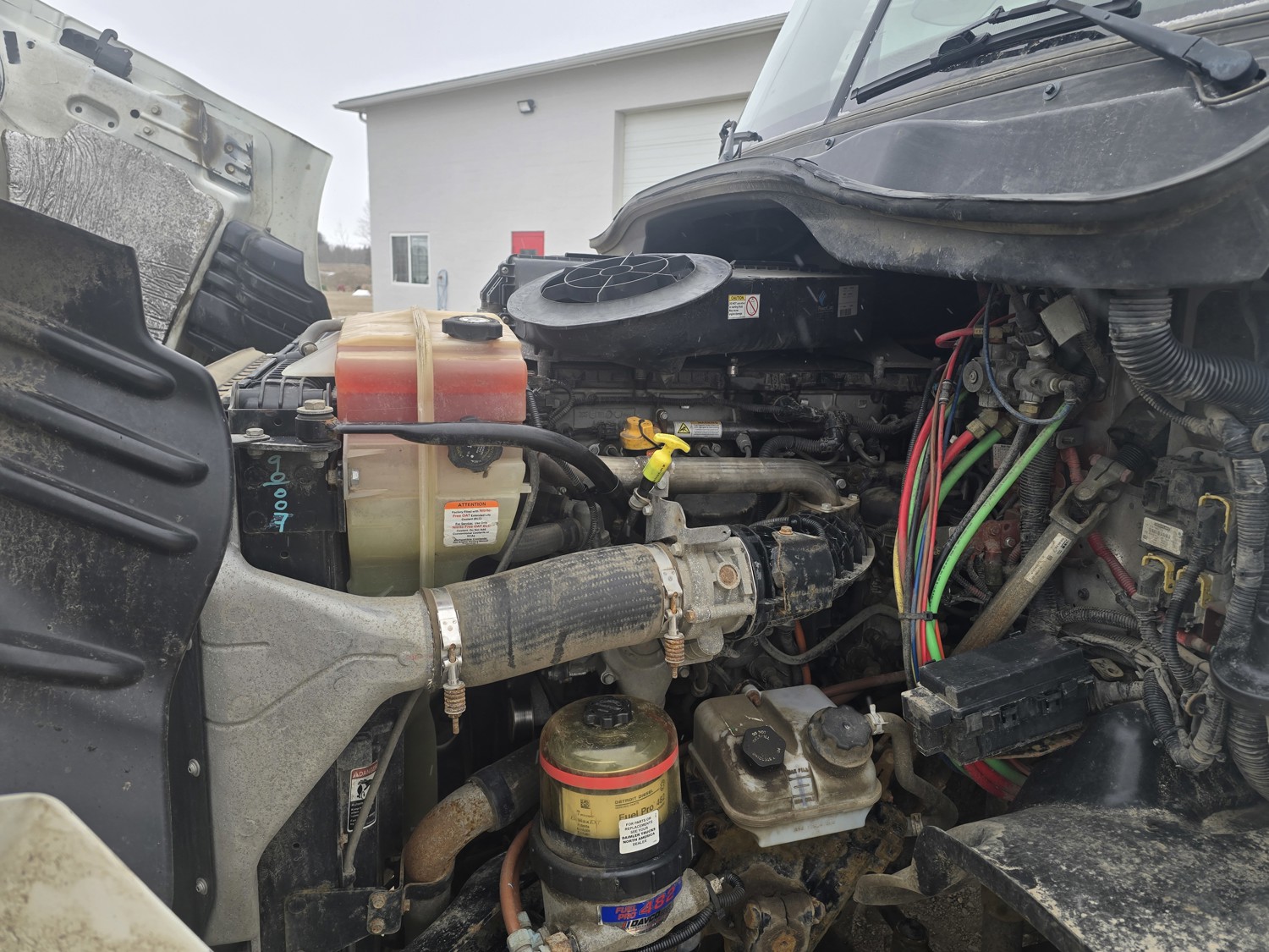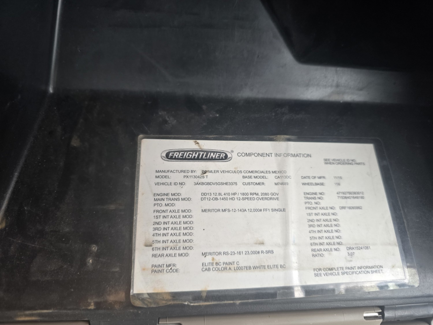 Detroit DD13 12.8 L 6 cylinder 410 HP diesel engine, Espar engine heater, engine brake, engine block heater, DT12-OB 12 speed automatic transmission, A/C, cruise control, air ride driver seat, Airliner air ride suspension, 12,000 lb front axle, 23,000 lb rear axles, diff lock, 3.07 ratio, 156 inch WB, 11R22.5 tires