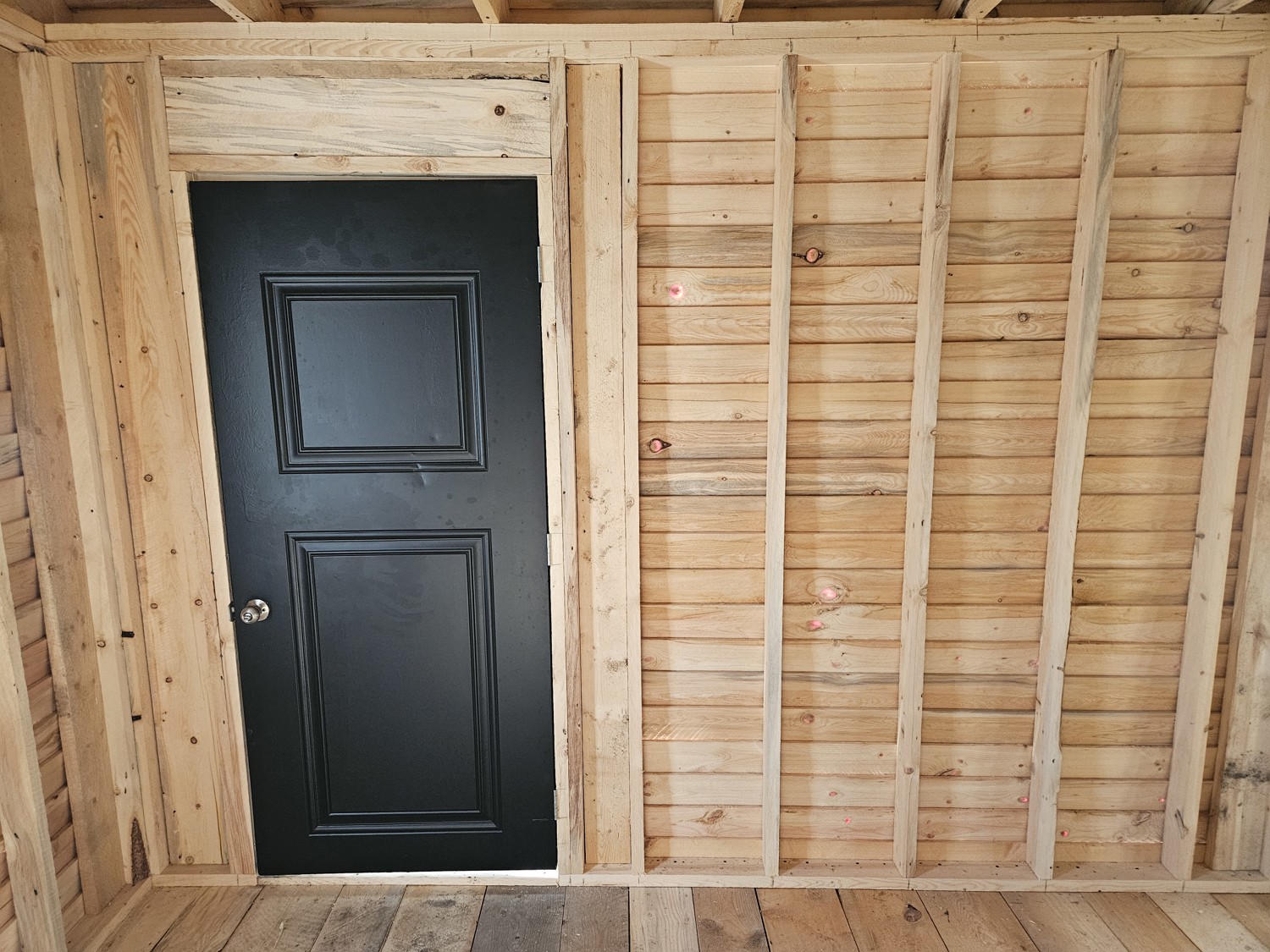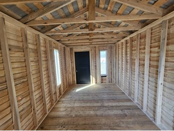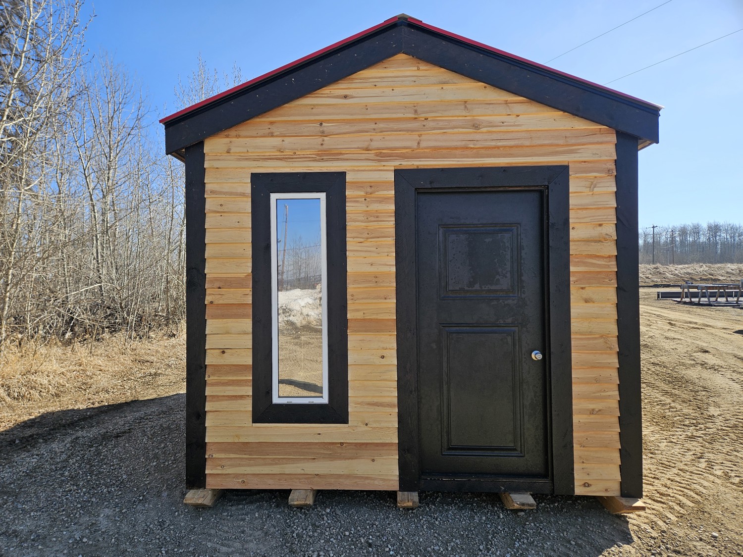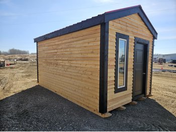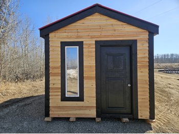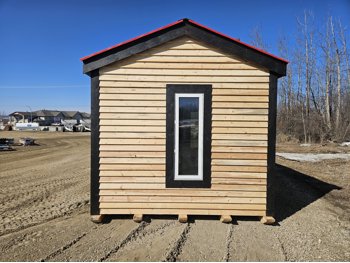 123 inch wide x 209 inch long, (2) man doors, (3) windows, tin roof, wood frame, on skids, 1x6 wood siding