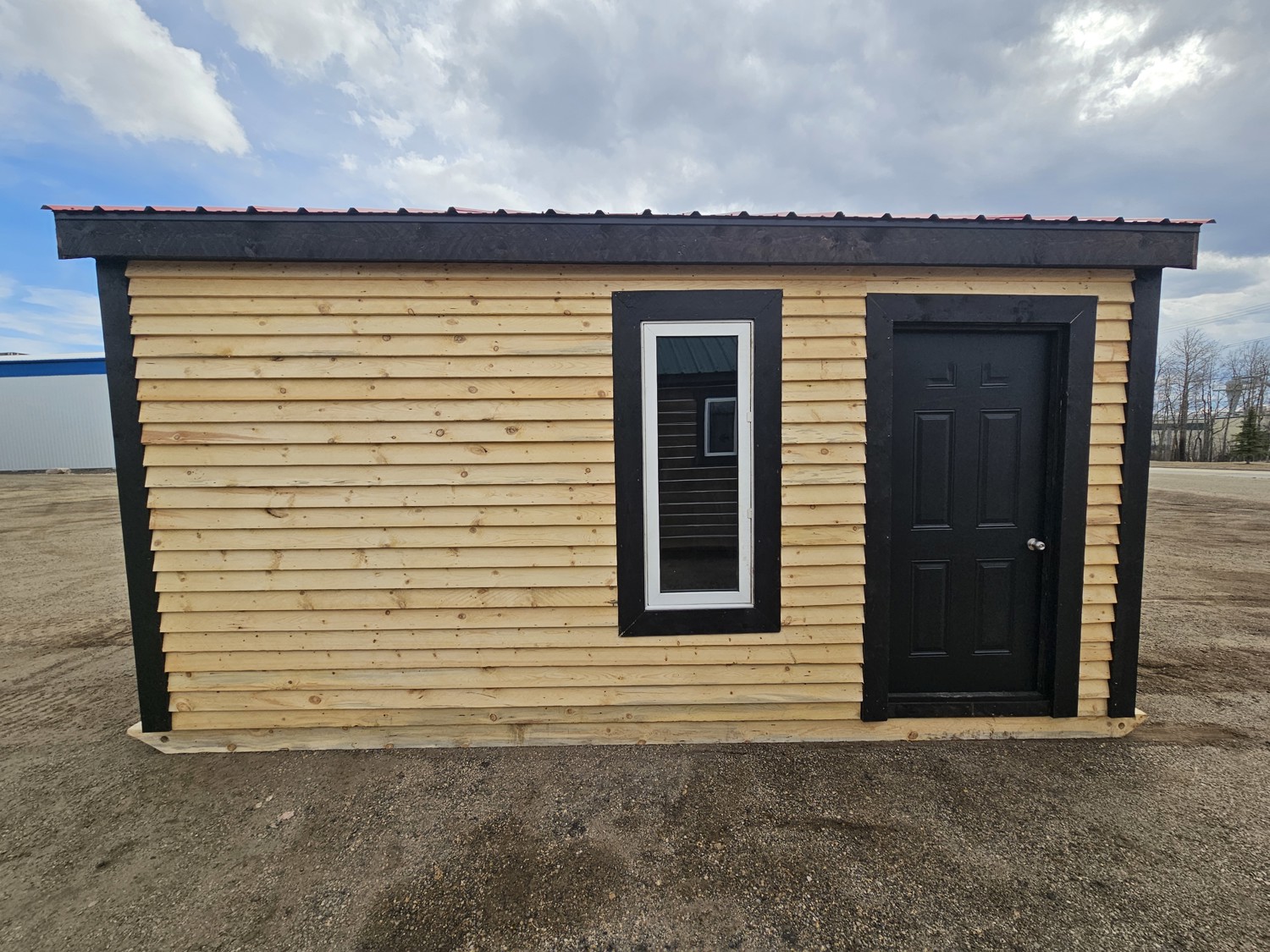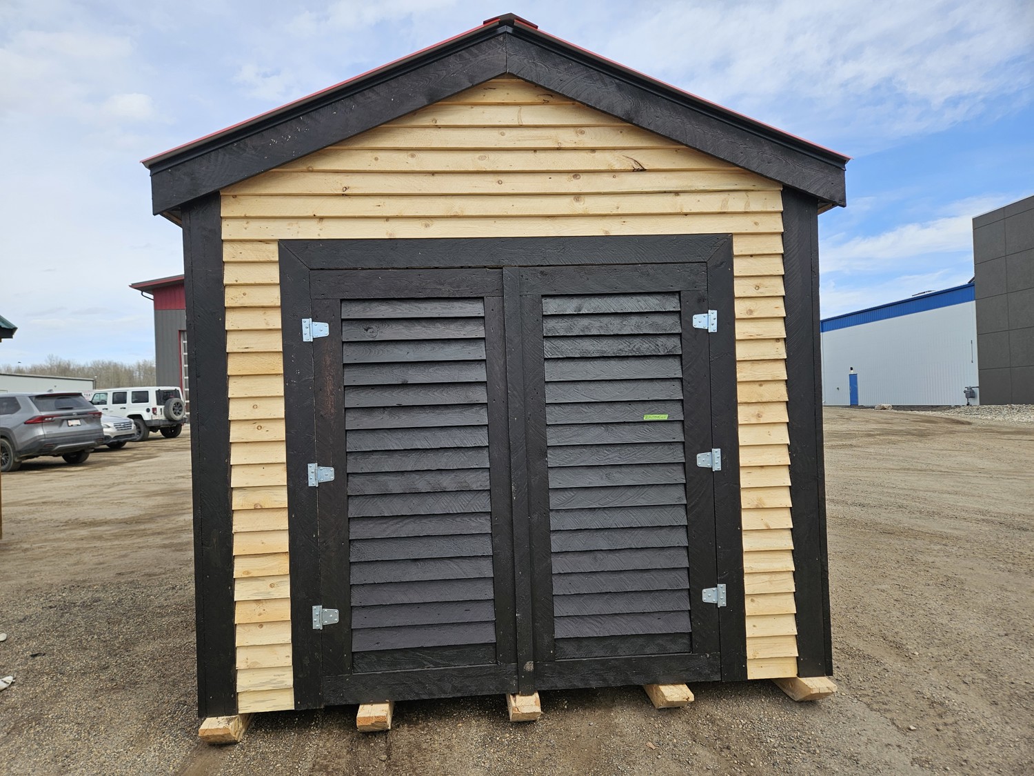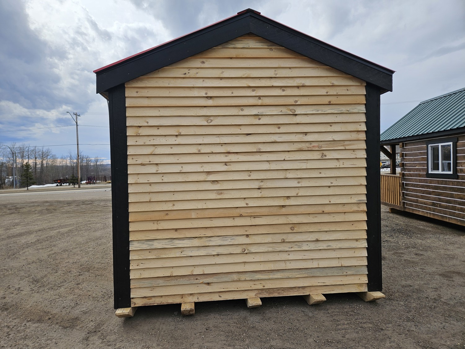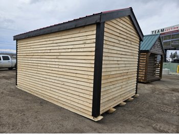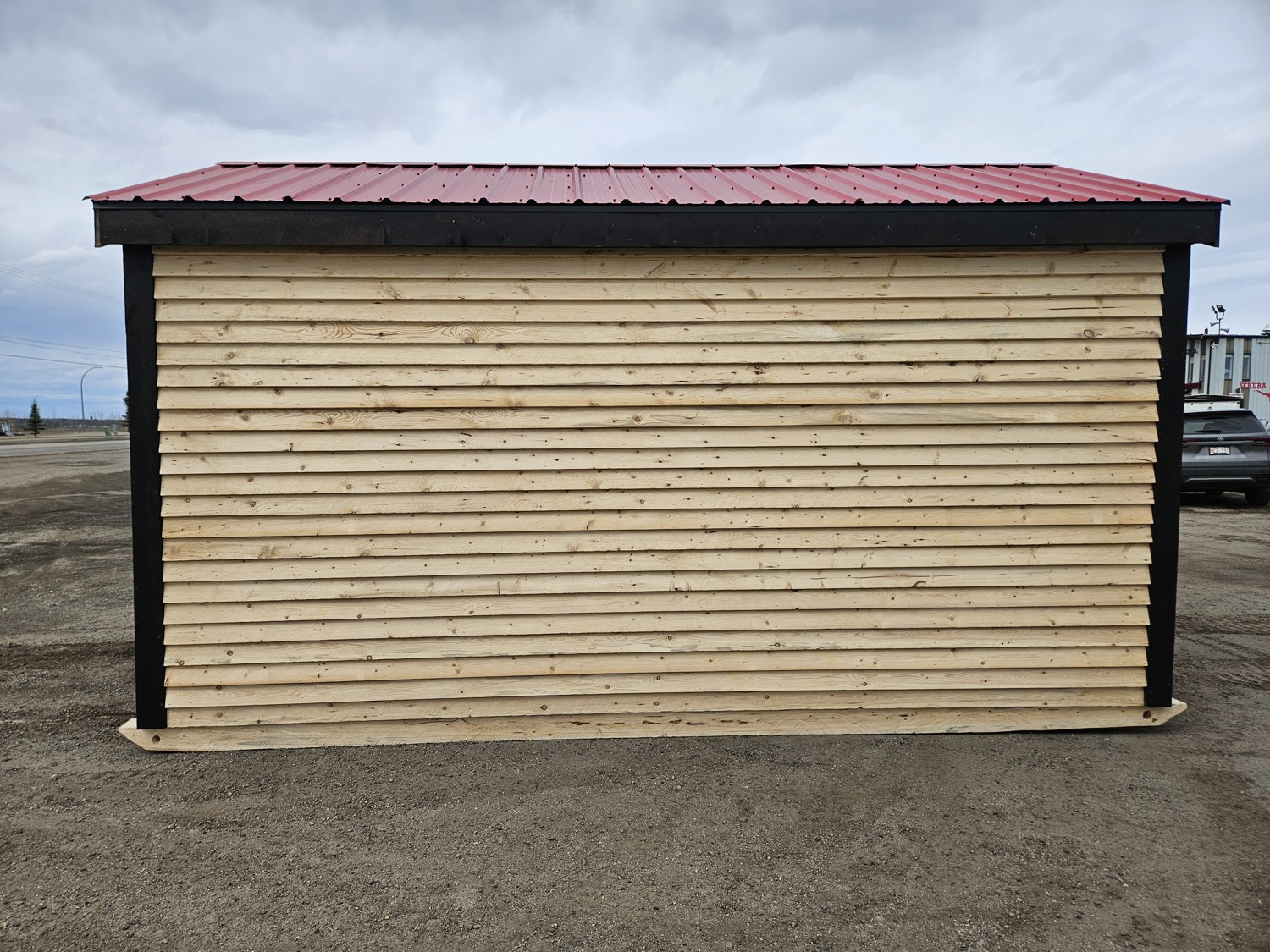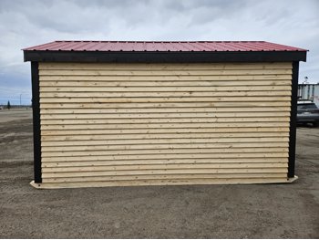 123 inch wide x 209 inch long, bi folding front doors, side man door, window, tin roof, wood frame, 1x6 wood siding, clear coated stain