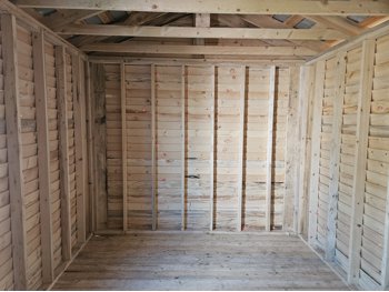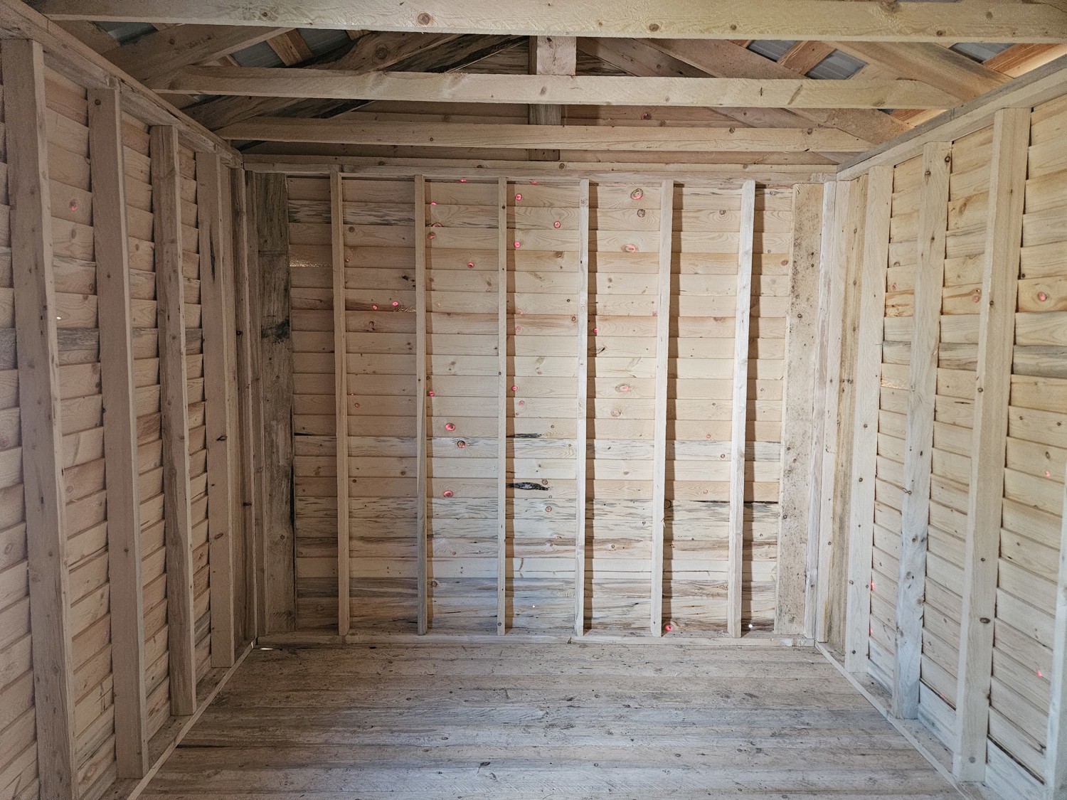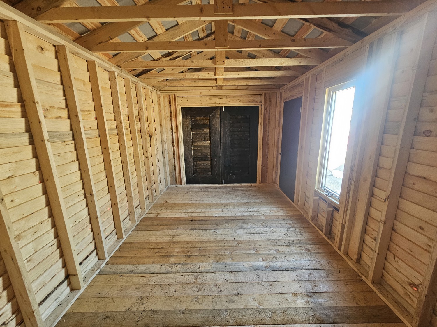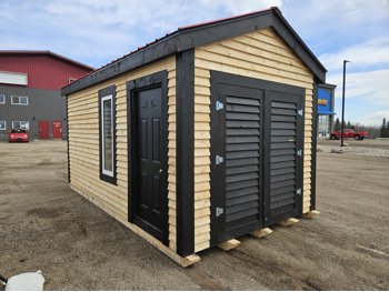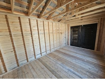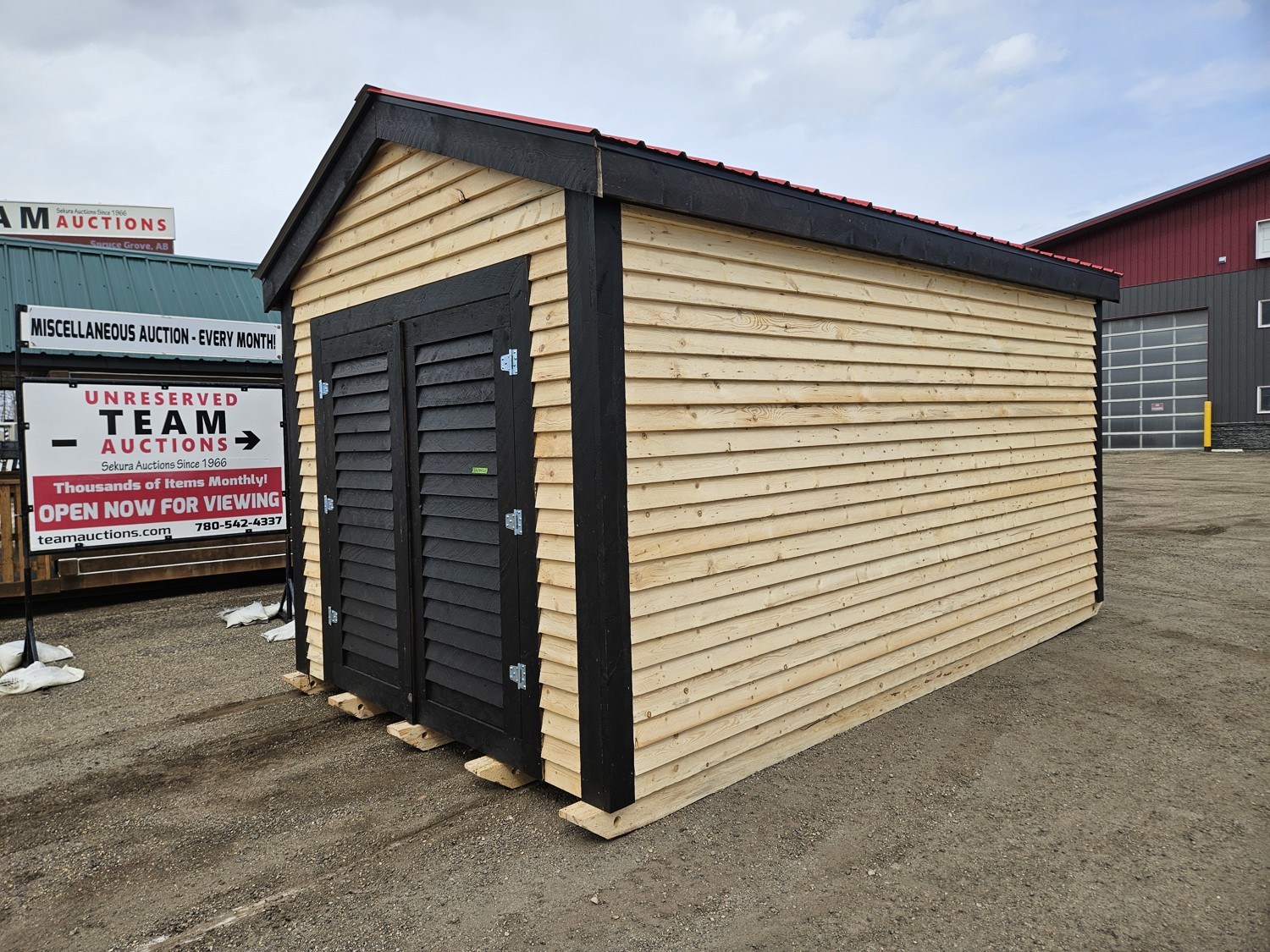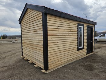 123 inch wide x 209 inch long, bi folding front doors, side man door, window, tin roof, wood frame, 1x6 wood siding, clear coated stain