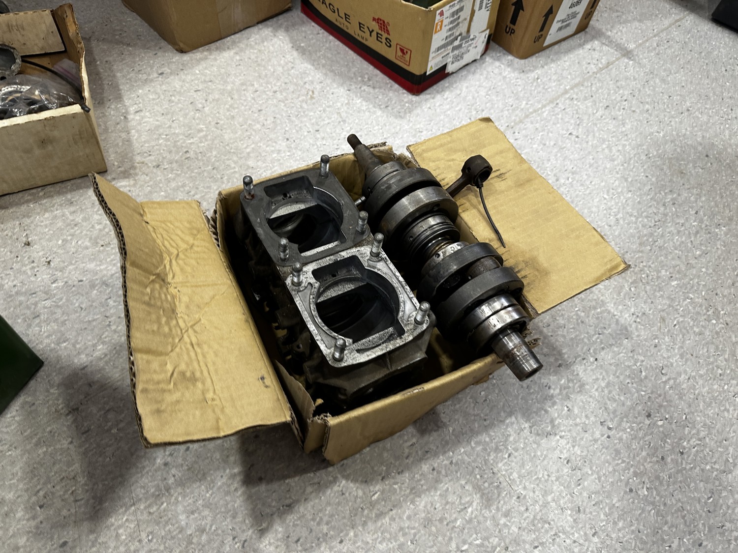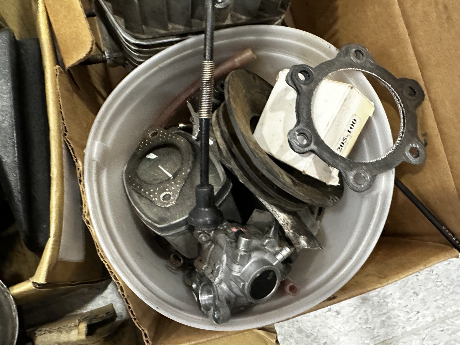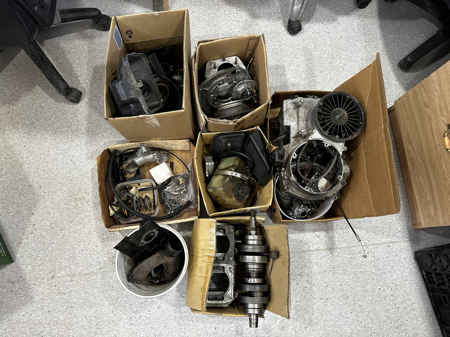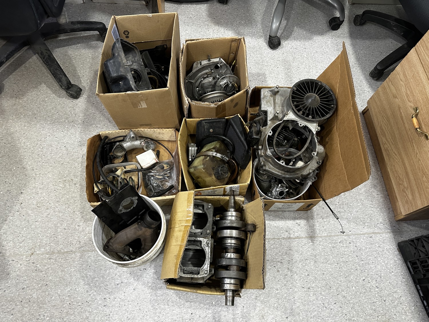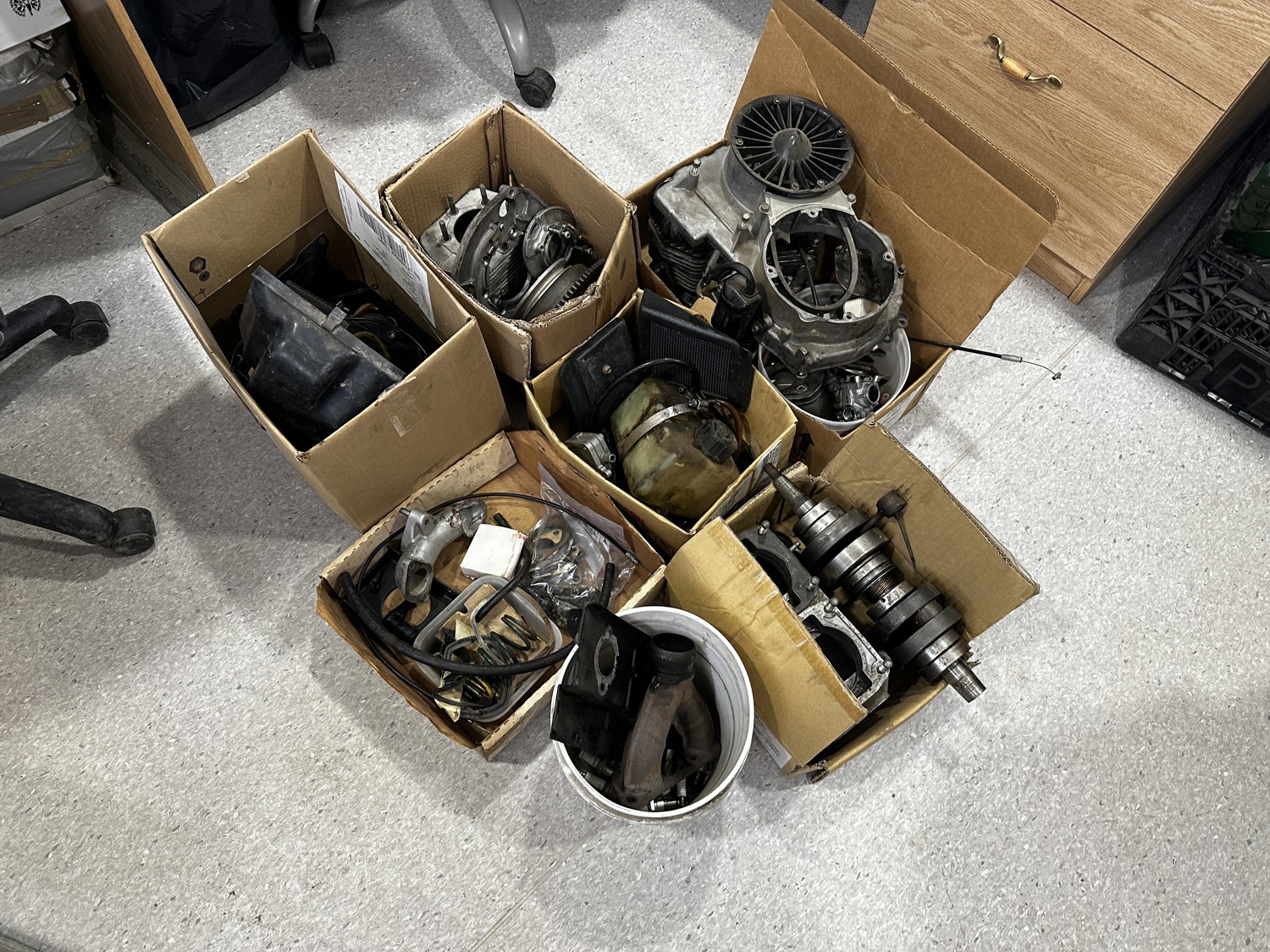 Boxes include, crank shaft, crank case, spark plugs, 2 cylinder exhaust manifold, intake manifold, miscellaneous gaskets, throttle cable, gas tank, (3) carburetors, Capacitor Discharge Ignition, engine cooling fan housing, belt wheel, (3) cylinder heads, electric clutch, miscellaneous plastics