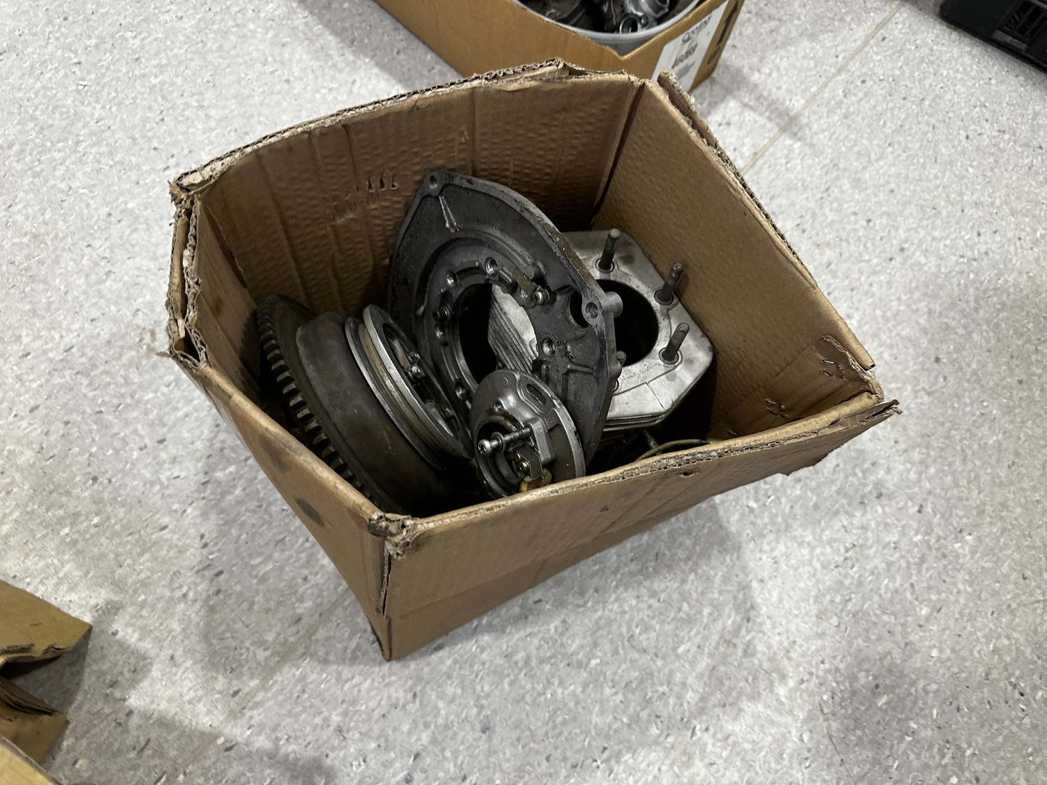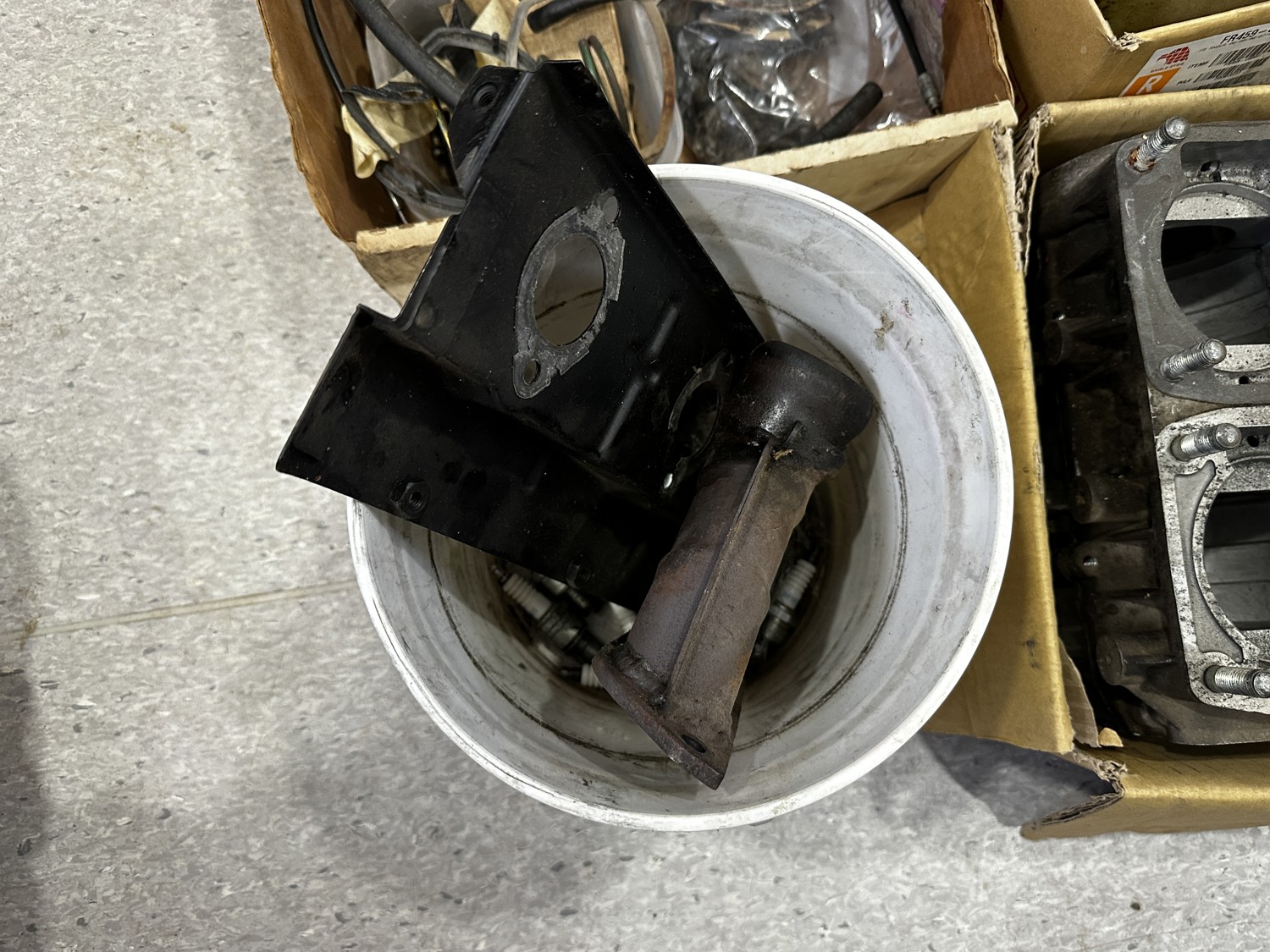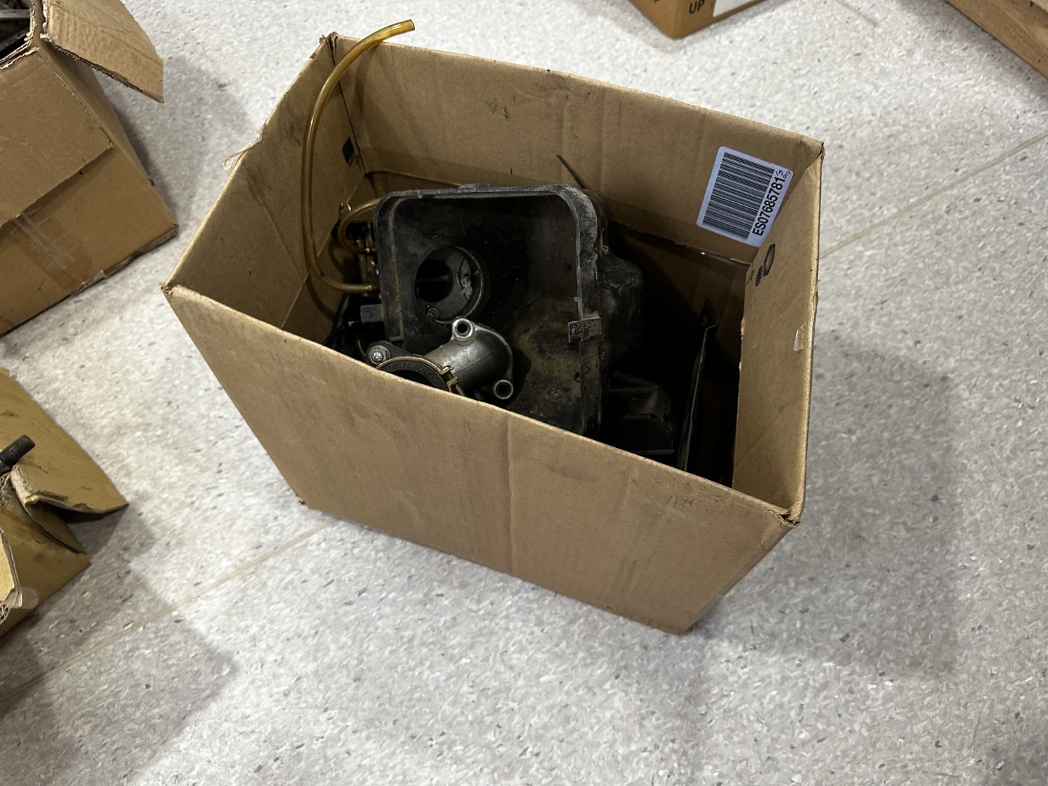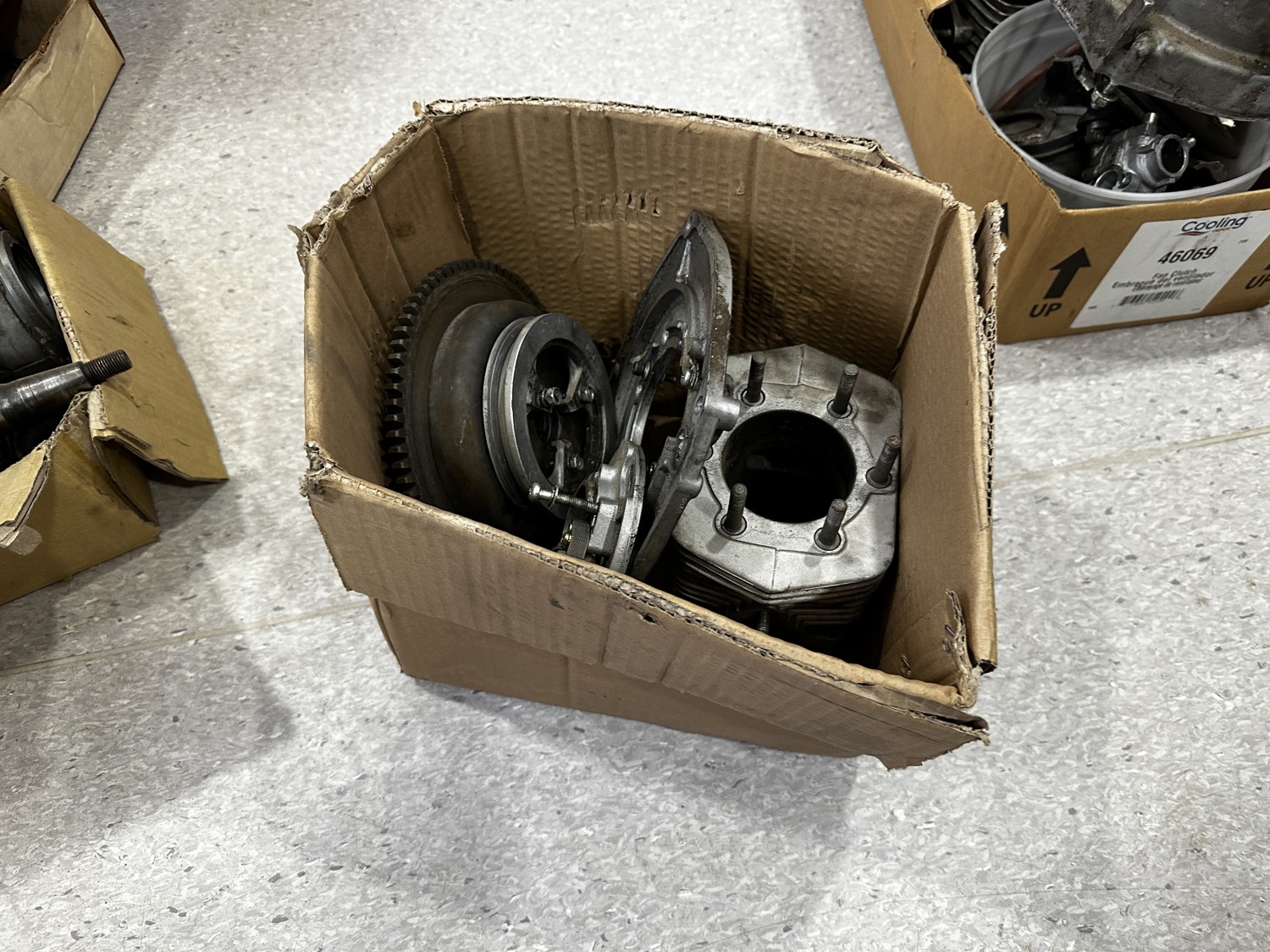 Boxes include, crank shaft, crank case, spark plugs, 2 cylinder exhaust manifold, intake manifold, miscellaneous gaskets, throttle cable, gas tank, (3) carburetors, Capacitor Discharge Ignition, engine cooling fan housing, belt wheel, (3) cylinder heads, electric clutch, miscellaneous plastics