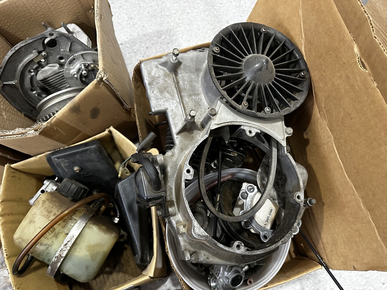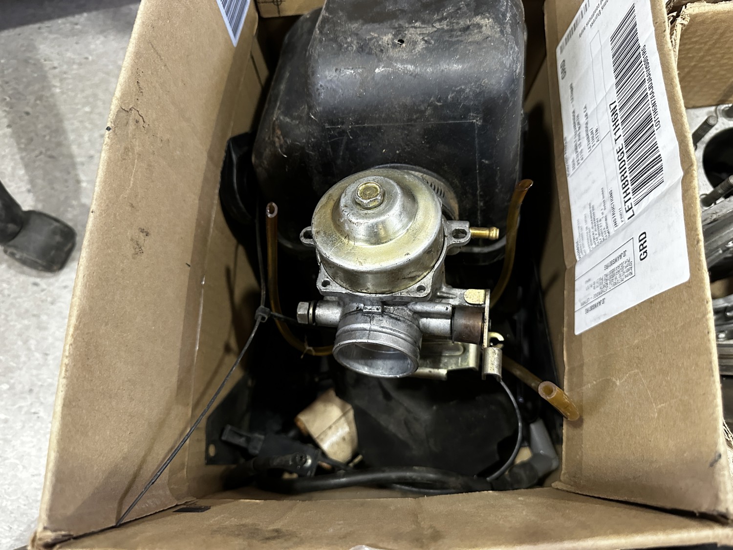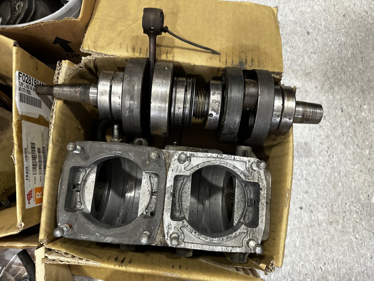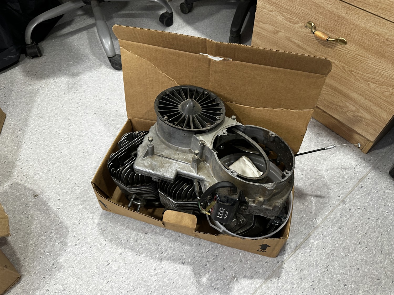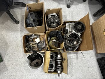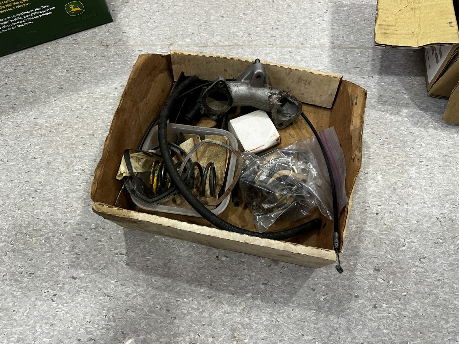 Boxes include, crank shaft, crank case, spark plugs, 2 cylinder exhaust manifold, intake manifold, miscellaneous gaskets, throttle cable, gas tank, (3) carburetors, Capacitor Discharge Ignition, engine cooling fan housing, belt wheel, (3) cylinder heads, electric clutch, miscellaneous plastics