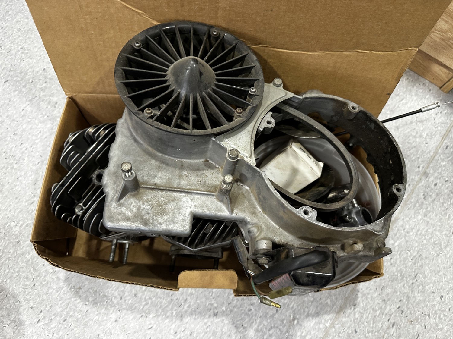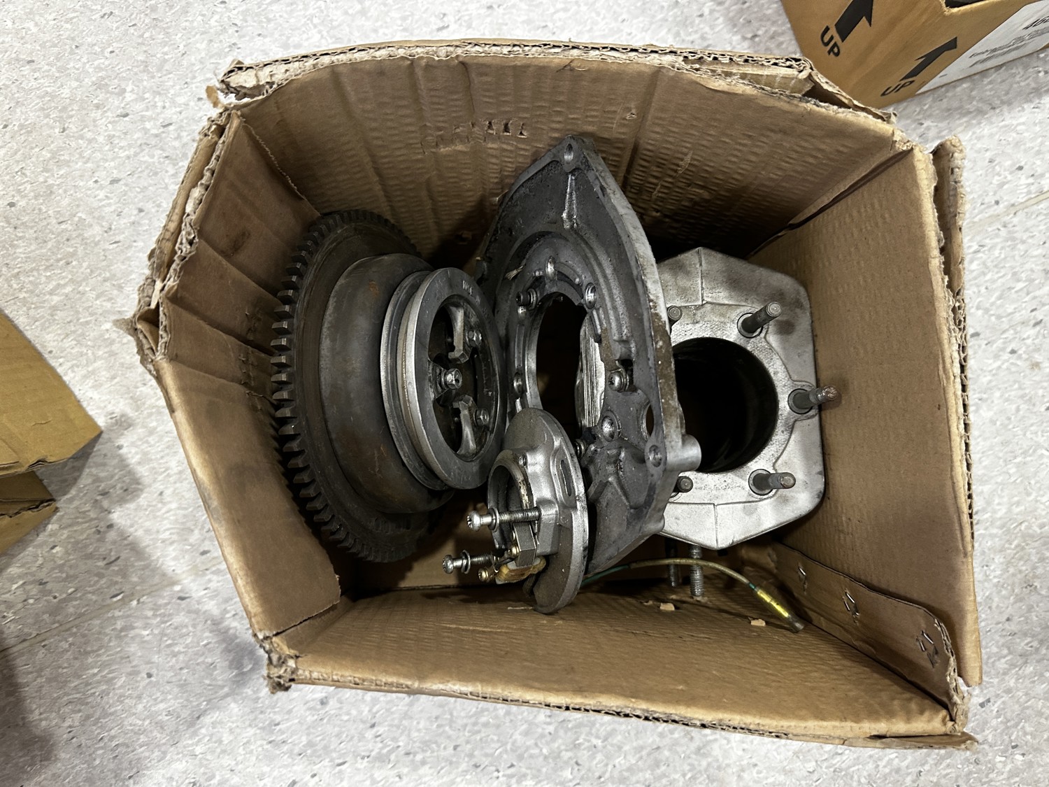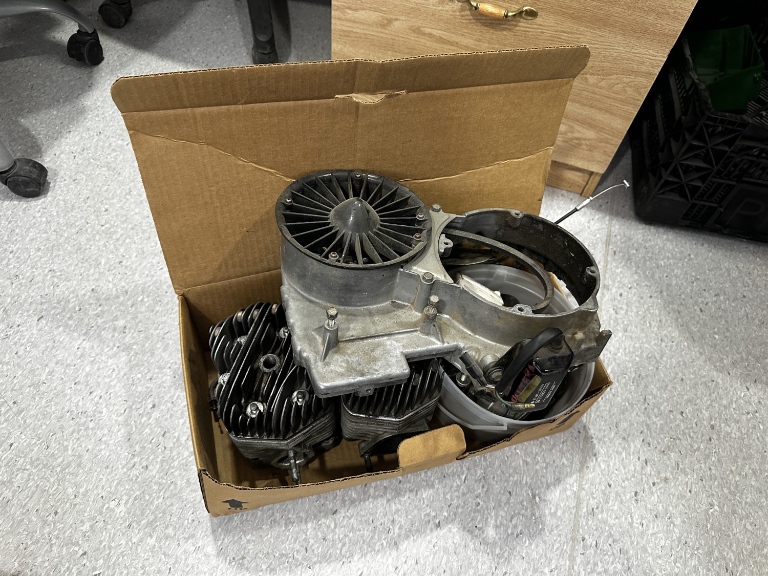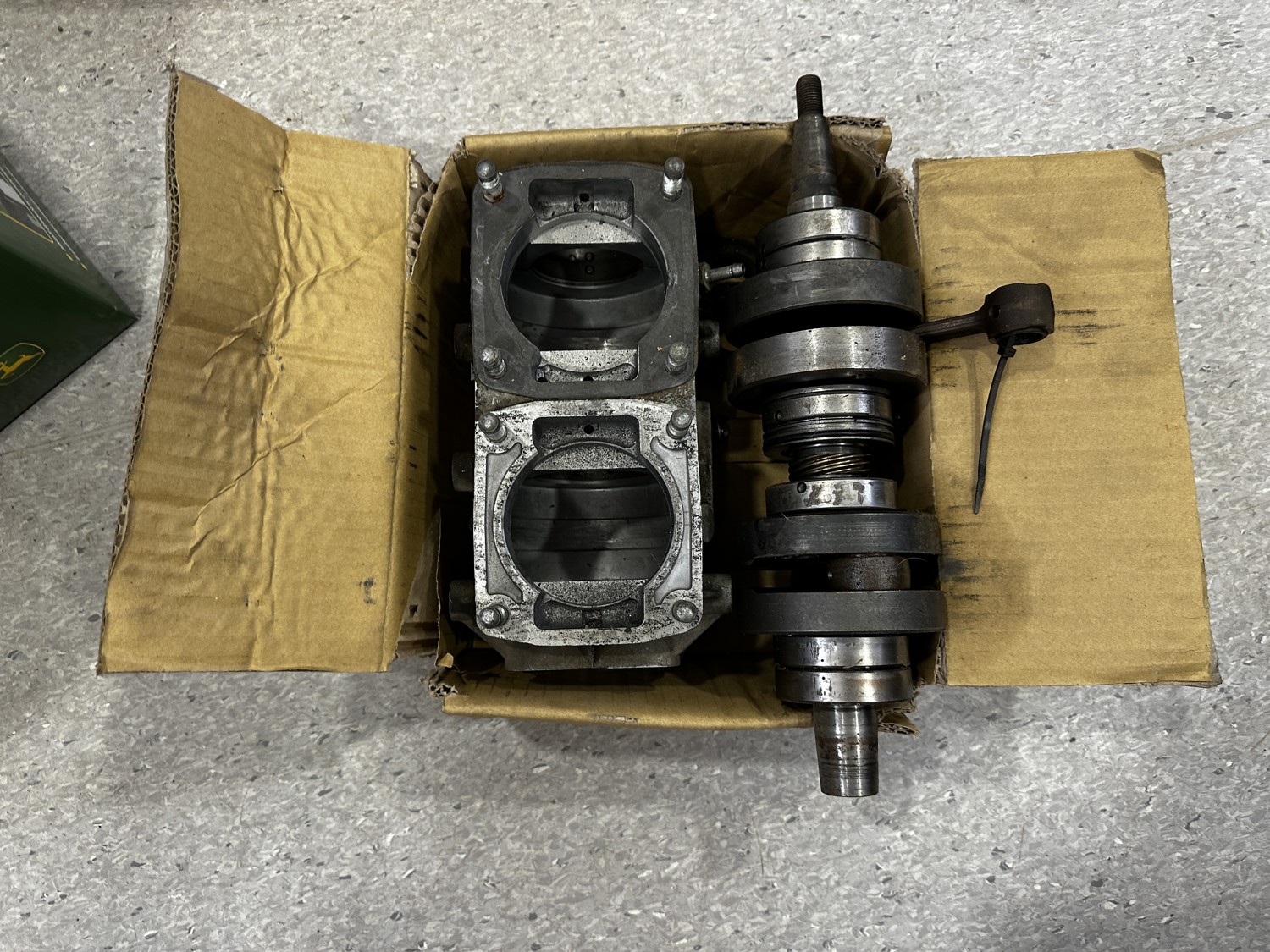 Boxes include, crank shaft, crank case, spark plugs, 2 cylinder exhaust manifold, intake manifold, miscellaneous gaskets, throttle cable, gas tank, (3) carburetors, Capacitor Discharge Ignition, engine cooling fan housing, belt wheel, (3) cylinder heads, electric clutch, miscellaneous plastics