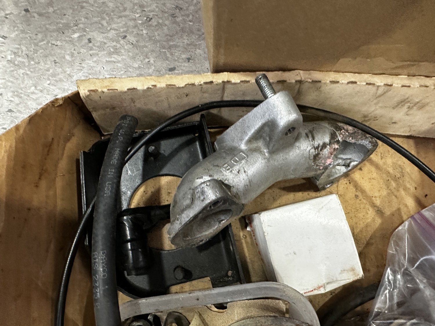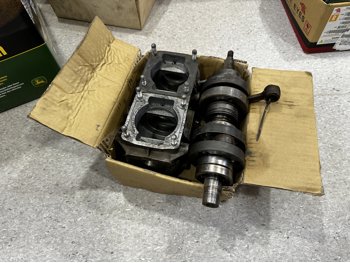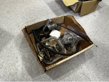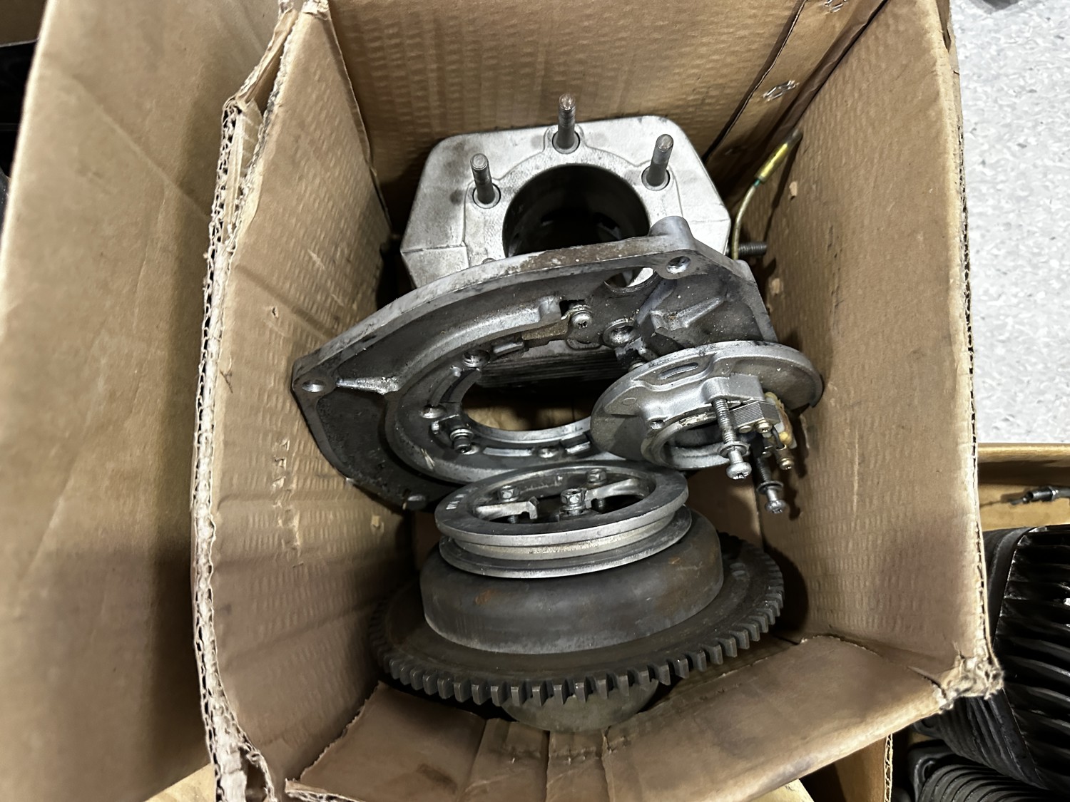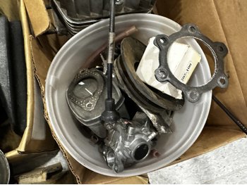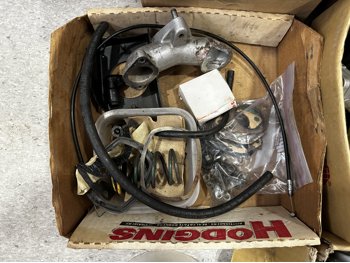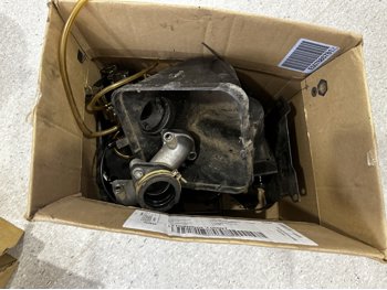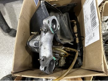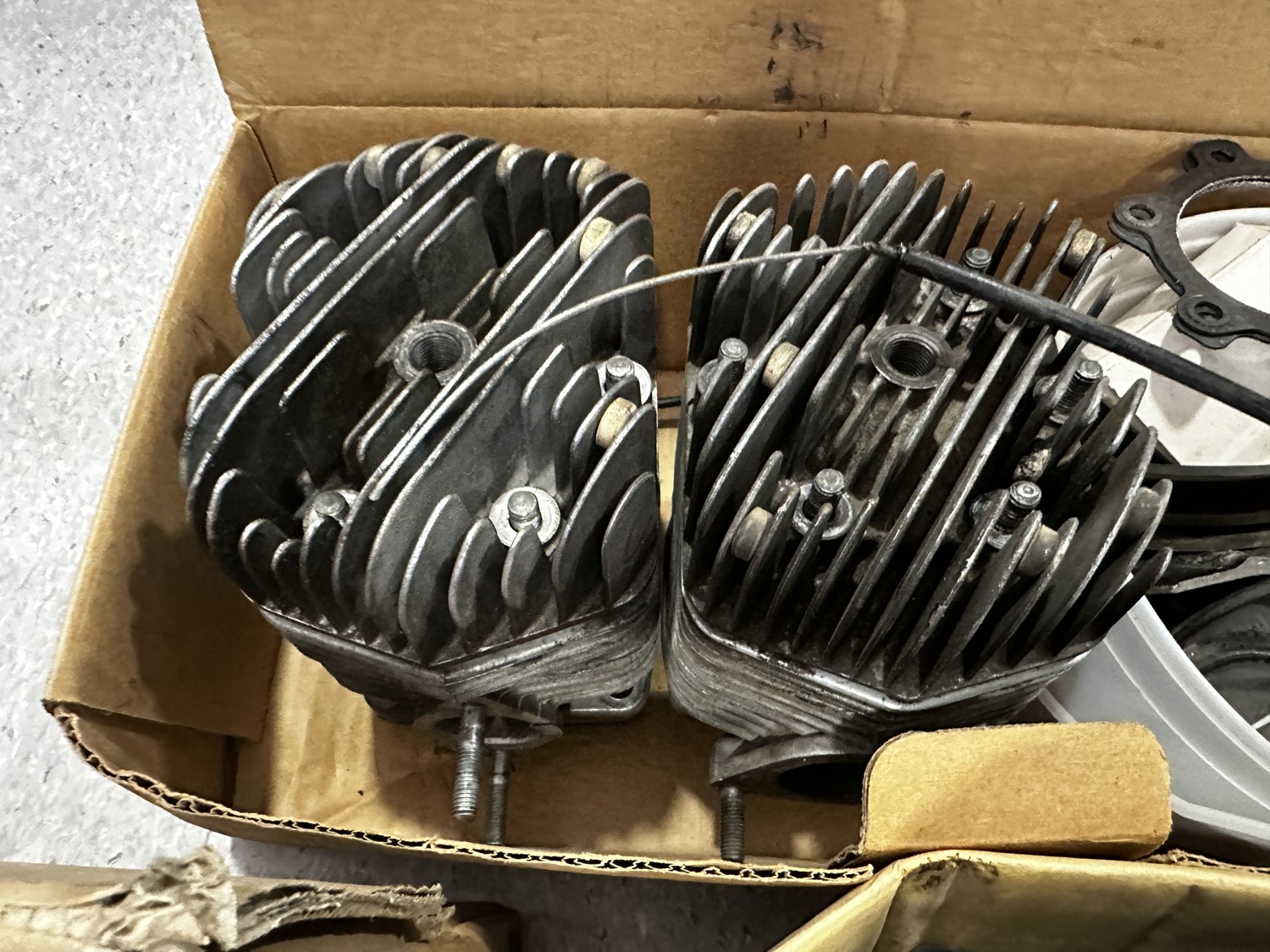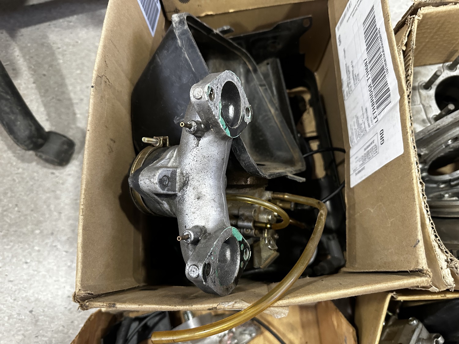 Boxes include, crank shaft, crank case, spark plugs, 2 cylinder exhaust manifold, intake manifold, miscellaneous gaskets, throttle cable, gas tank, (3) carburetors, Capacitor Discharge Ignition, engine cooling fan housing, belt wheel, (3) cylinder heads, electric clutch, miscellaneous plastics