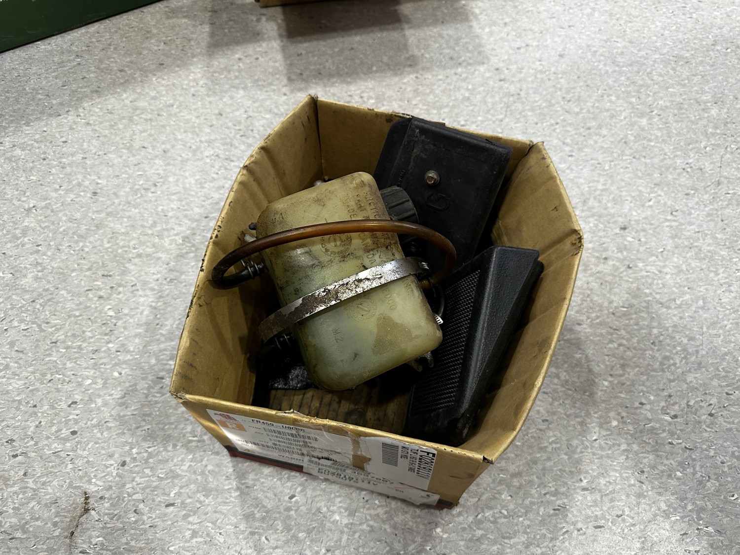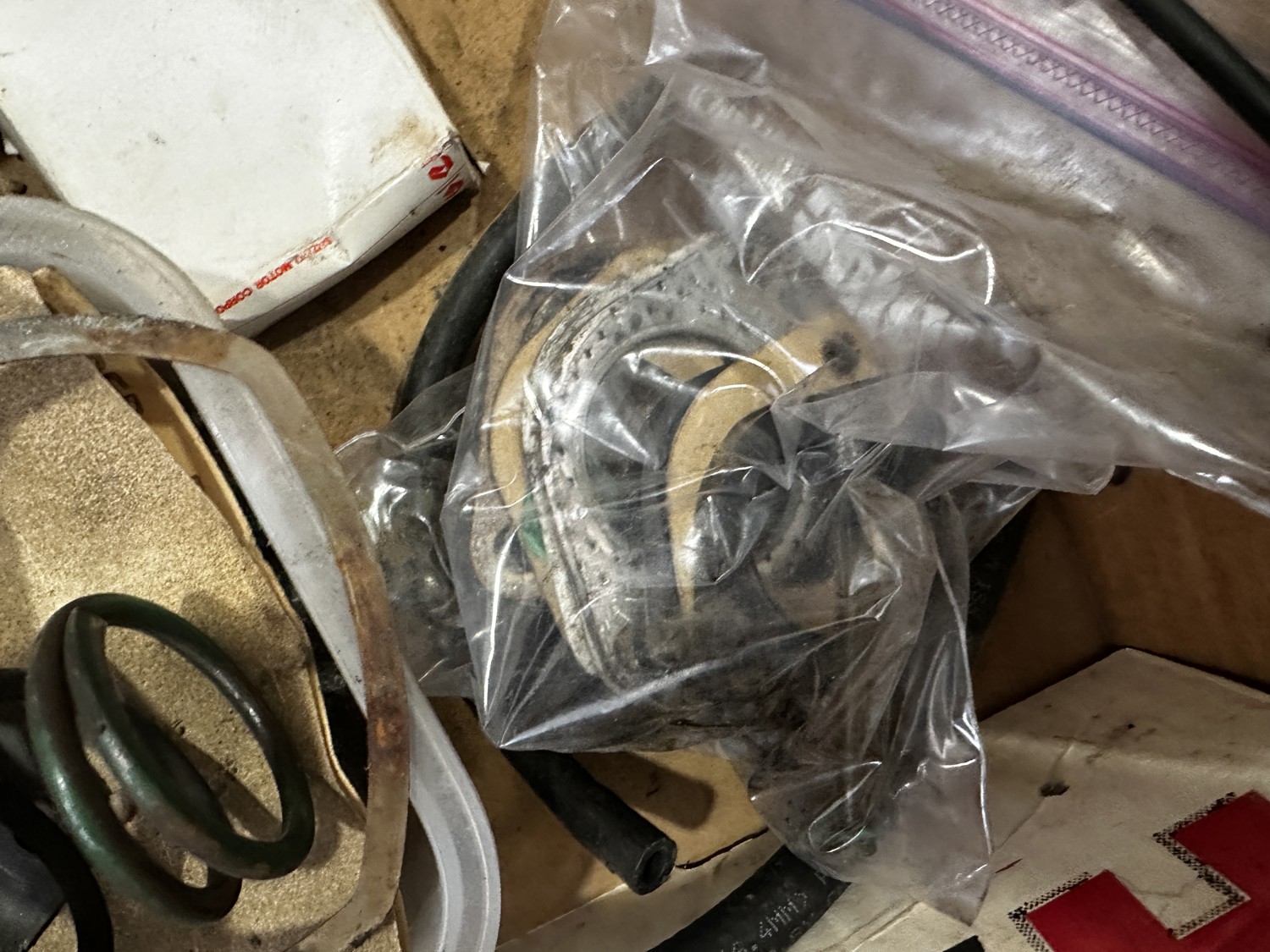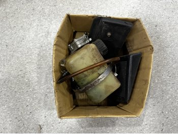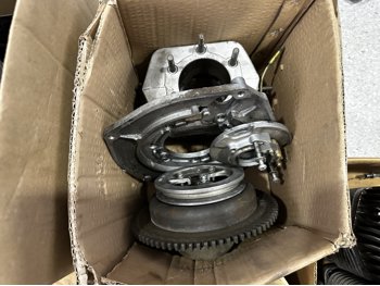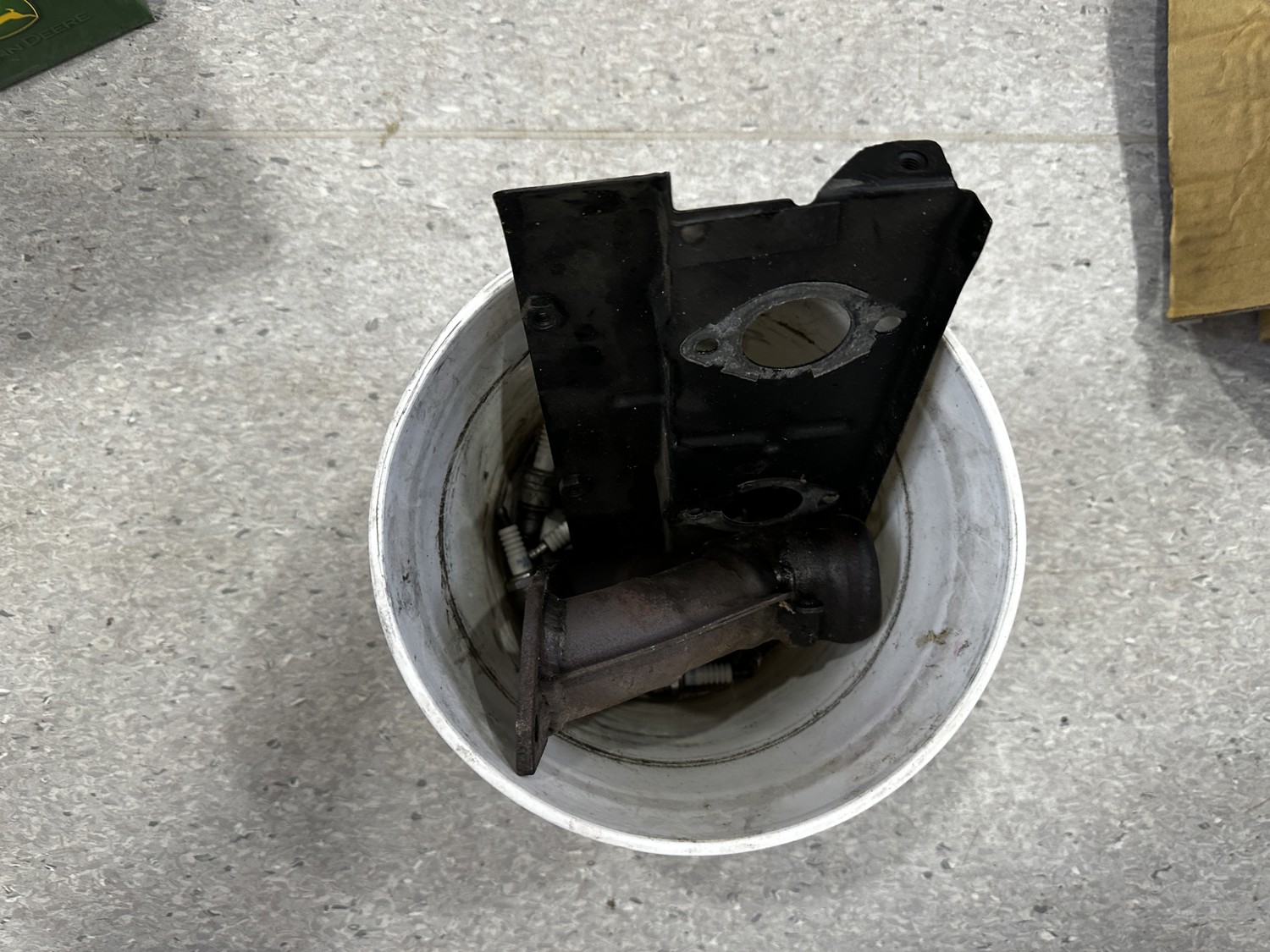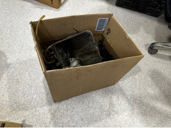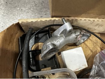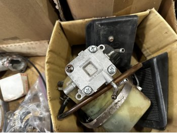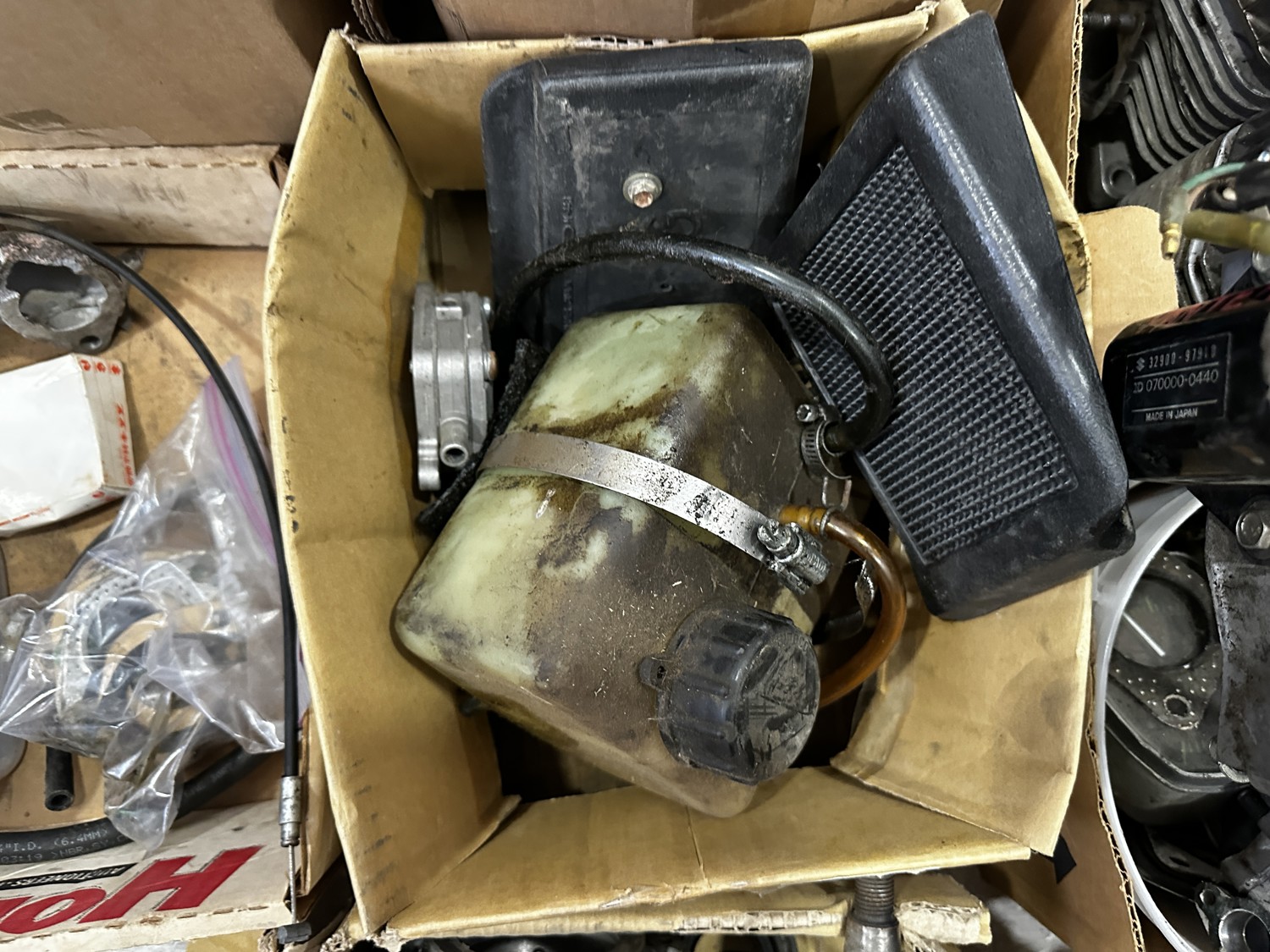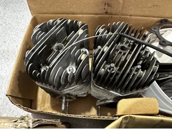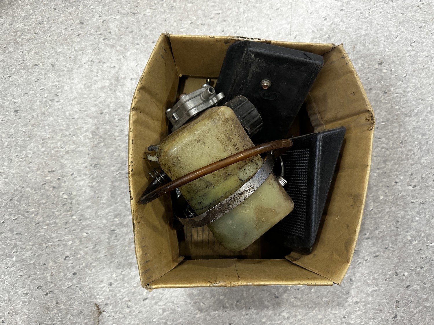 Boxes include, crank shaft, crank case, spark plugs, 2 cylinder exhaust manifold, intake manifold, miscellaneous gaskets, throttle cable, gas tank, (3) carburetors, Capacitor Discharge Ignition, engine cooling fan housing, belt wheel, (3) cylinder heads, electric clutch, miscellaneous plastics