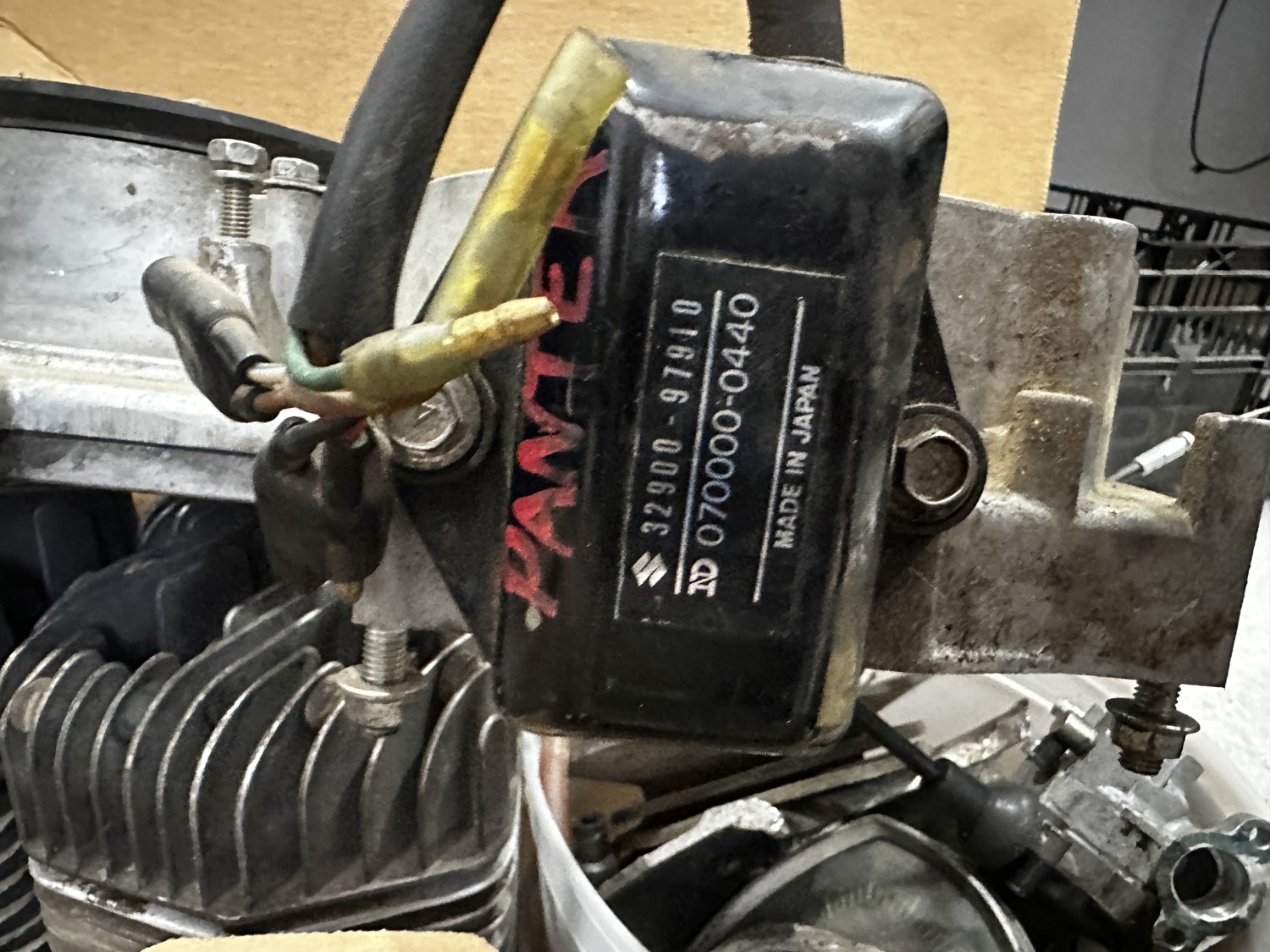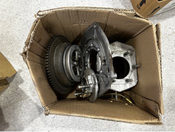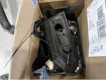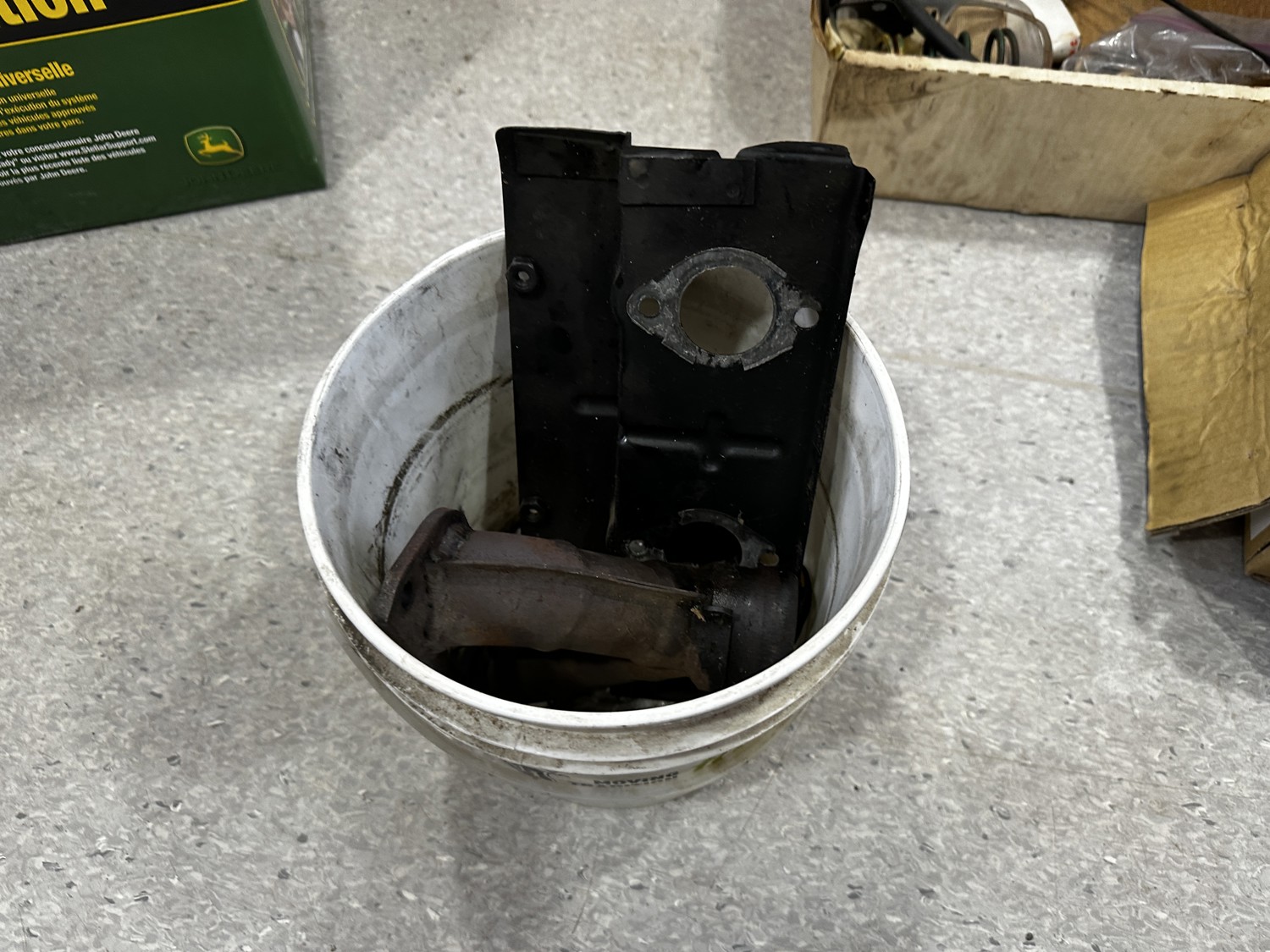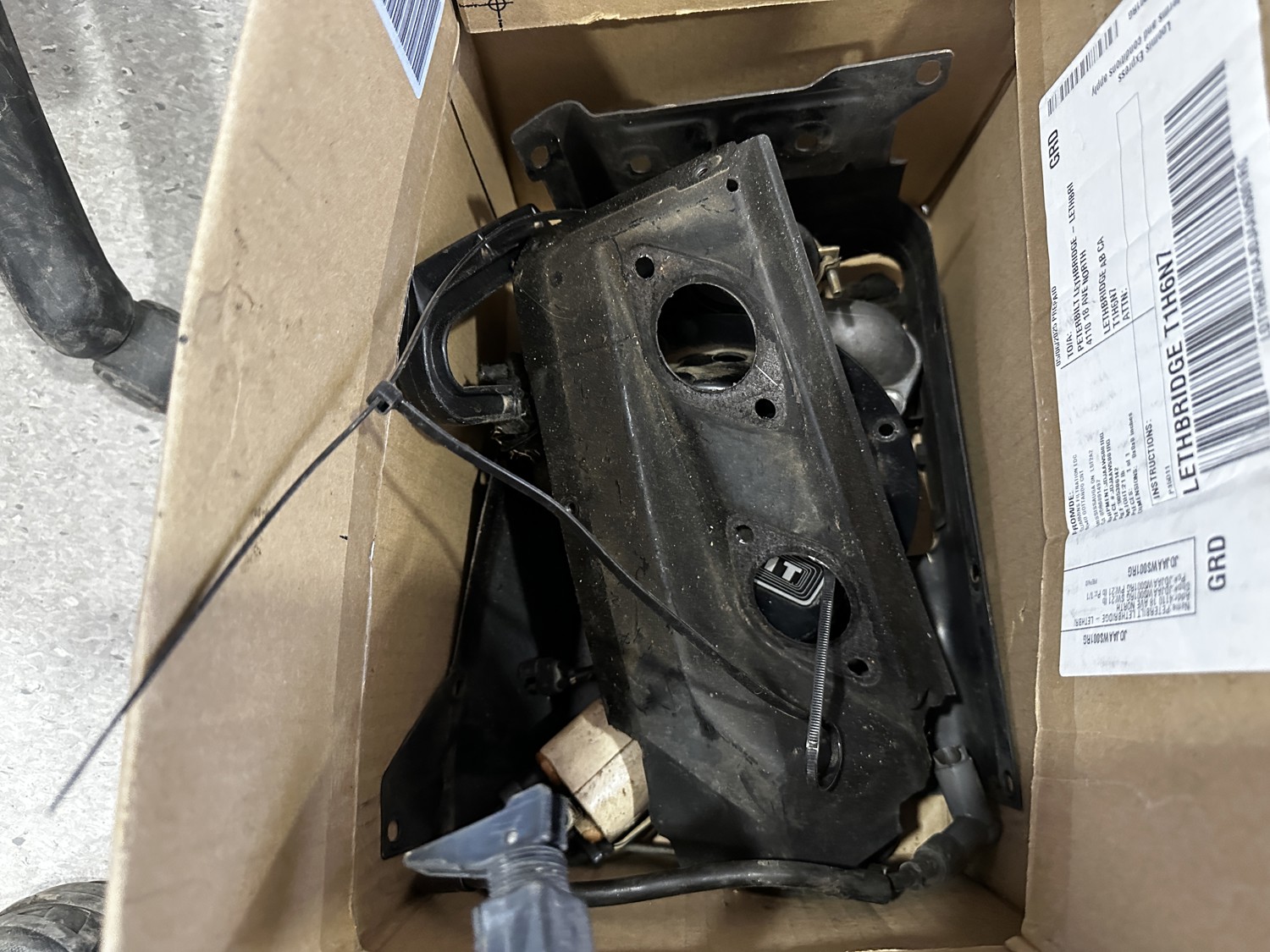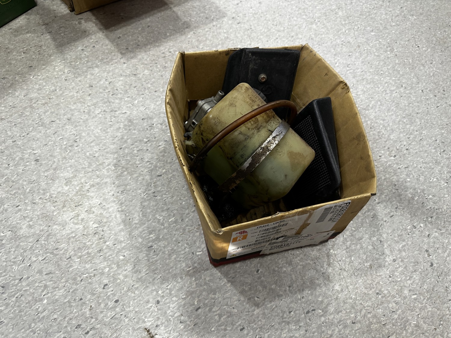 Boxes include, crank shaft, crank case, spark plugs, 2 cylinder exhaust manifold, intake manifold, miscellaneous gaskets, throttle cable, gas tank, (3) carburetors, Capacitor Discharge Ignition, engine cooling fan housing, belt wheel, (3) cylinder heads, electric clutch, miscellaneous plastics