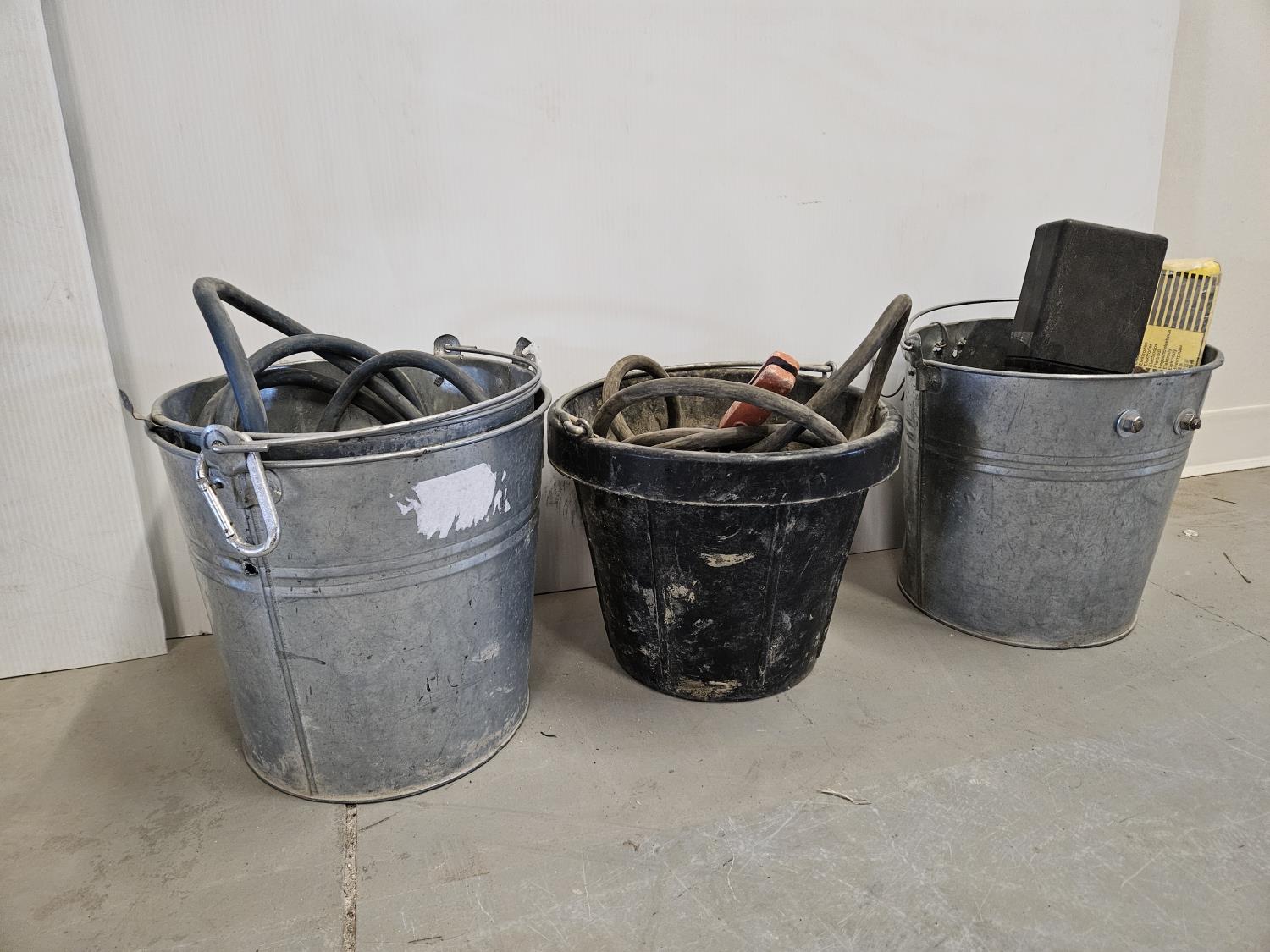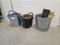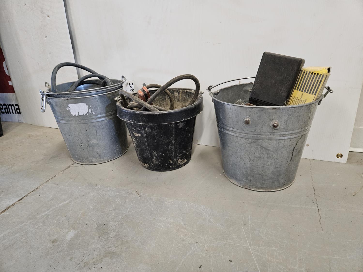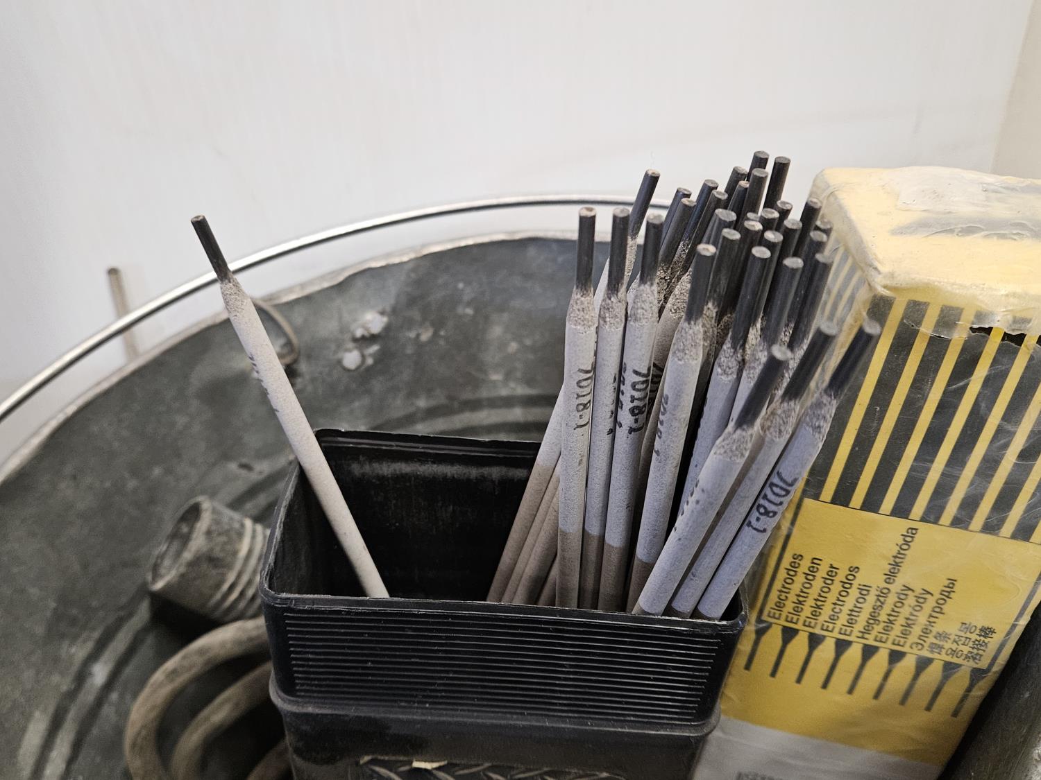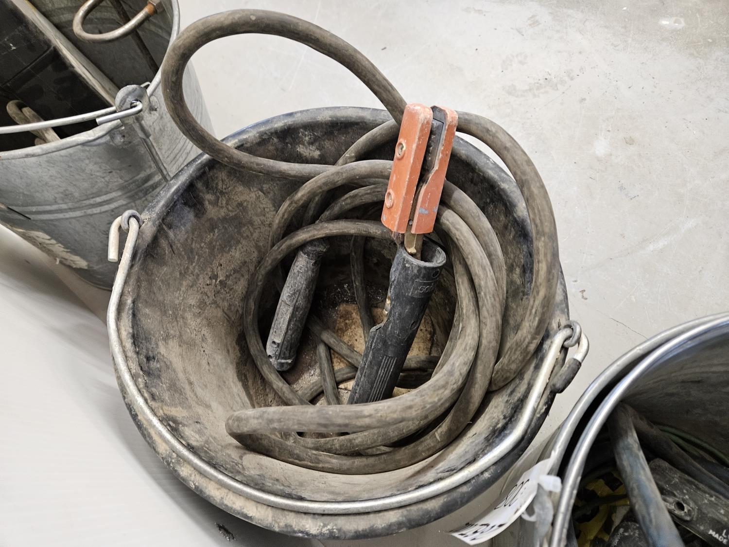 (3) metal pails, (1) rubber pail, Hobart 1/8 inch & esab welding rods, welding hoses with clamps