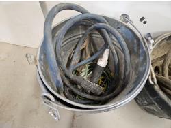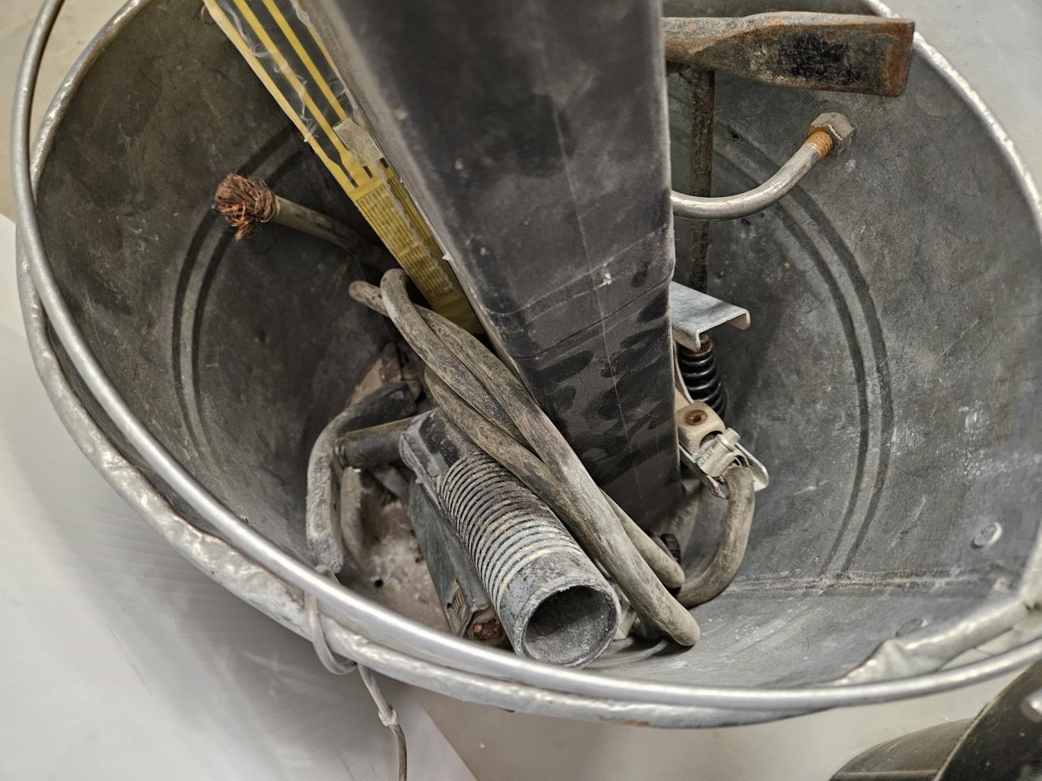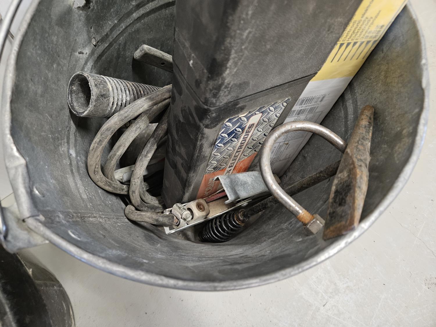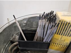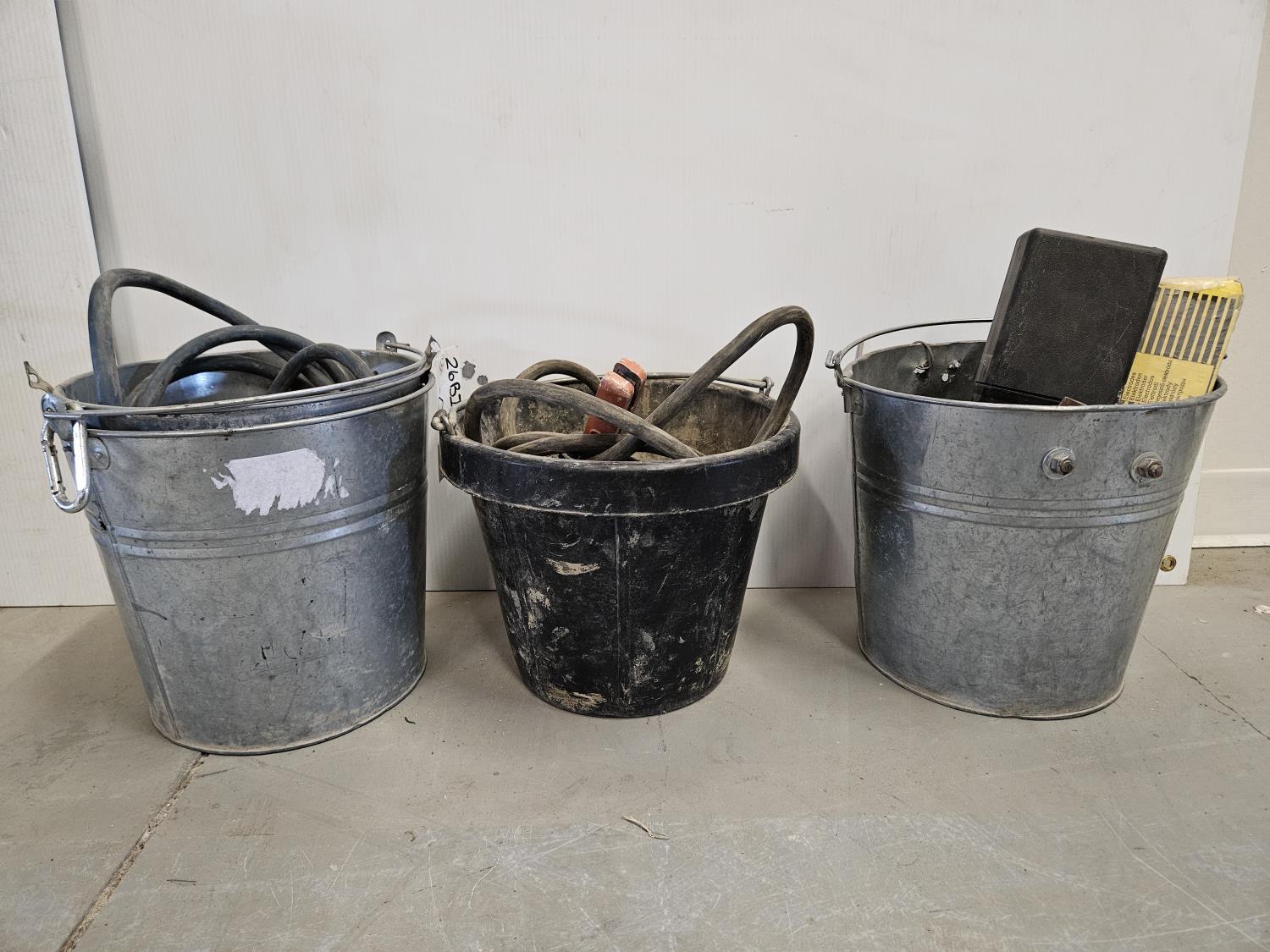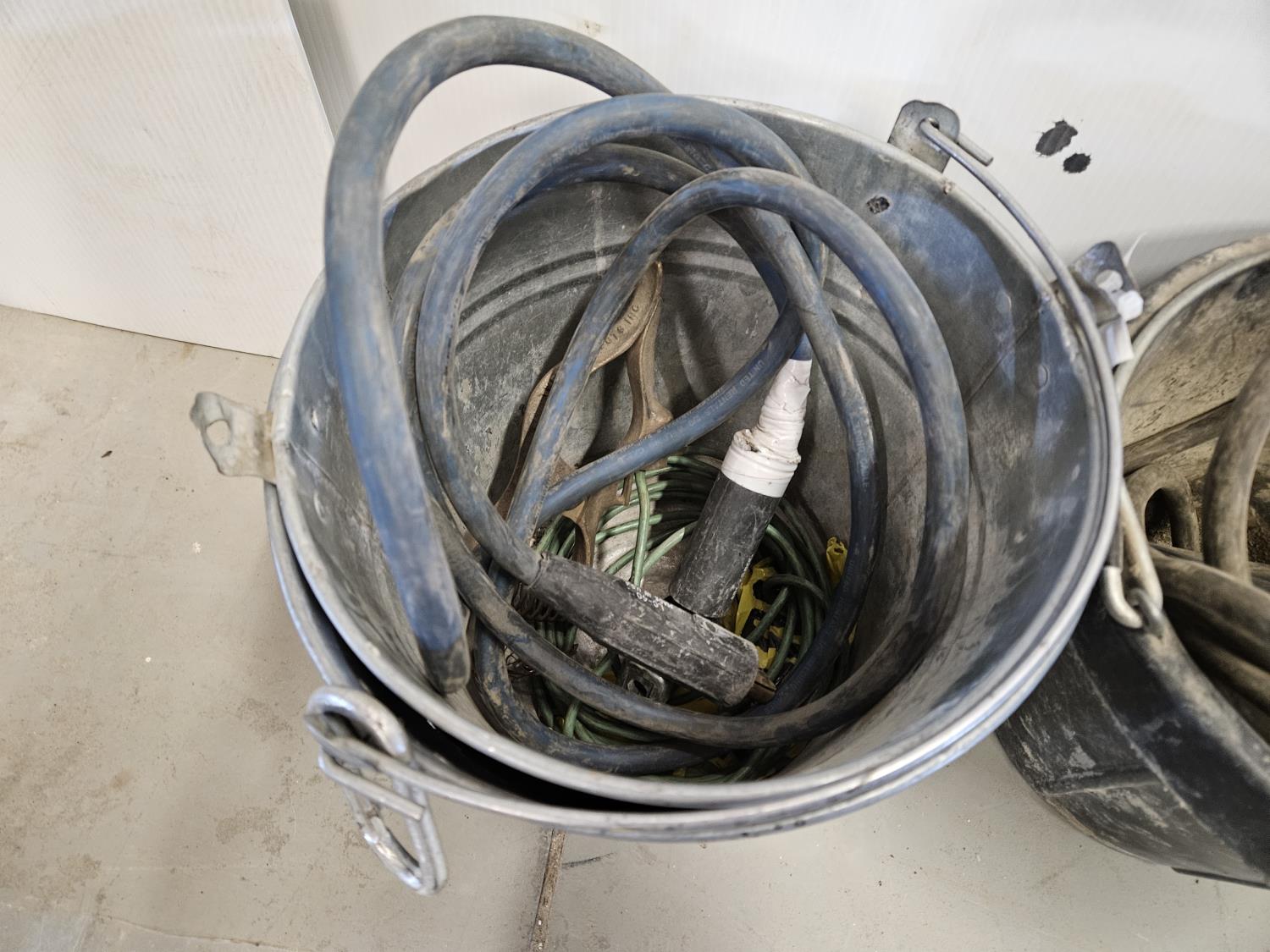 (3) metal pails, (1) rubber pail, Hobart 1/8 inch & esab welding rods, welding hoses with clamps