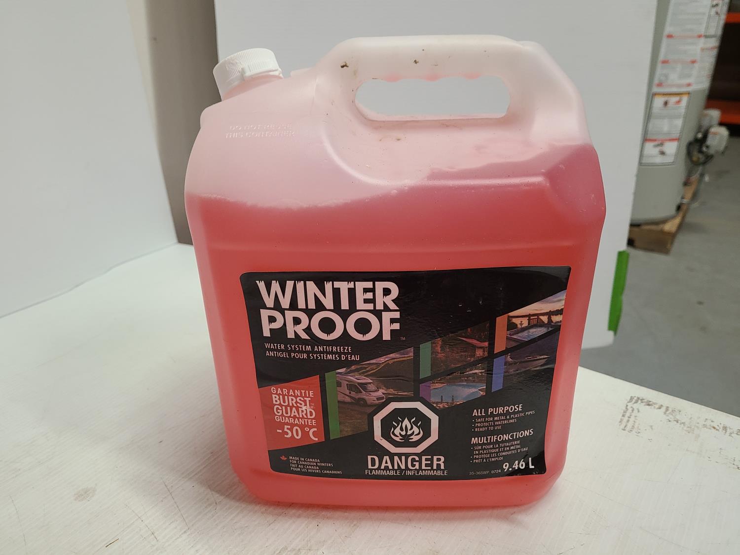 (4) 9.46L jugs of winter proof, (2) 3.78L jugs of winter proof, (1) 9.46L motomaster DEF, (1) 3.78L Solvable paint thinner