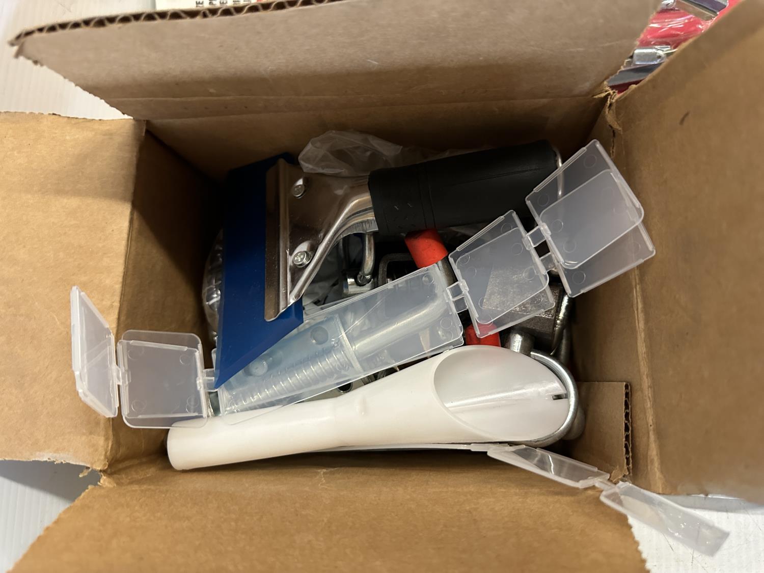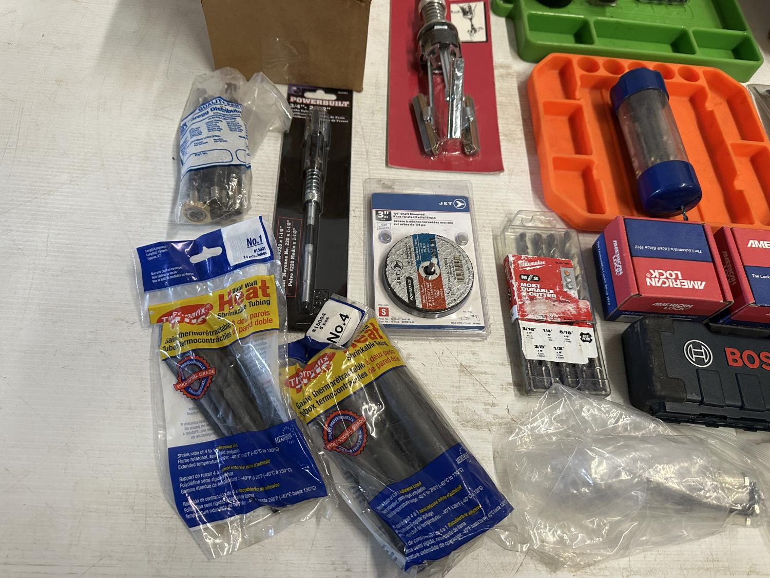 shrinkable tubing, drill bits, (2) American locks, inline pressure regulator, 1/4 inch air hose swivel connectors, Husky tool belt