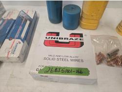 Qty of 1/8 inch aluminum rods, (2) boxes of 7018-3/32 welding rods, (2) rod containers, (1). 035 mig wire, Mig tips, miscellaneous welding tools