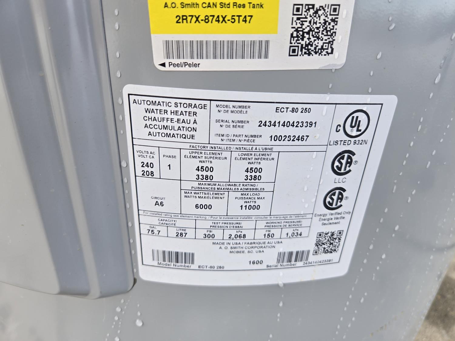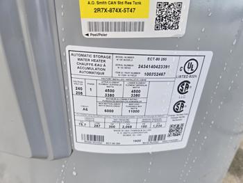 7126 AO Smith ECT-80-250 75 US Electric Gas Hot Water Heater (Unused)