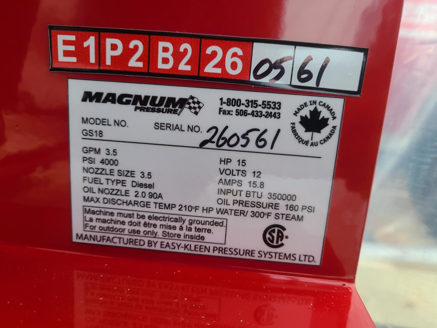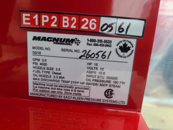 3.5 GPM at 4000 PSI, 15 HP, gasoline engine, electric start, 12 volt burner, oil/diesel fired burned/thermostat, schedule 80 coil with stainless steel housing, fully welded, powder coated frame, 10 gallon poly fuel tank, 30 ft hose and wand