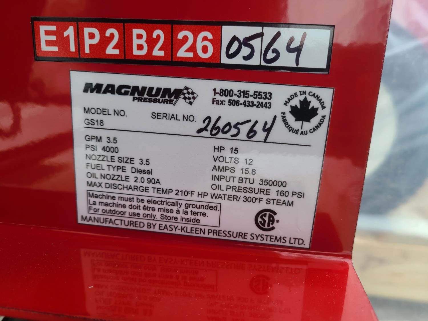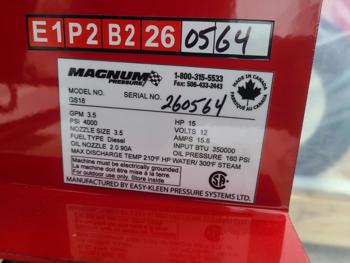 3.5 GPM at 4000 PSI, 15 HP, gasoline engine, electric start, 12 volt burner, oil/diesel fired burned/thermostat, schedule 80 coil with stainless steel housing, fully welded, powder coated frame, 10 gallon poly fuel tank, 30 ft hose and wand