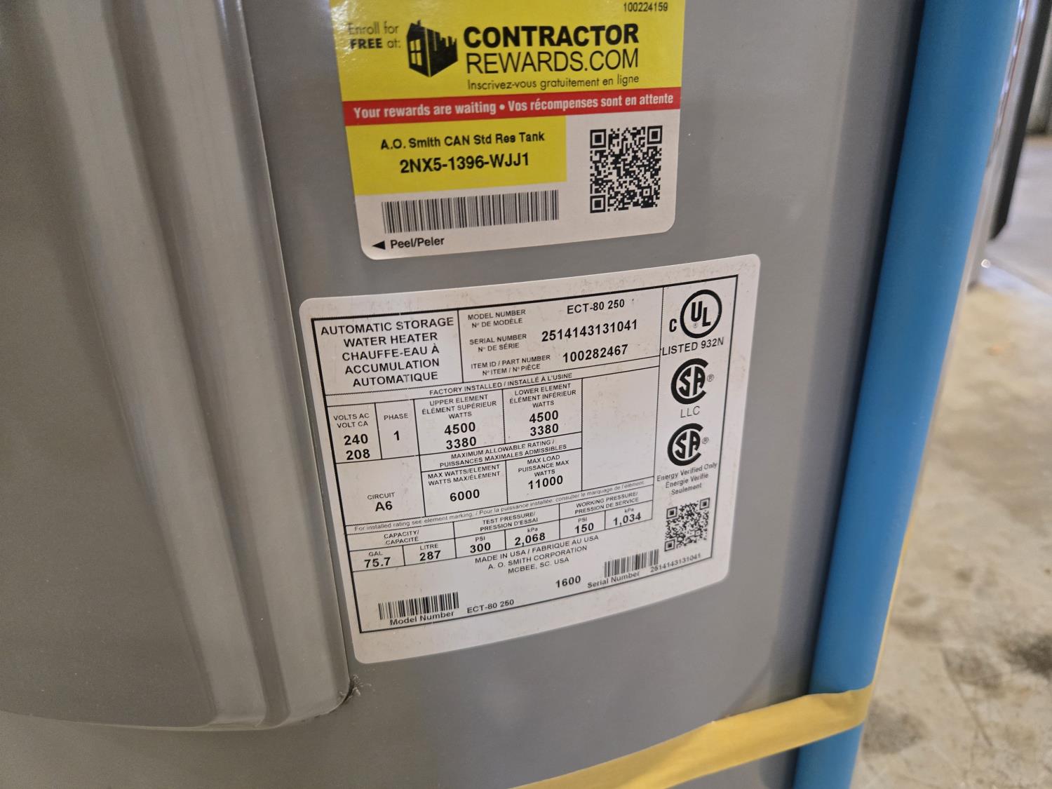7117 AO Smith ECT-80-250 Electric Hot Water Heater (Unused)
