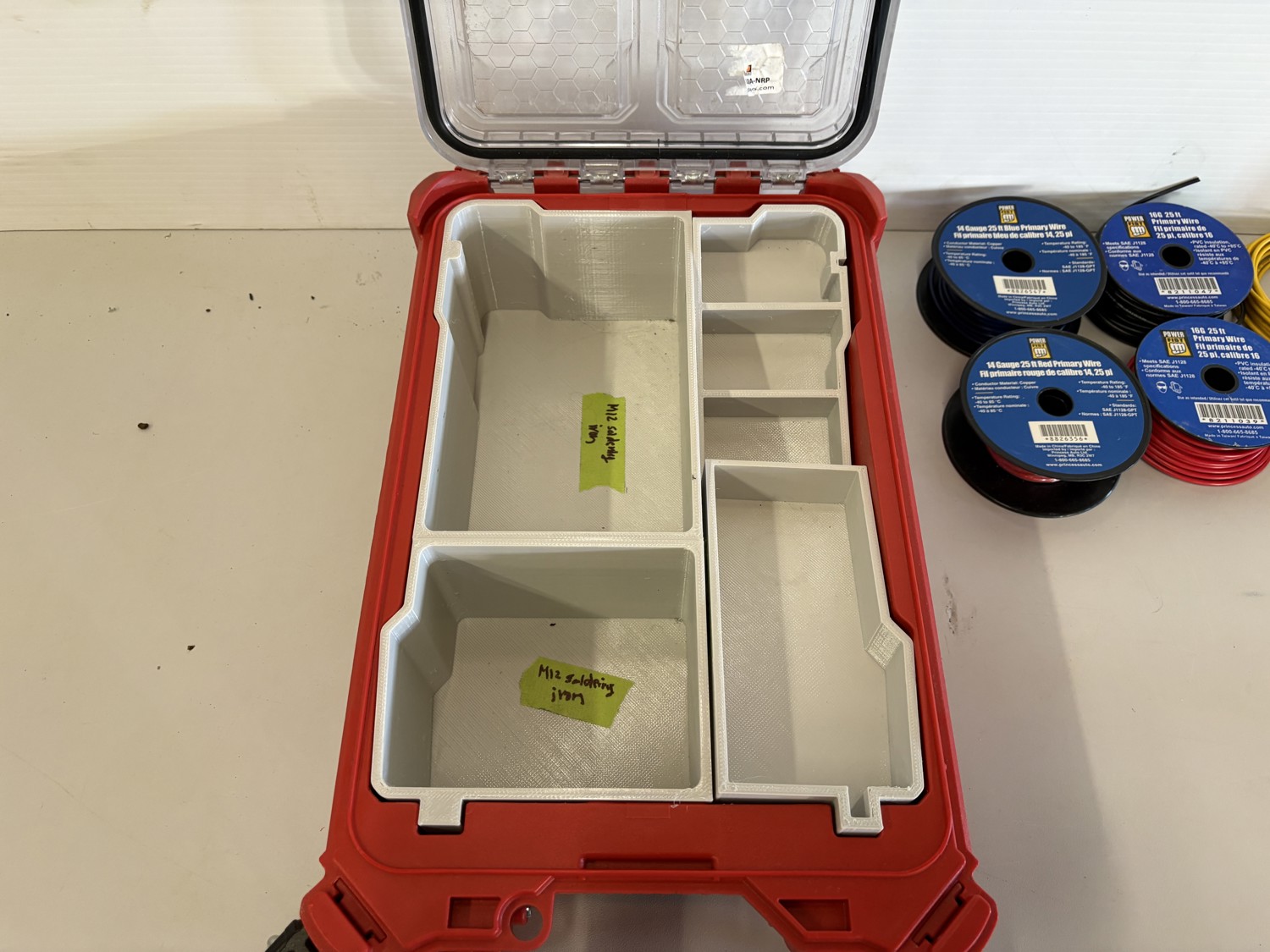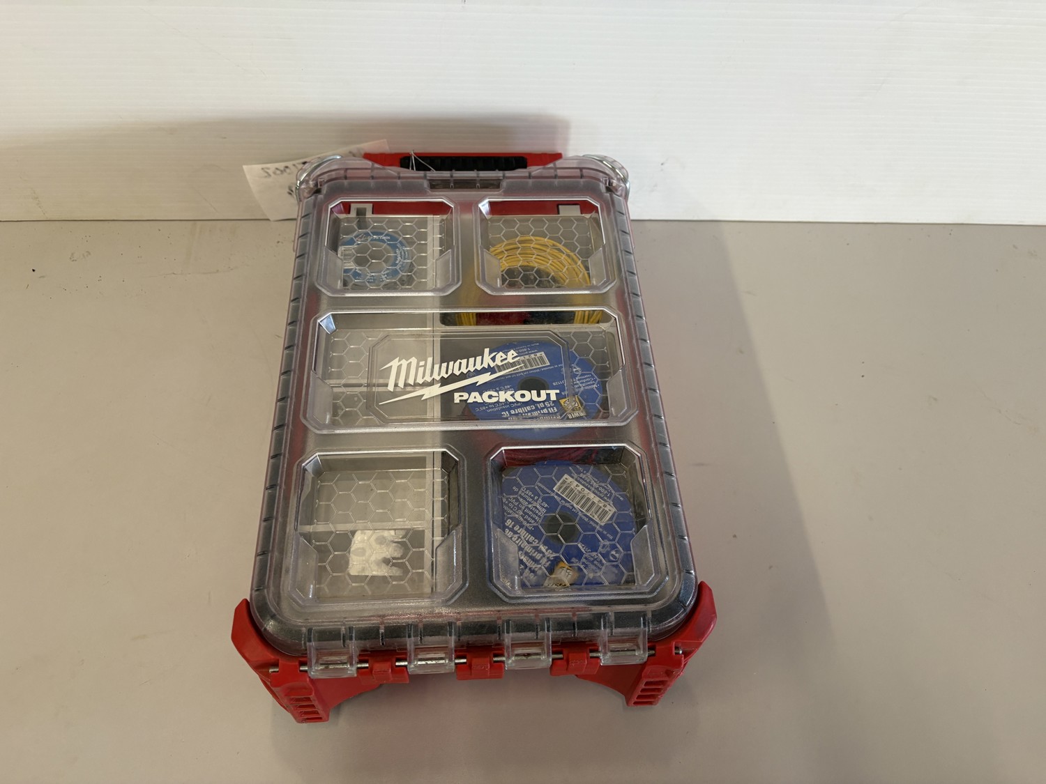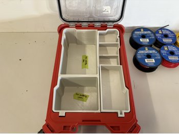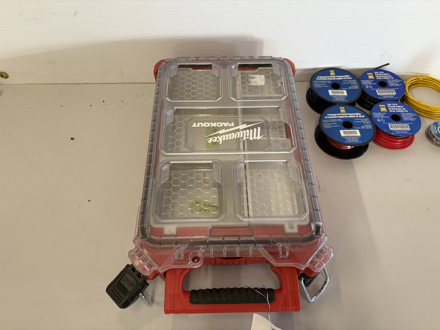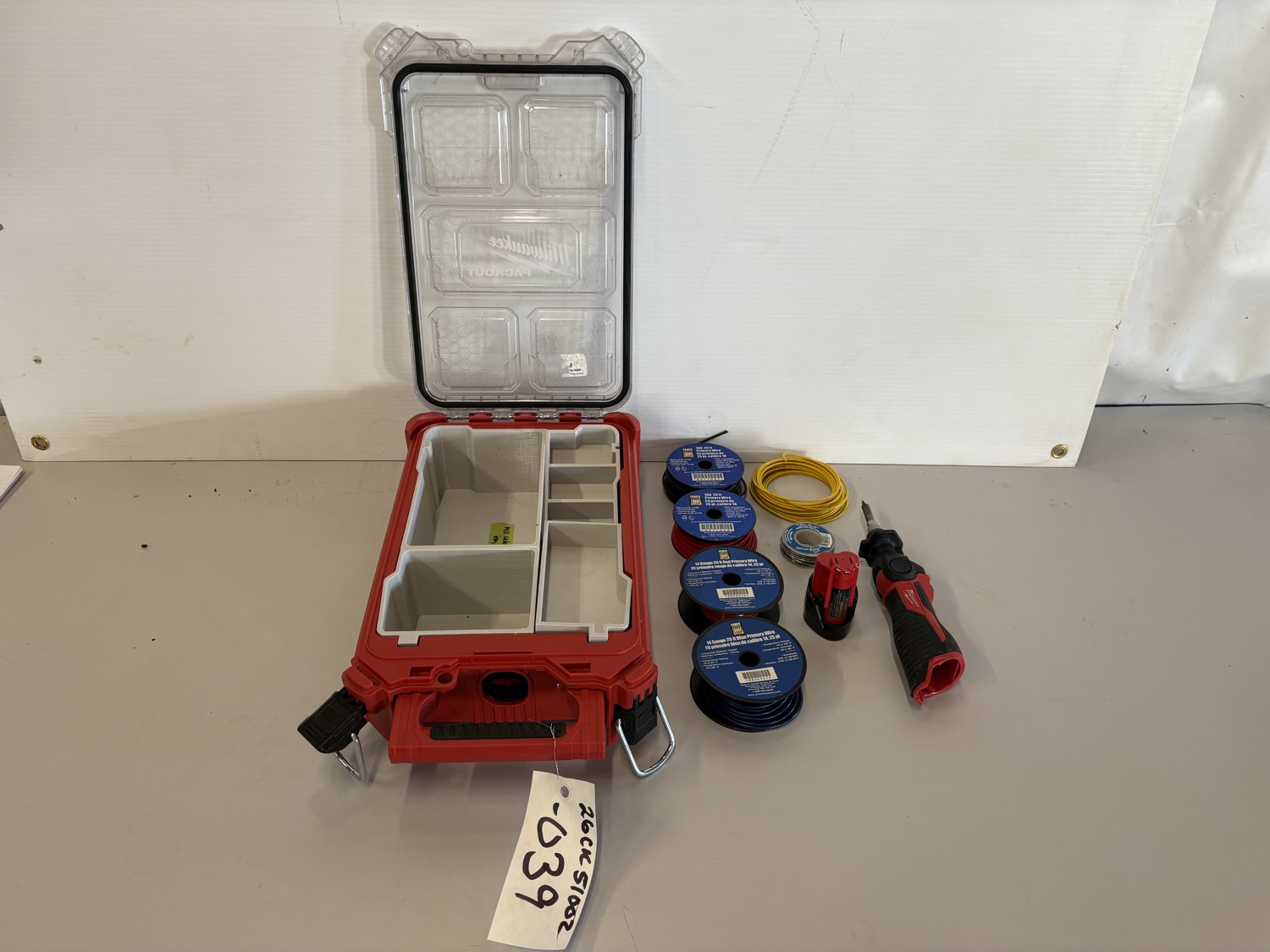 (1) milwaukee M12 battery, milwaukee packout tool case, qty of assorted wire,