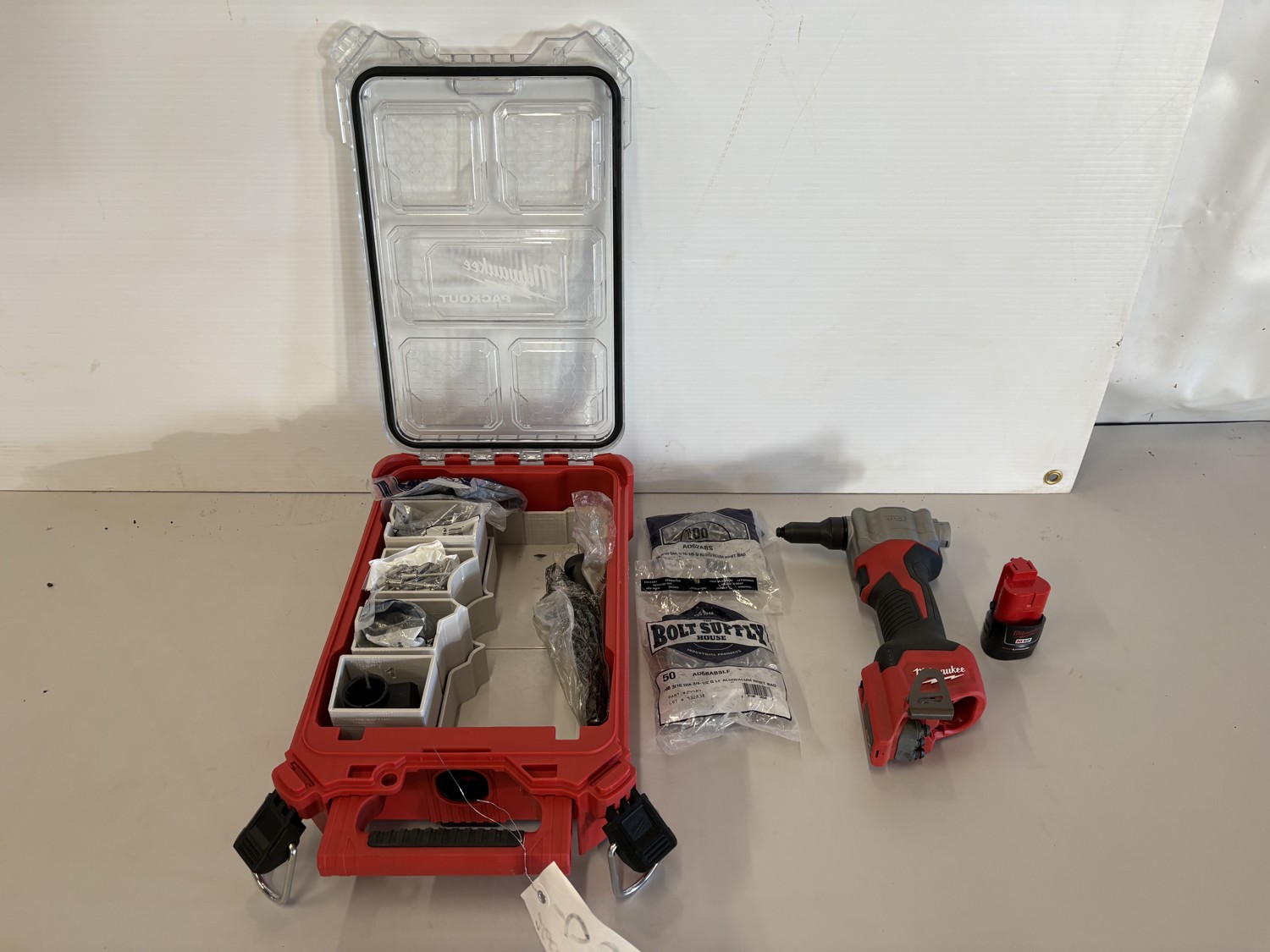 (1) milwaukee M12 battery, milwaukee packout tool case, assorted rivets