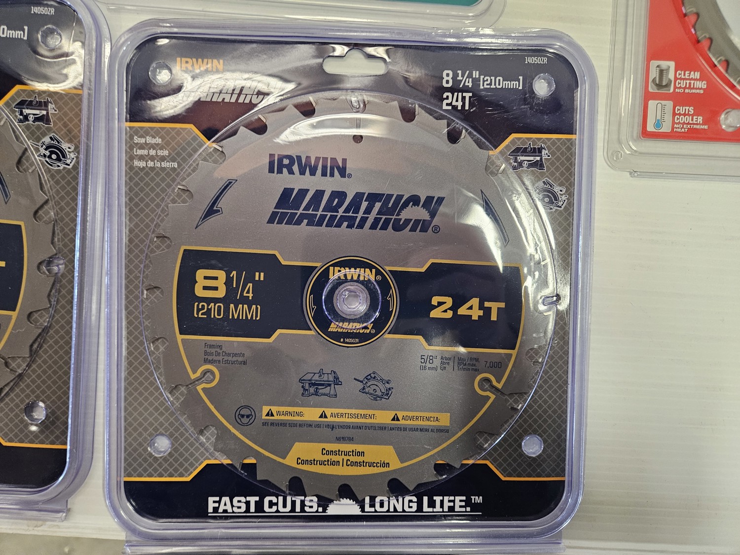 (5) Makita 7 inch diamond blade (2) Irwin marathon 8-1/4 inch (1) Milwaukee 8 inch stainless aluminum steel blade