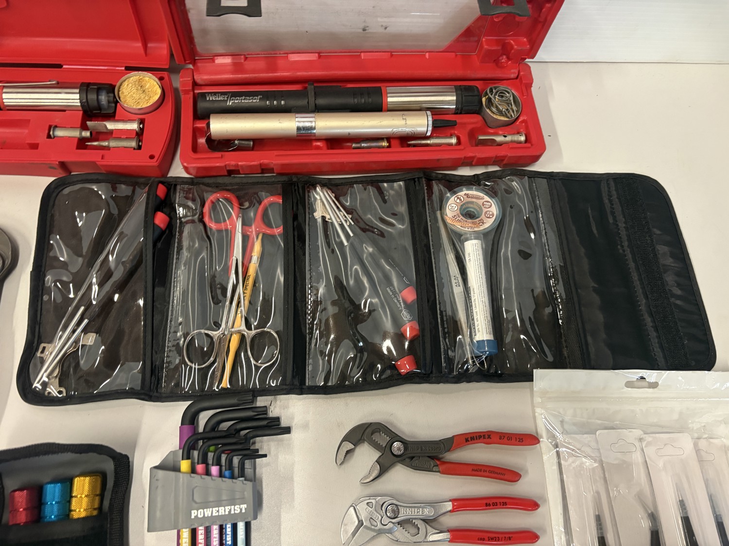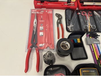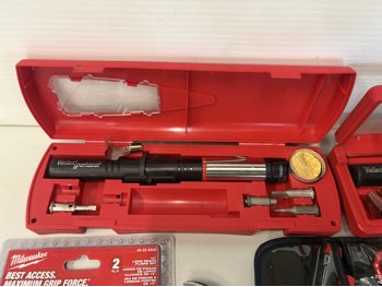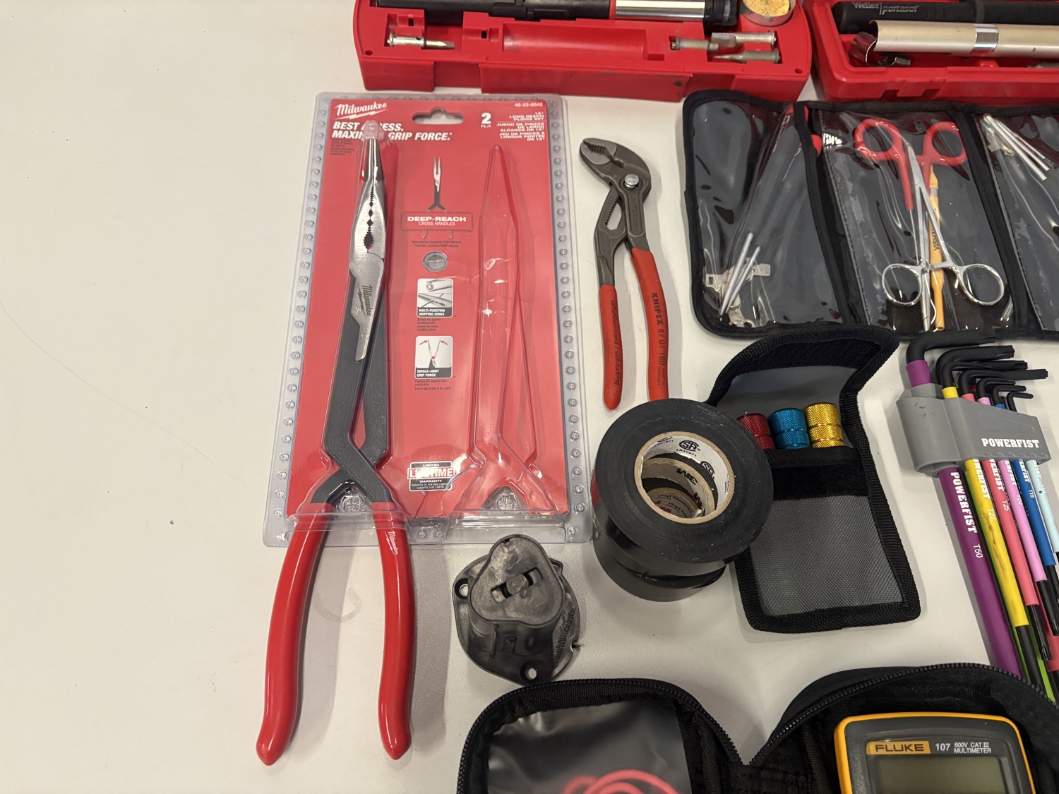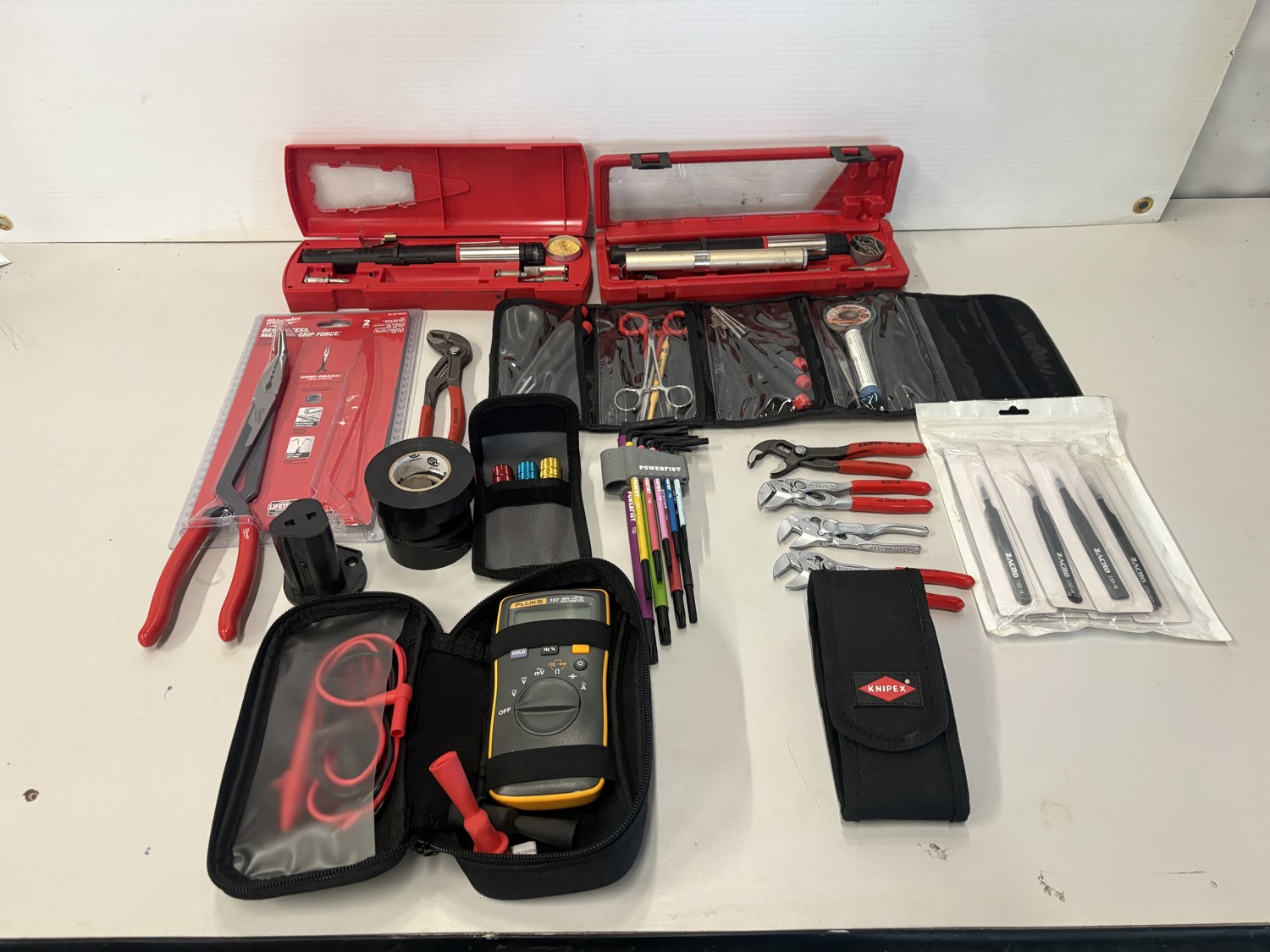 Milwaukee 13 inch long reach plyers, powerfist allen keys, fluke multimeter, picks, tape, (2) weller portasol PSI-100k