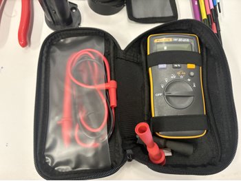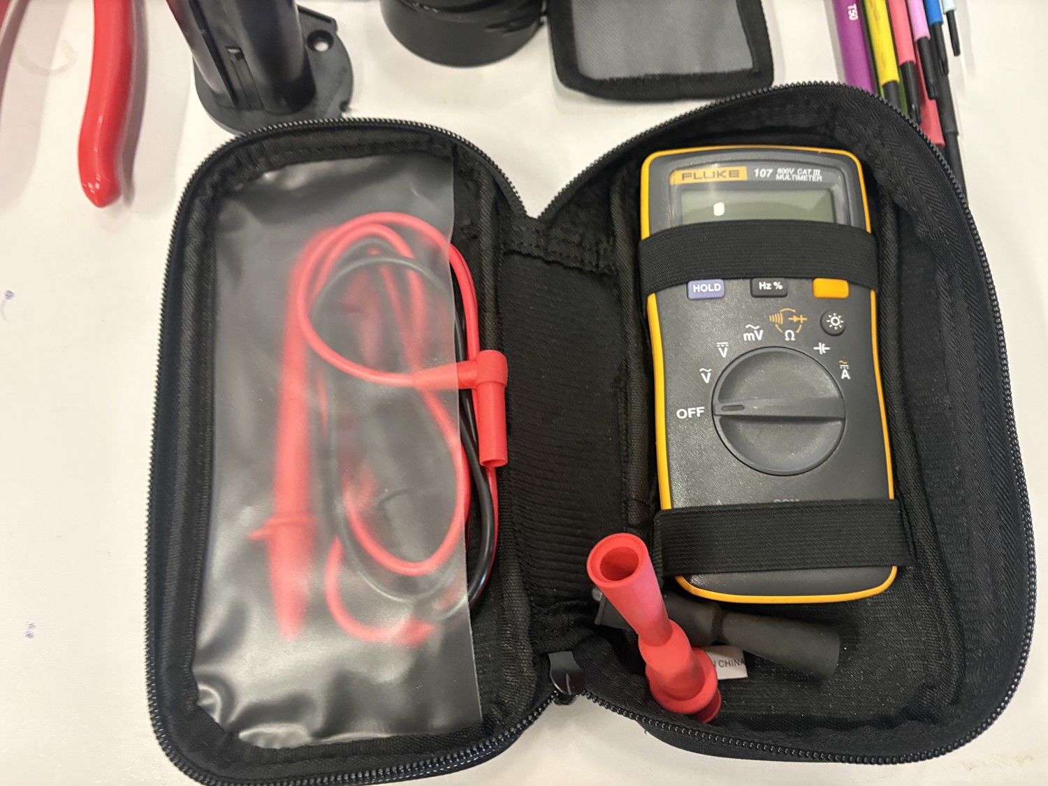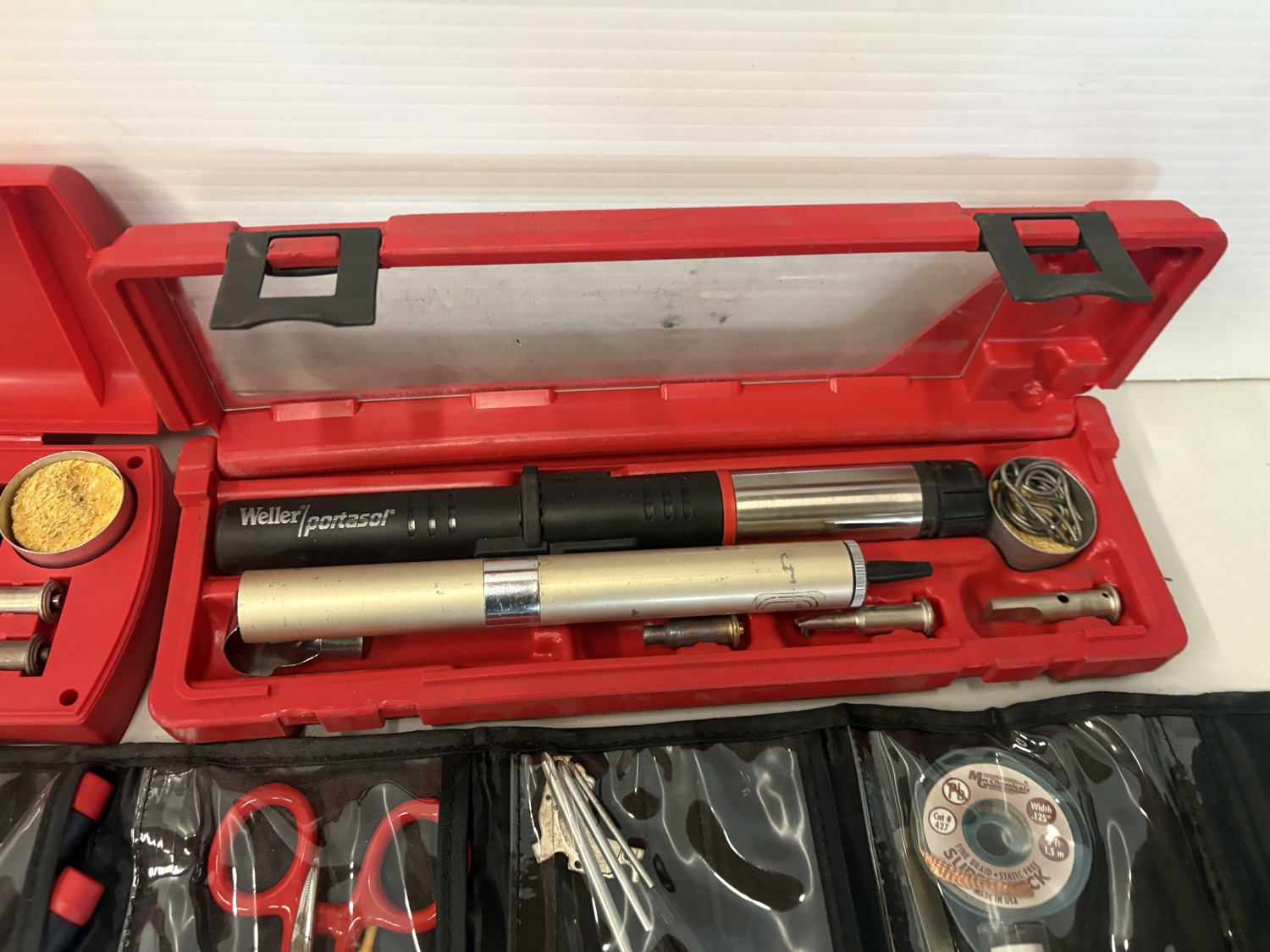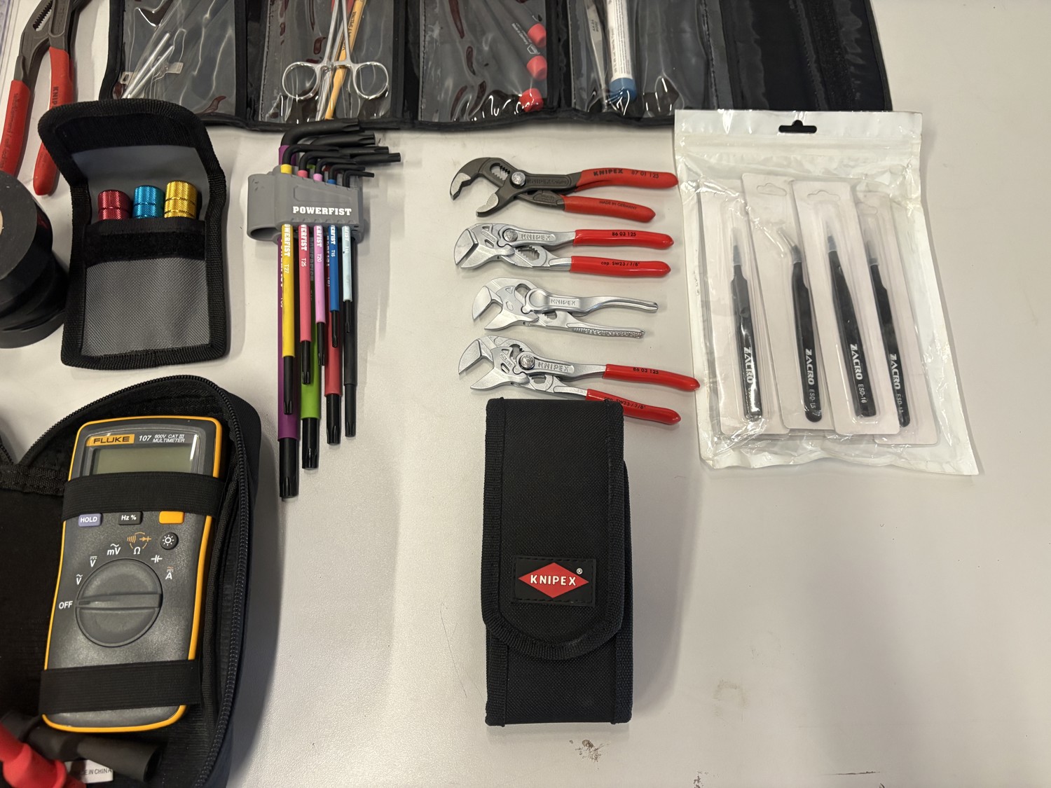 Milwaukee 13 inch long reach plyers, powerfist allen keys, fluke multimeter, picks, tape, (2) weller portasol PSI-100k