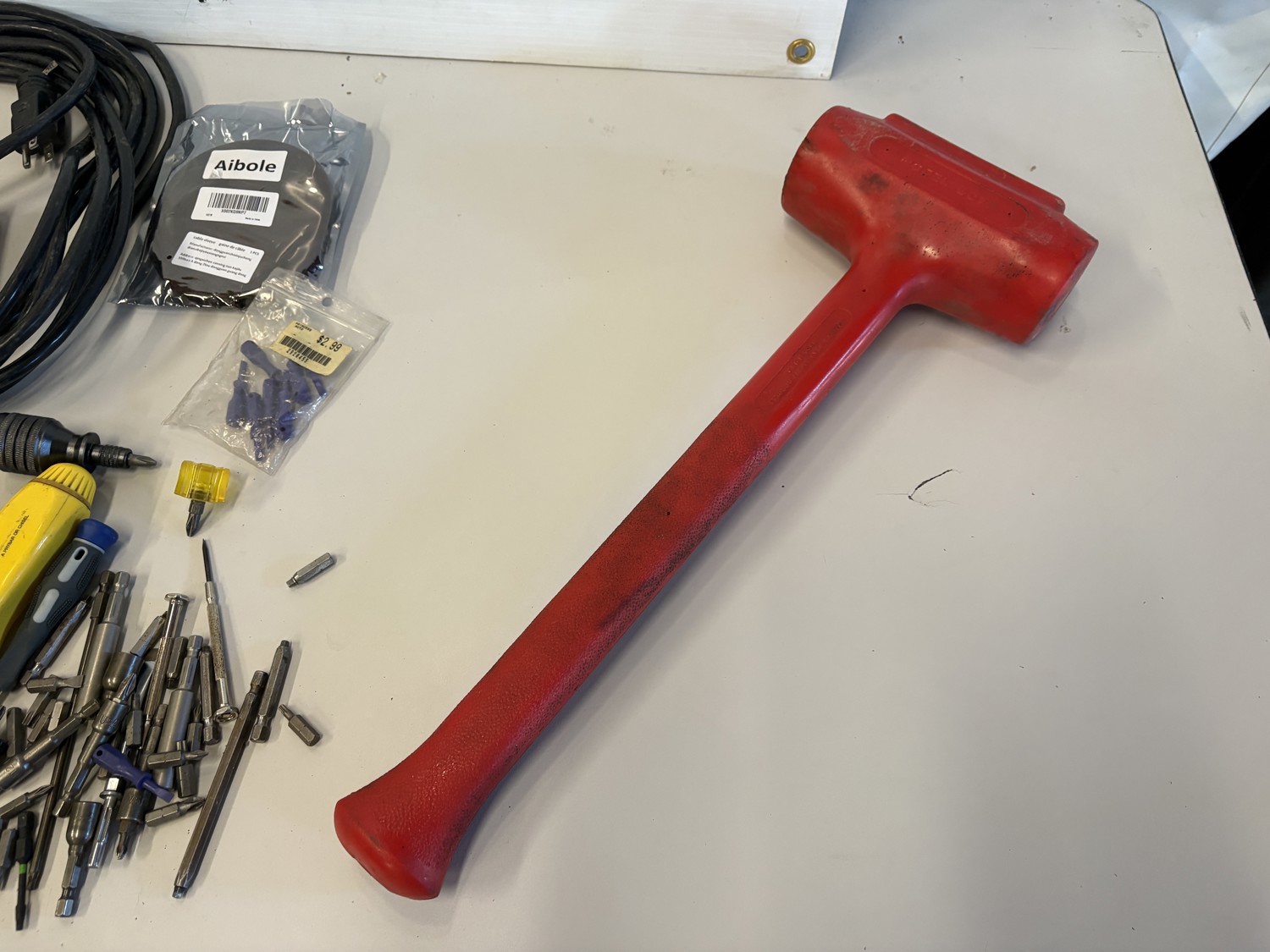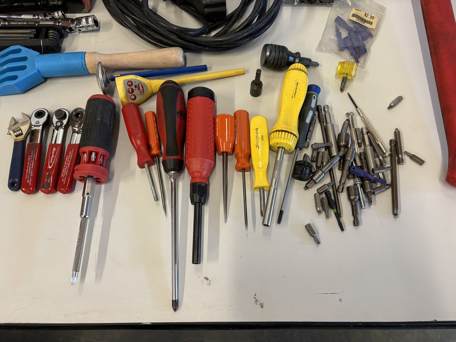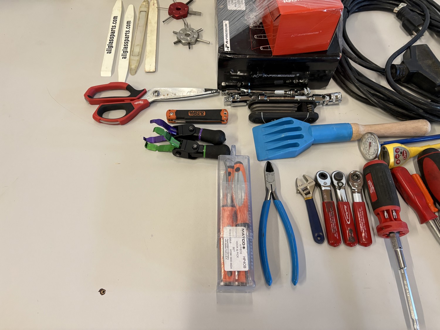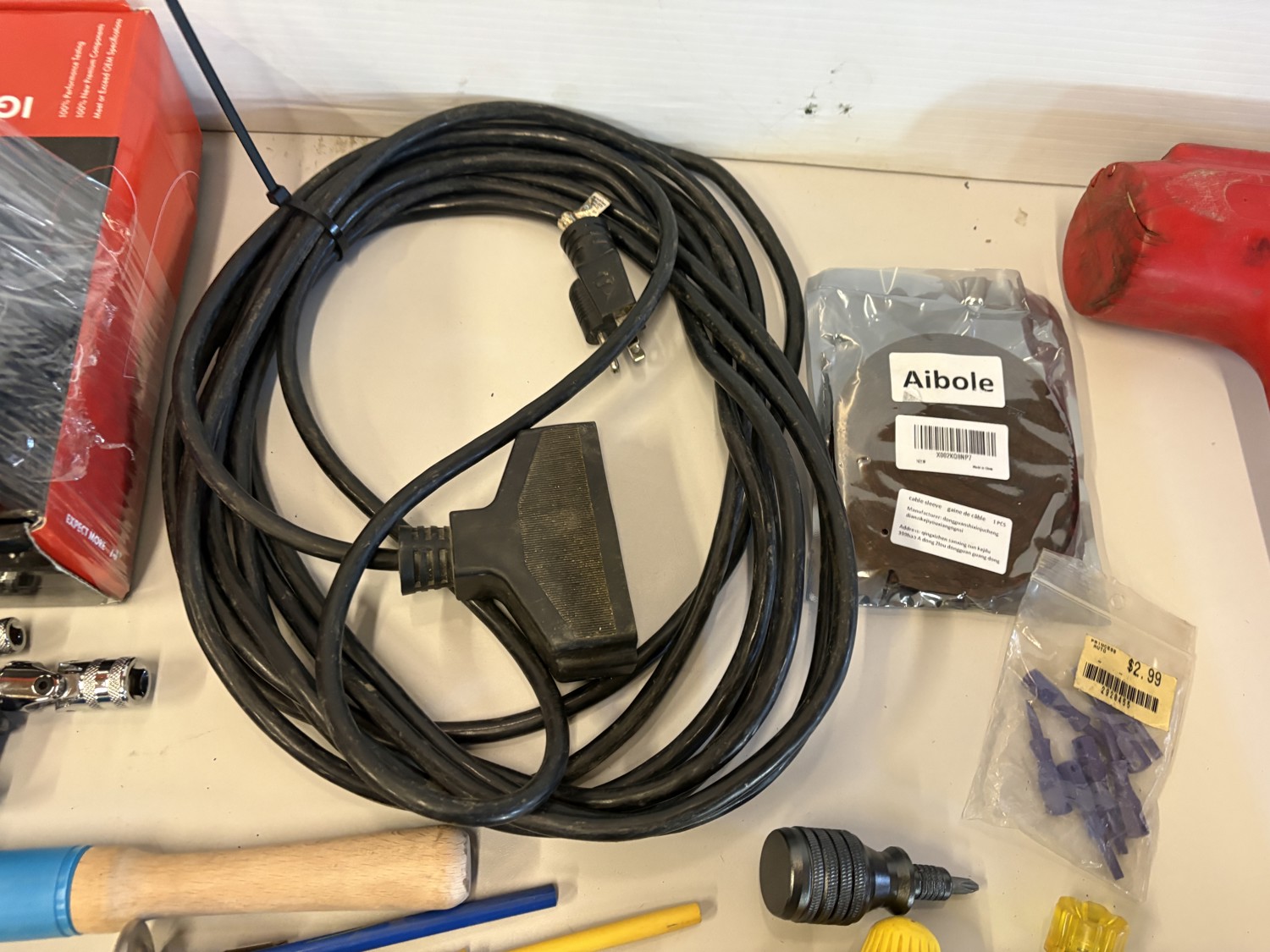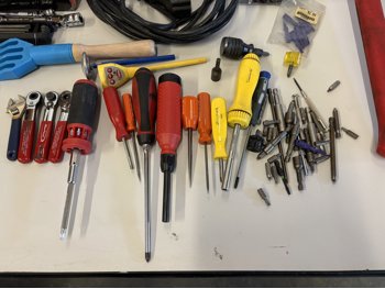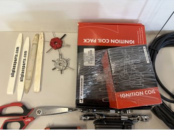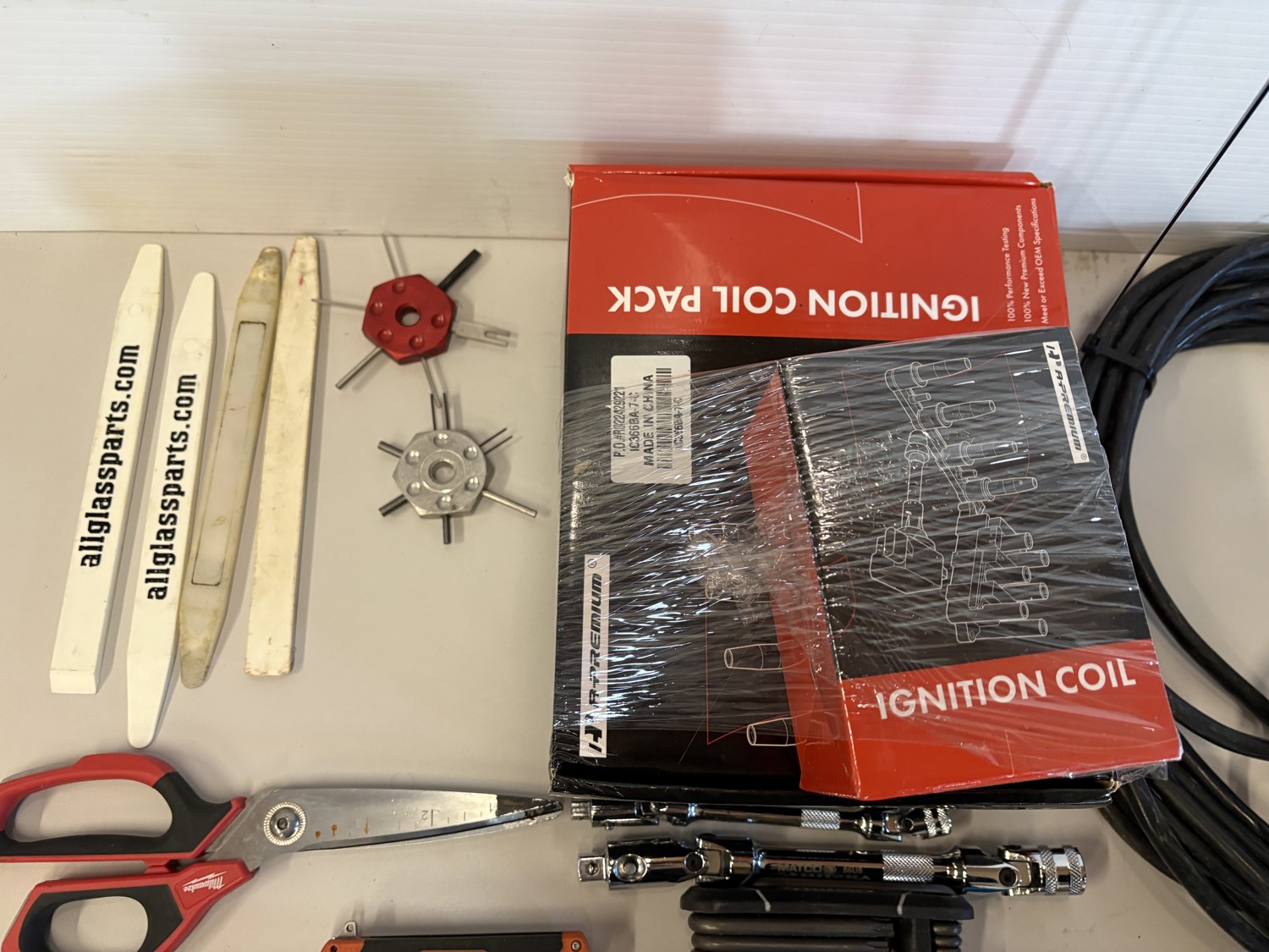 Screwdrivers, ratchets, hammer, extension cord, ignition coil pack kit for unknow vehicle