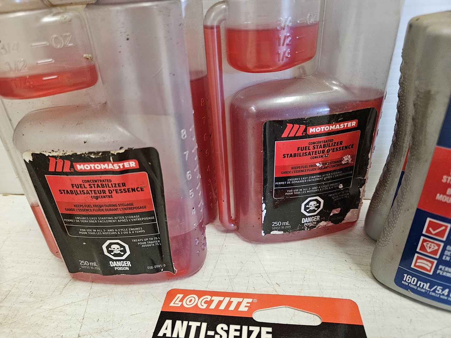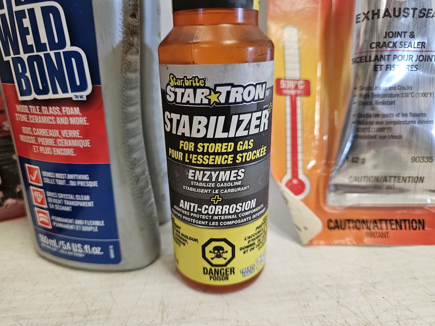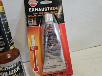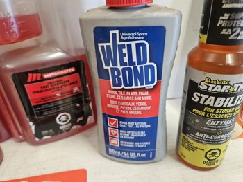 (1) Bio-circle cleaner and degreaser, (3) Motomaster fuel stabilizer, (9) Loctite anti-seize stick, (2) WeldBond adhesive, (1) star tron stabilizer, (6) versachem joint and crack sealer
