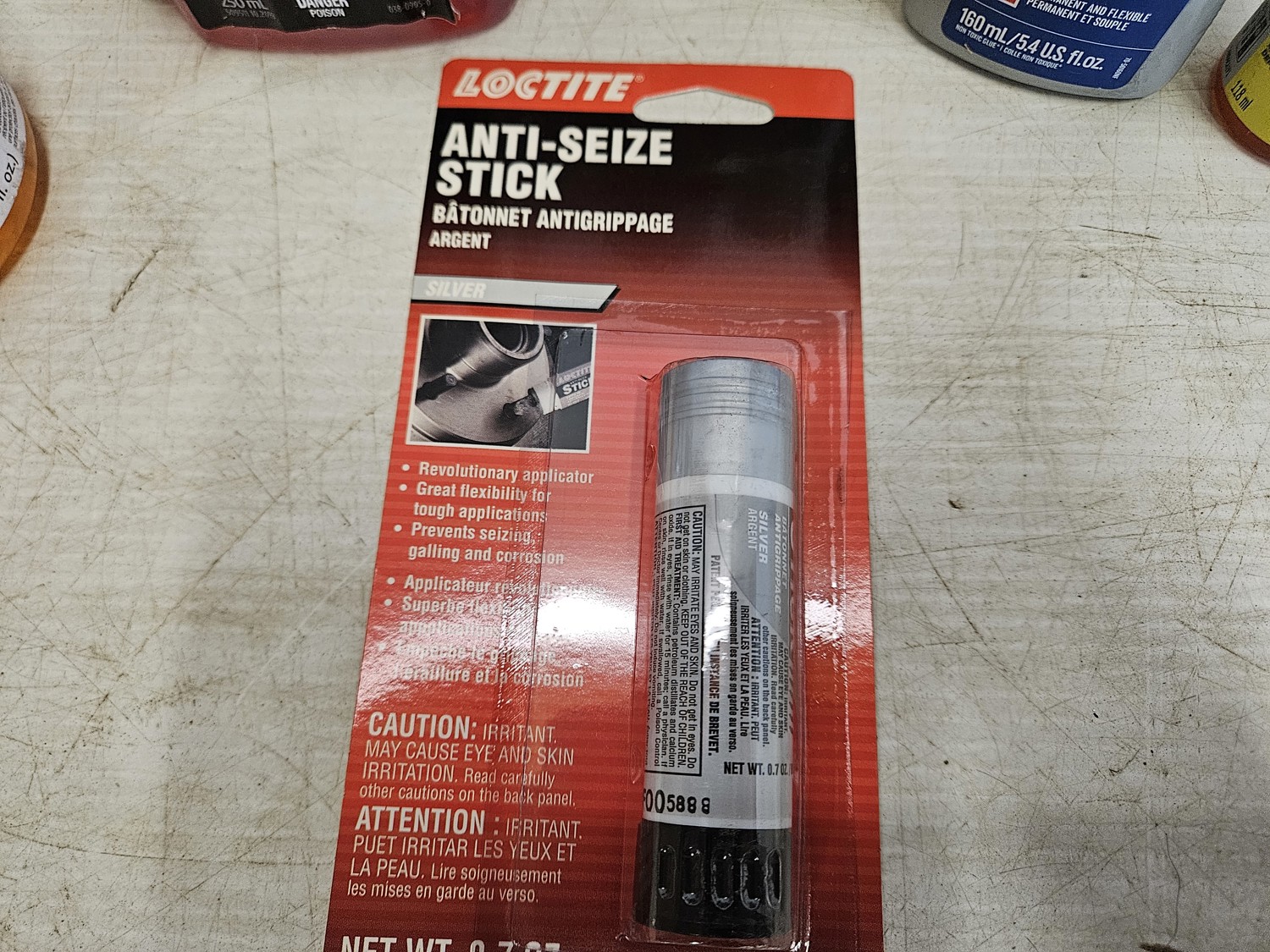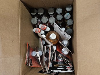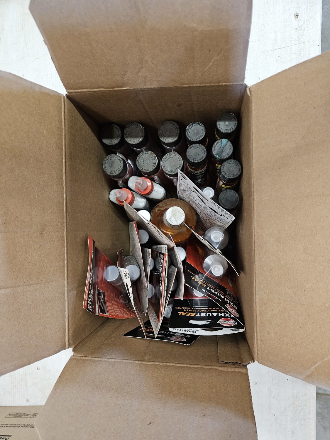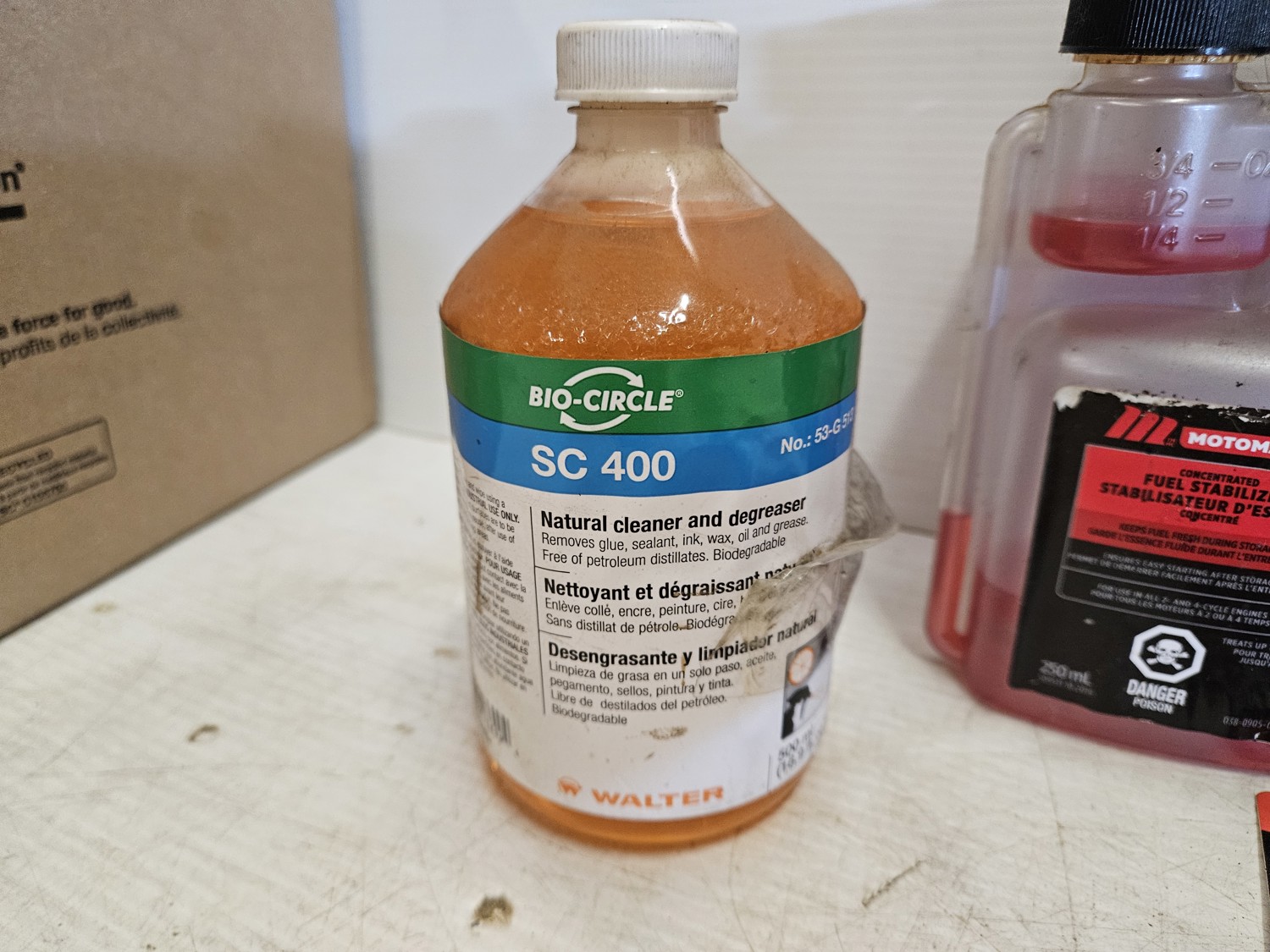 (1) Bio-circle cleaner and degreaser, (3) Motomaster fuel stabilizer, (9) Loctite anti-seize stick, (2) WeldBond adhesive, (1) star tron stabilizer, (6) versachem joint and crack sealer