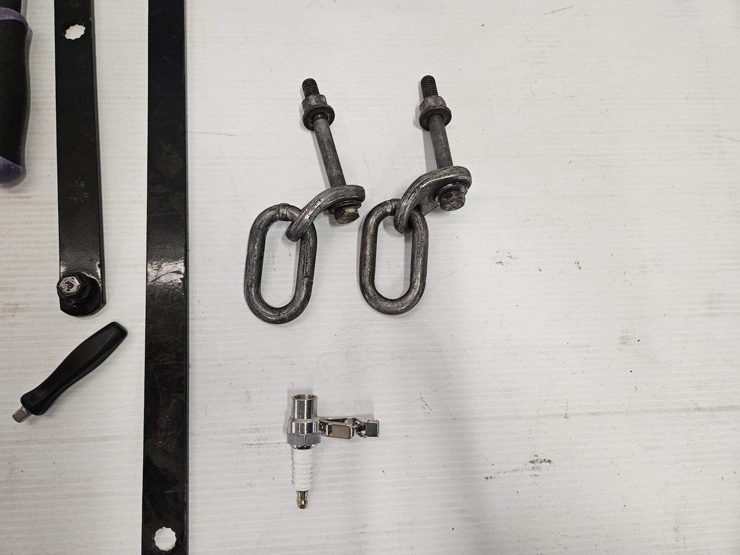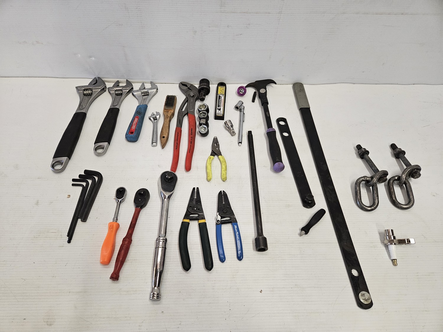 (4) socket wrenches 3/8 inch & 1/2 inch (3) wire strippers/cutters (4) allen keys, (2) socket extensions (1) spinning socket extension (1) wire brush (1) spark plug (1) tire pressure gauge (1) pry bar/claw