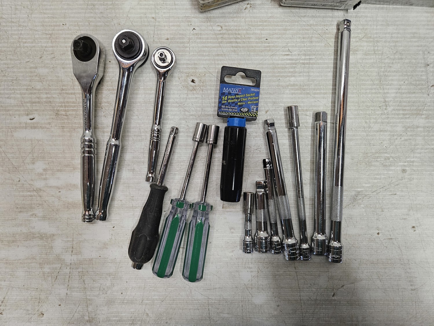 (9) tape measures, (5) unused safety glasses, (3) socket wrenches, (7) socket extensions, (2) mallet/hammer, (4) handles