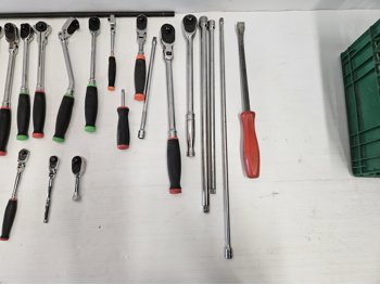Qty of (1) flexible LED flashlight, (1) socket screwdriver, (6) pry bars/trim removal tools, (13) socket wrenches 1/4 inch 3/8 inch 1/2 inch sizes, (6) socket extensions, (6) spinning socket extensions