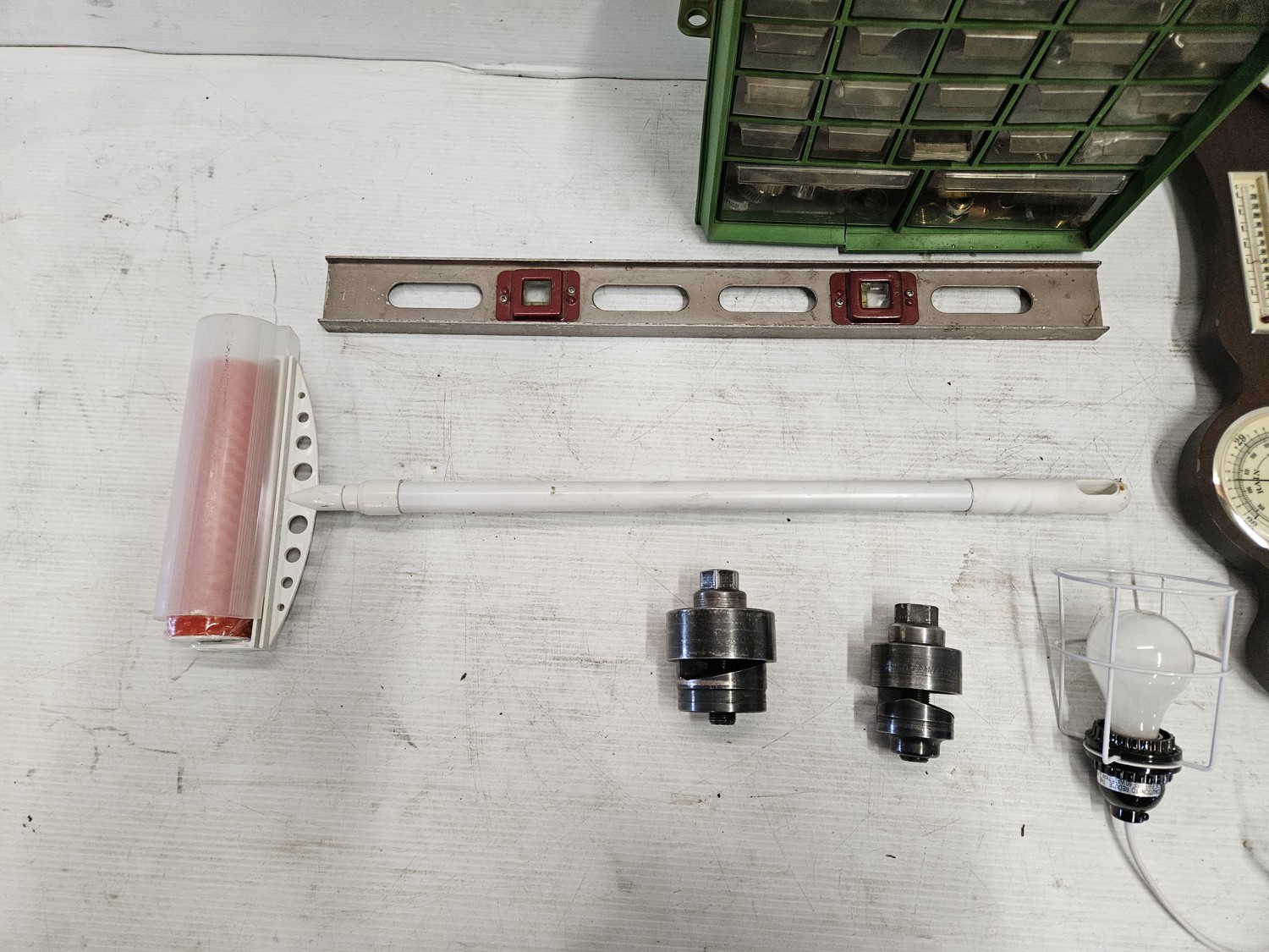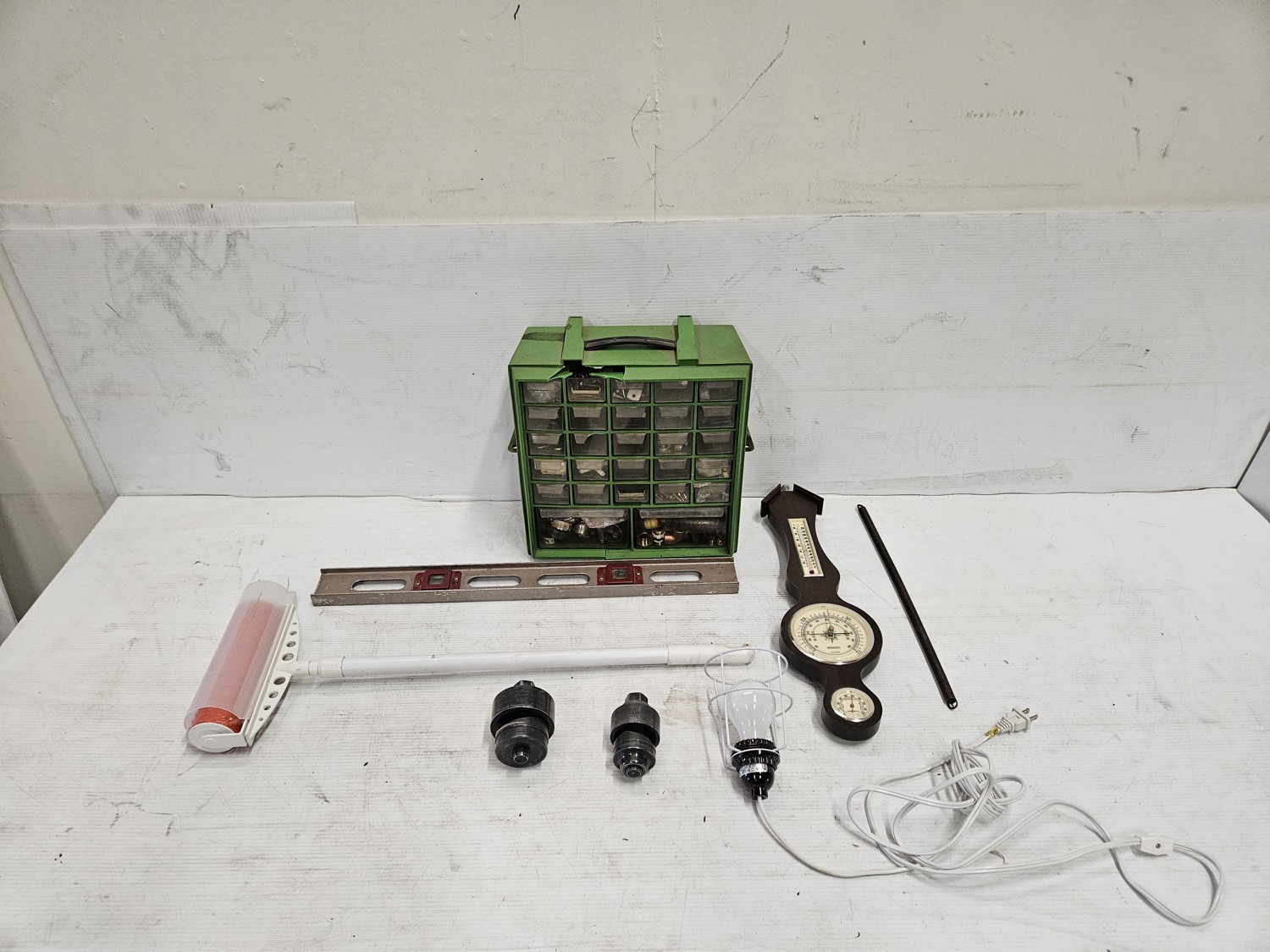 (1) 24 inch level (1) paint roller (1) light (1) vintage barometer