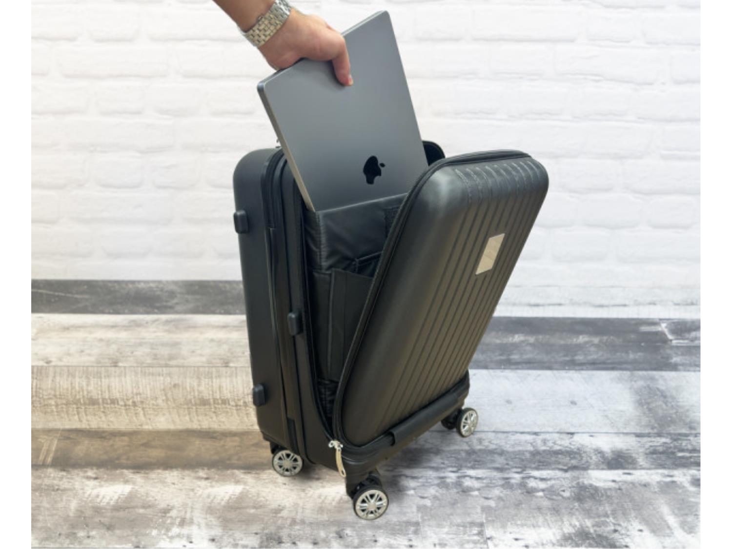 Textured ABS molded design, 180 degree front zipper pocket for laptop (15.6”),