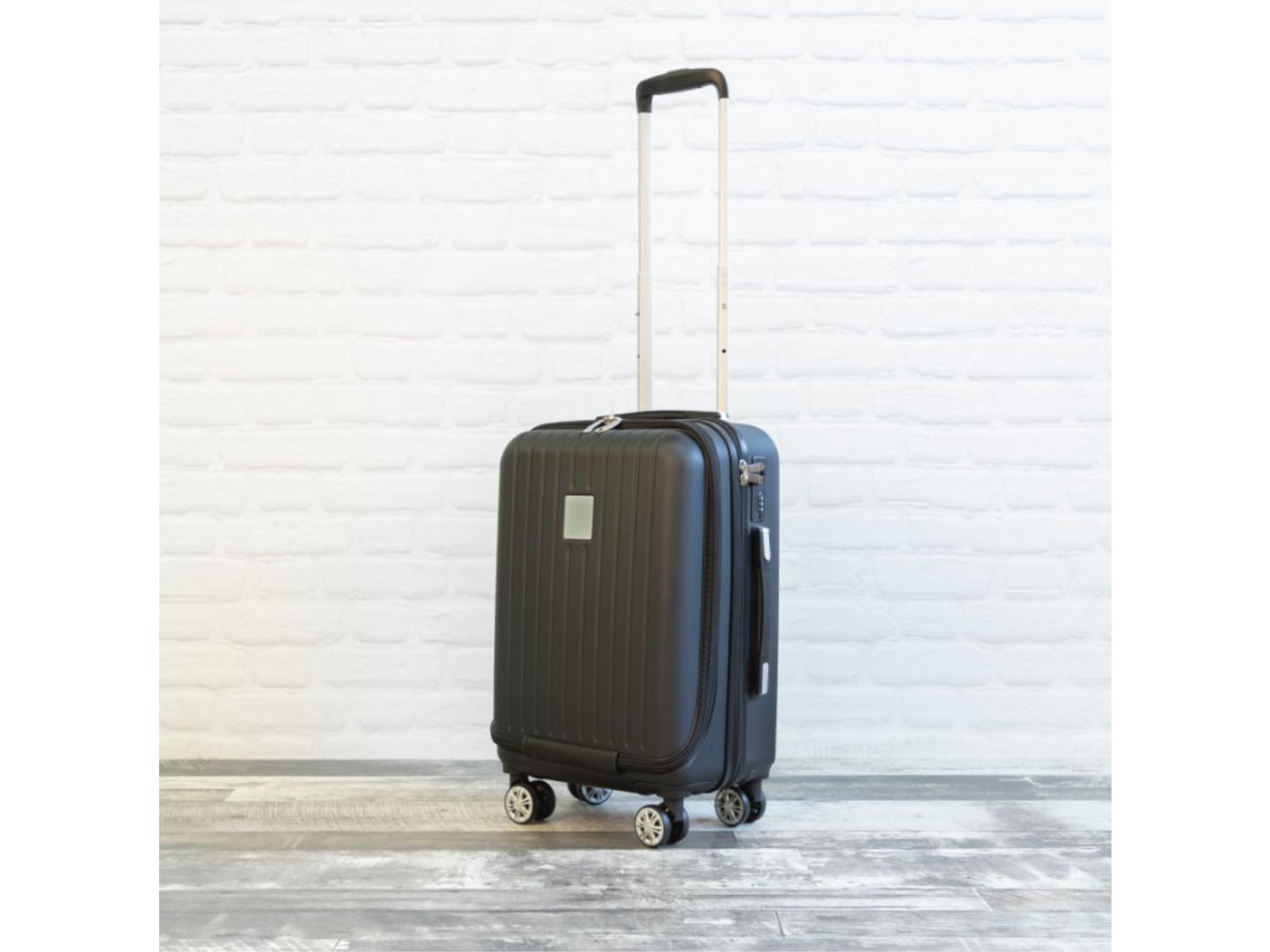 Textured ABS molded design, 180 degree front zipper pocket for laptop (15.6”), Ipad sleeve, 4 dual wheel spinner, fully recessed aluminum pullout handle, top and side ergonomic Gel grip handles, 1flex divider, clothing travel straps, 21” x 14” x 9” (carry on)