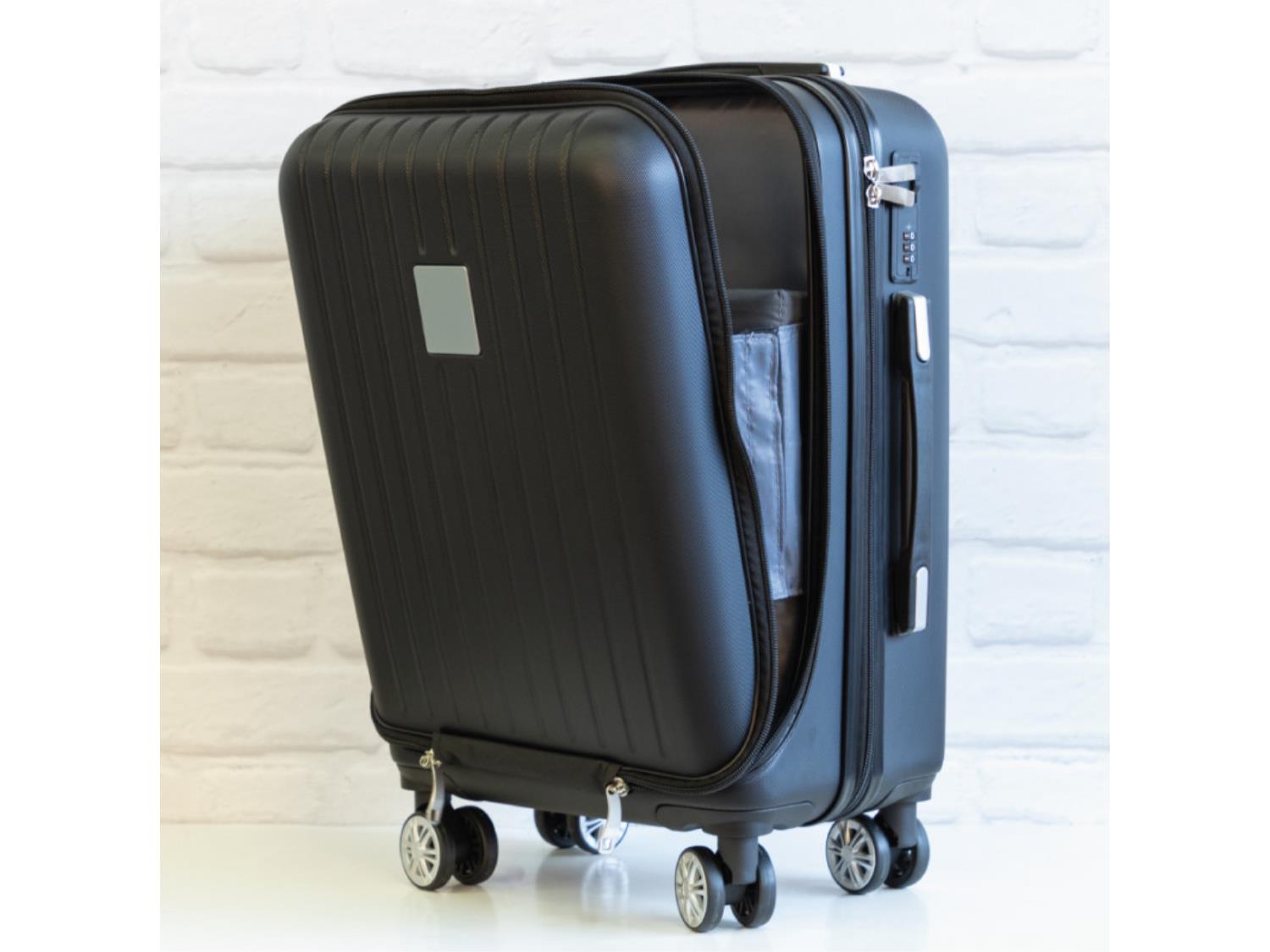 Textured ABS molded design, 180 degree front zipper pocket for laptop (15.6”), Ipad sleeve, 4 dual wheel spinner, fully recessed aluminum pullout handle, top and side ergonomic Gel grip handles, 1flex divider, clothing travel straps, 21” x 14” x 9” (carry on)
