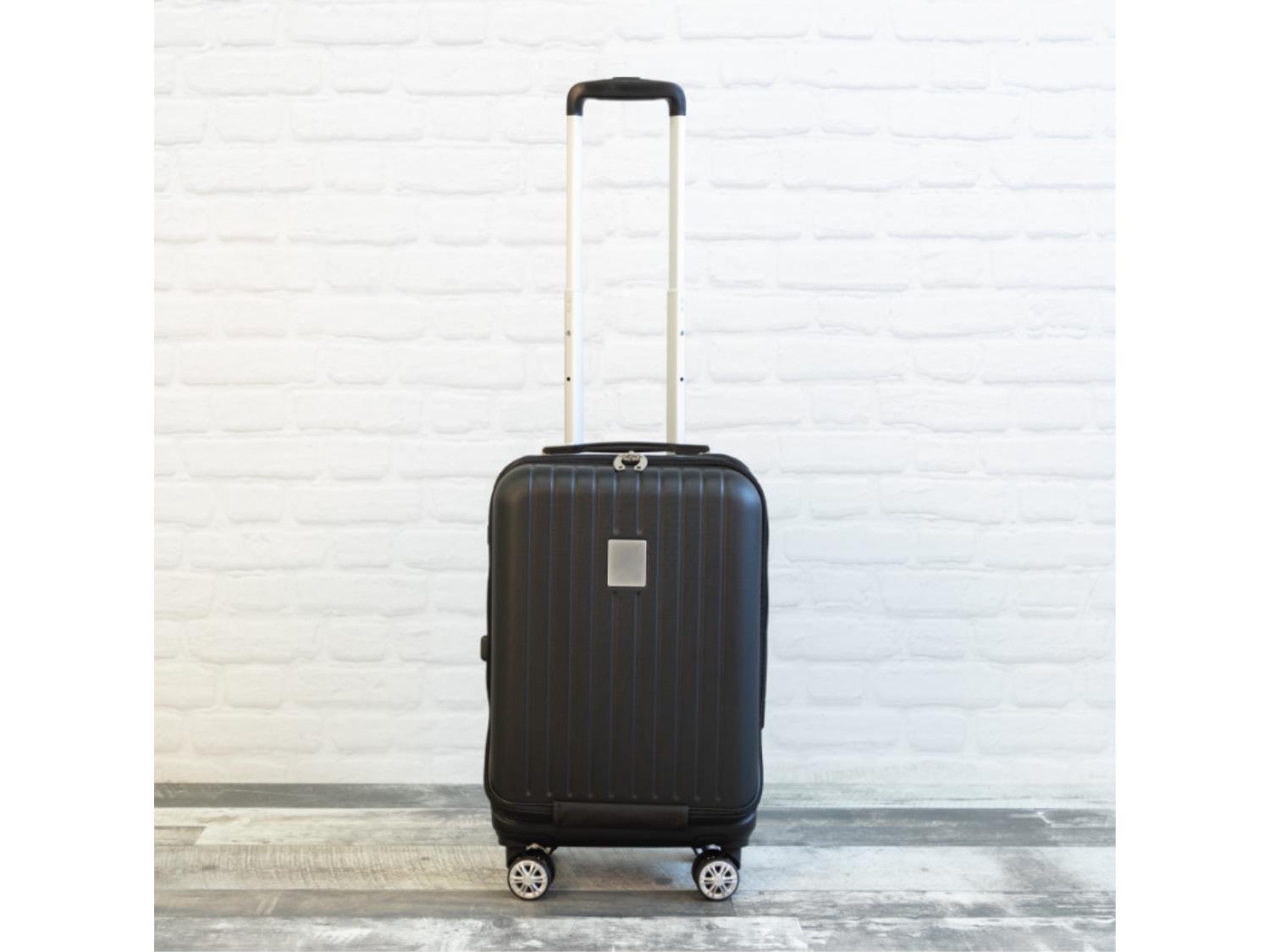 Textured ABS molded design, 180 degree front zipper pocket for laptop (15.6”), Ipad sleeve, 4 dual wheel spinner, fully recessed aluminum pullout handle, top and side ergonomic Gel grip handles, 1flex divider, clothing travel straps, 21” x 14” x 9” (carry on)