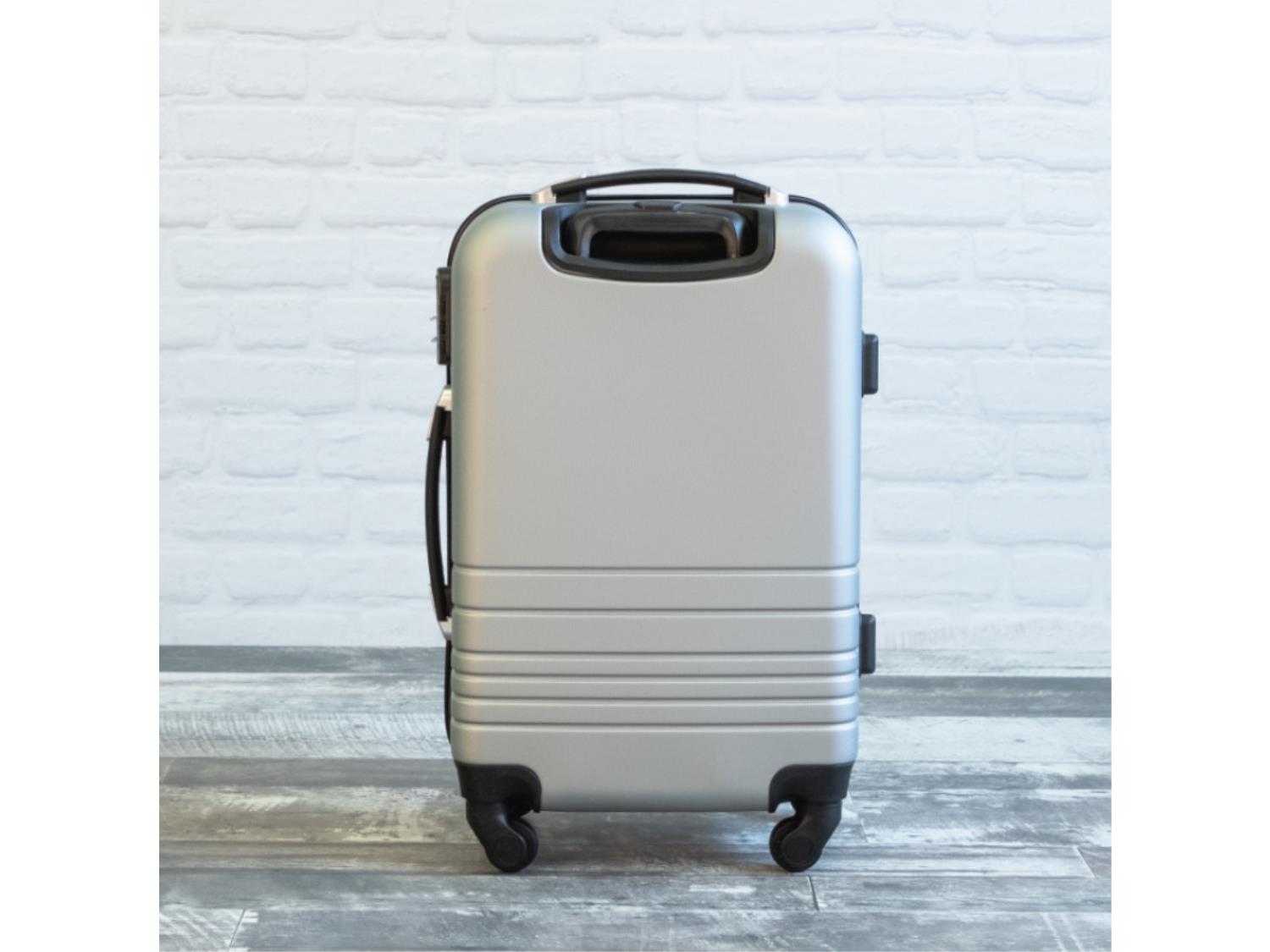 Textured ABS molded design, spinner wheels, fully recessed aluminum pullout handle, top carry handle with lock system, mesh & shoe pocket inside, clothing travel straps, inset metal plate 2.25” W x 1.285” H, 21” x 14” x 9 inch (carry on)