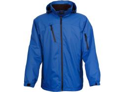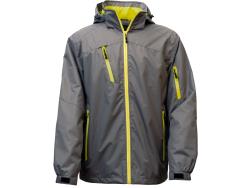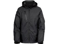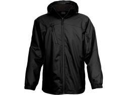 Style 710, 3 layer soft shell, 2 side and 1 left arm pocket, wind and water resistant, drop tail with draw string, rubber adjustable Velcro cuffs