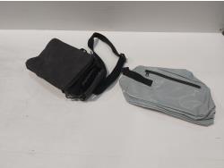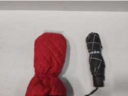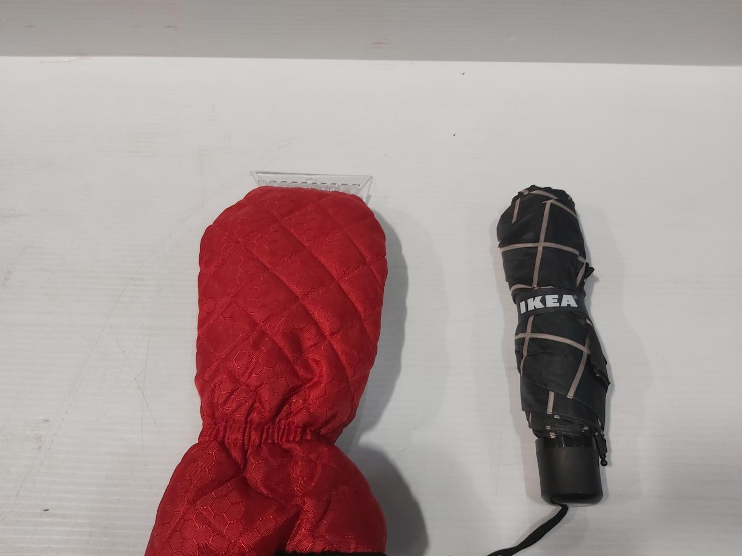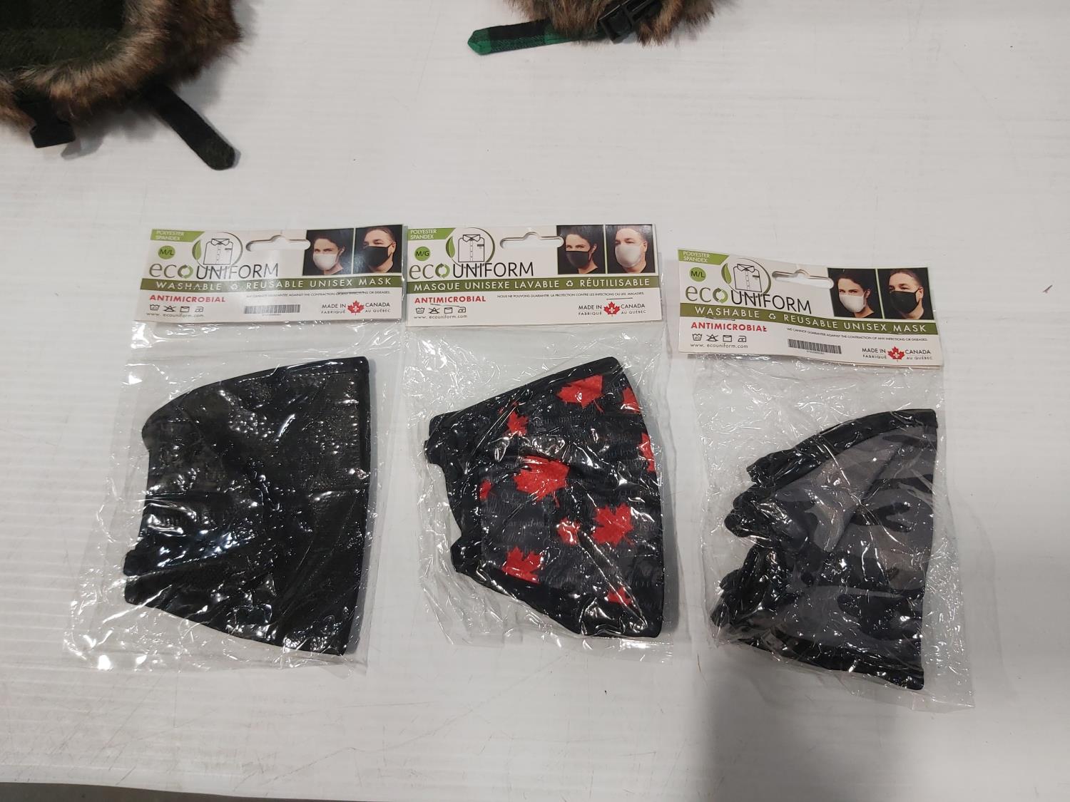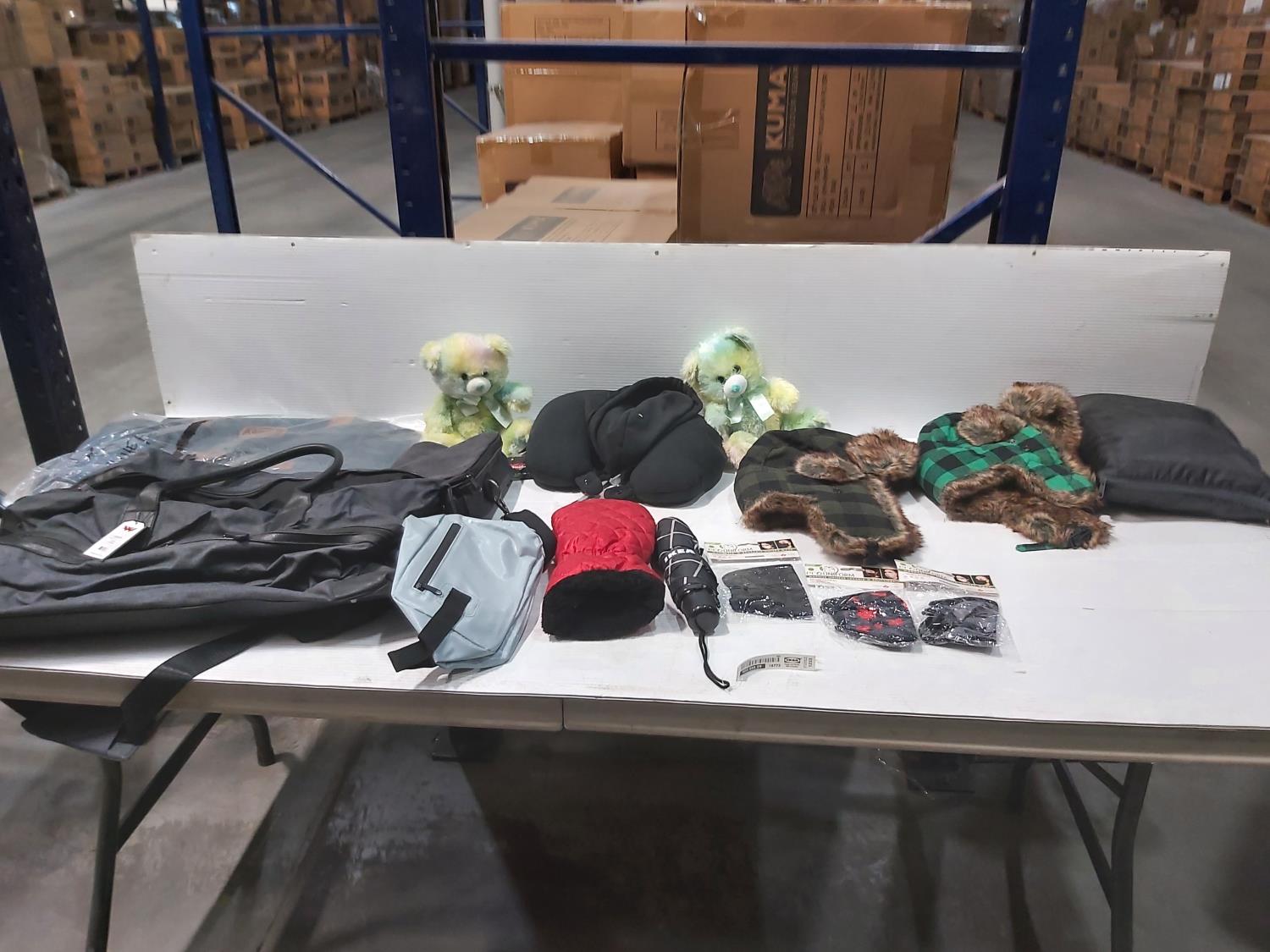 (3) reusable masks, (1) travel blanket, (2) winter hats, (1) umbrella, (1) Ice scraper mit, (2) soft toys, (1) hoodie pillow, (2) duffle bags, were display items